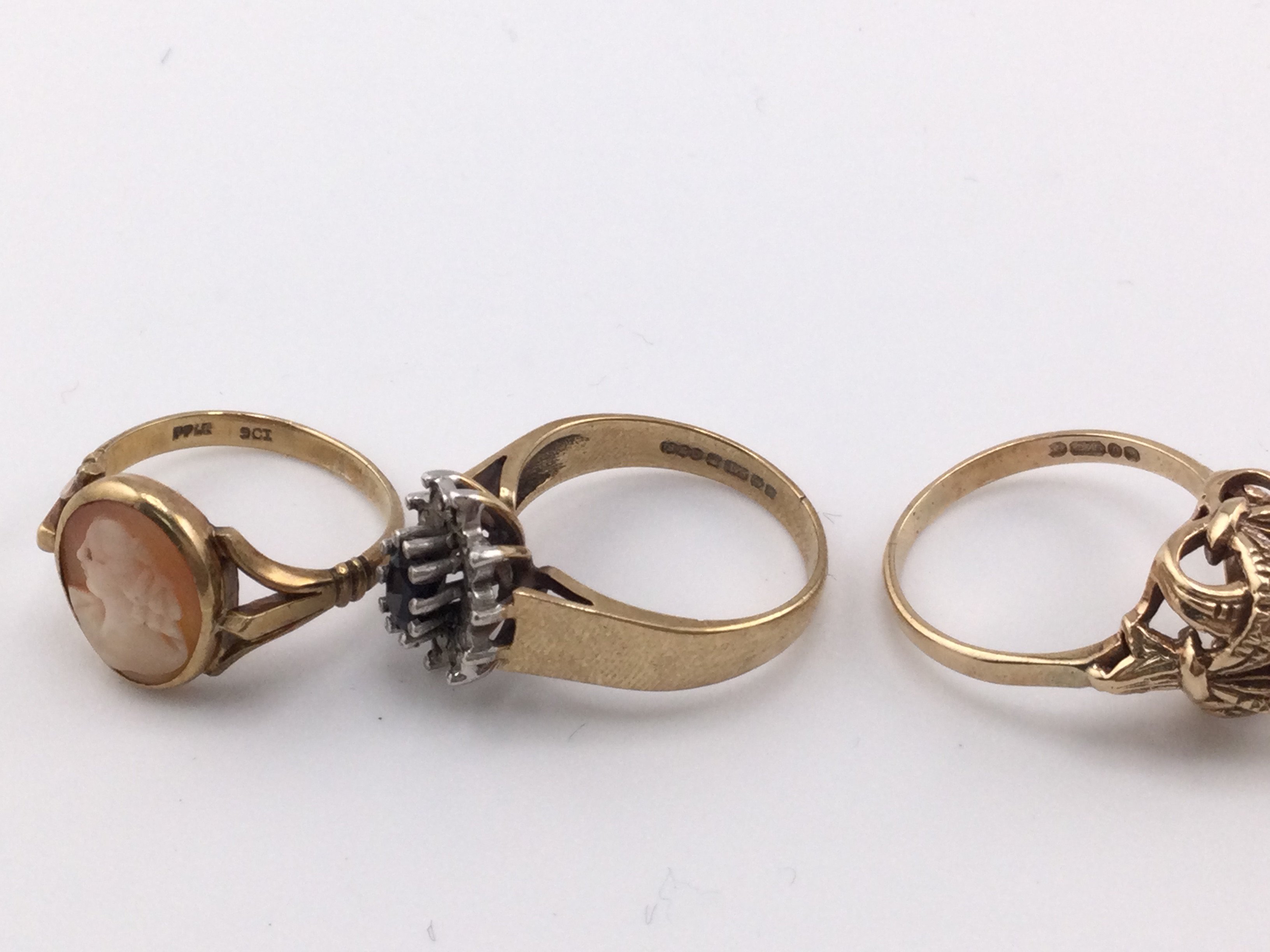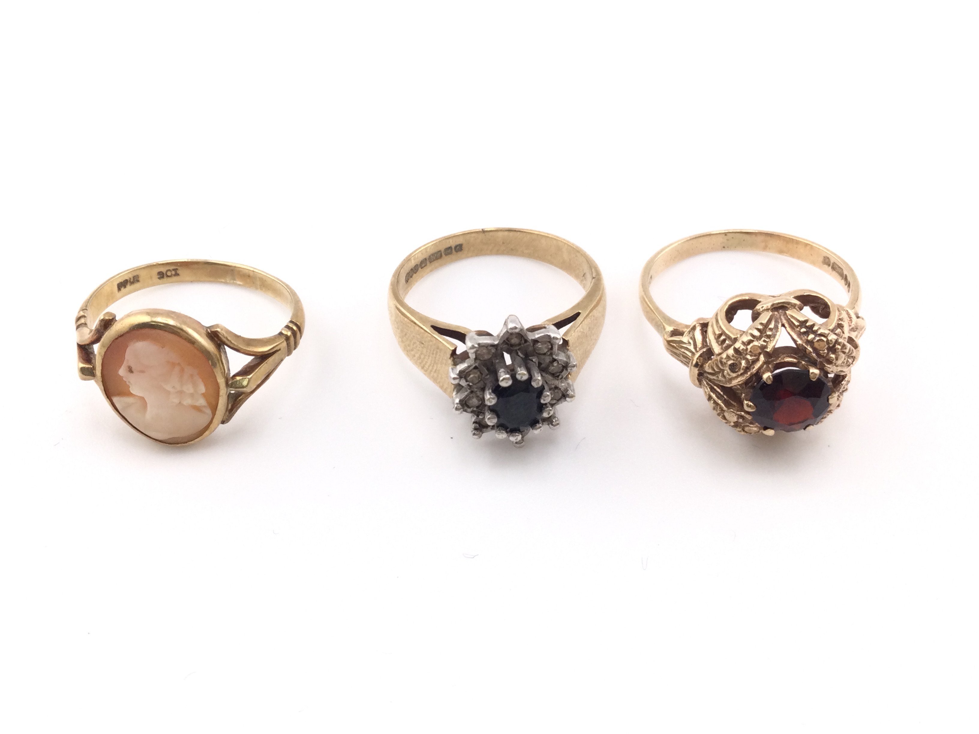 Three 9ct gold rings including a cameo ring a garnet ring and a sapphire and white stone ring. Sizes M N and O (left to right). Total weight 10.74g