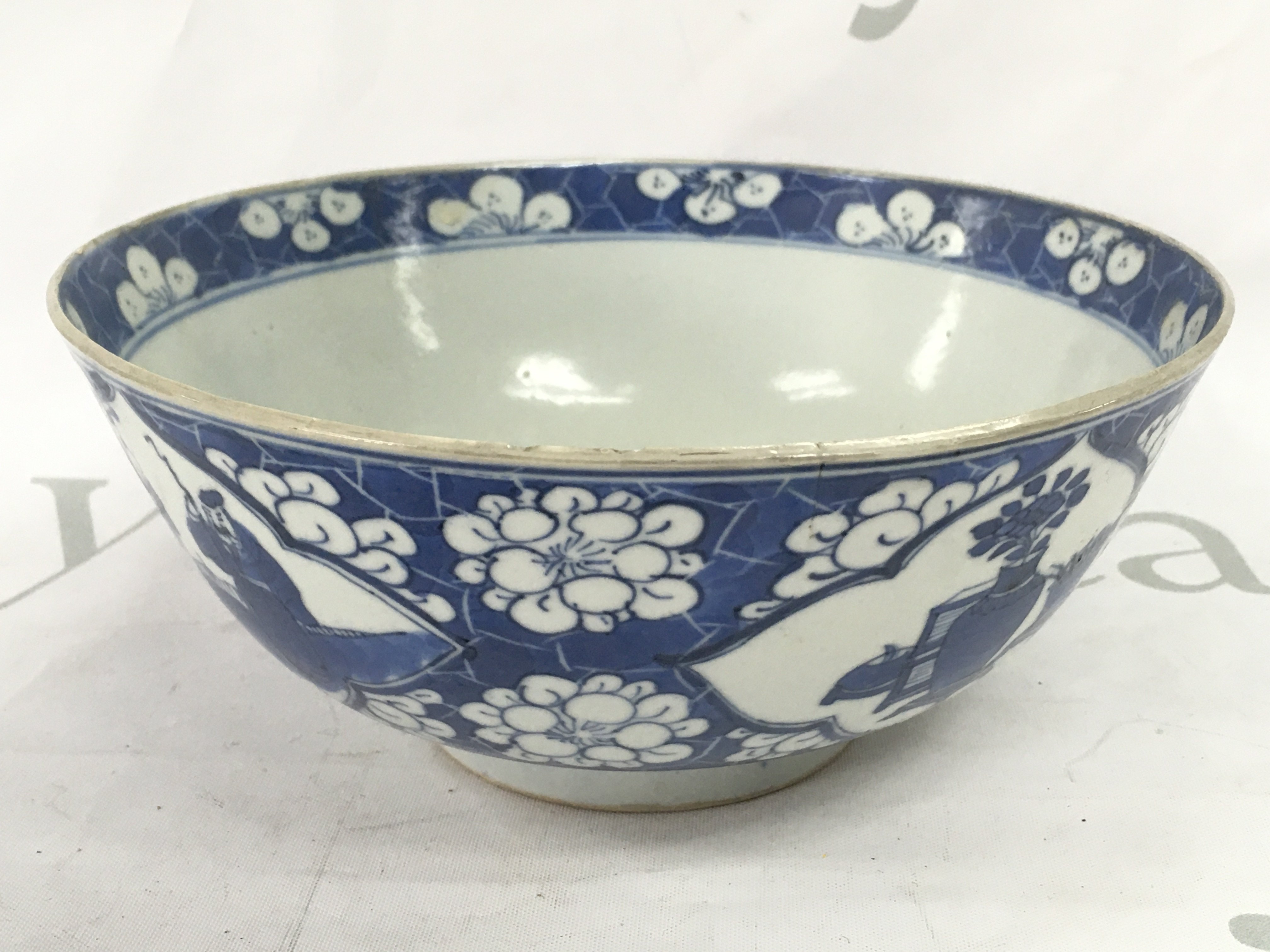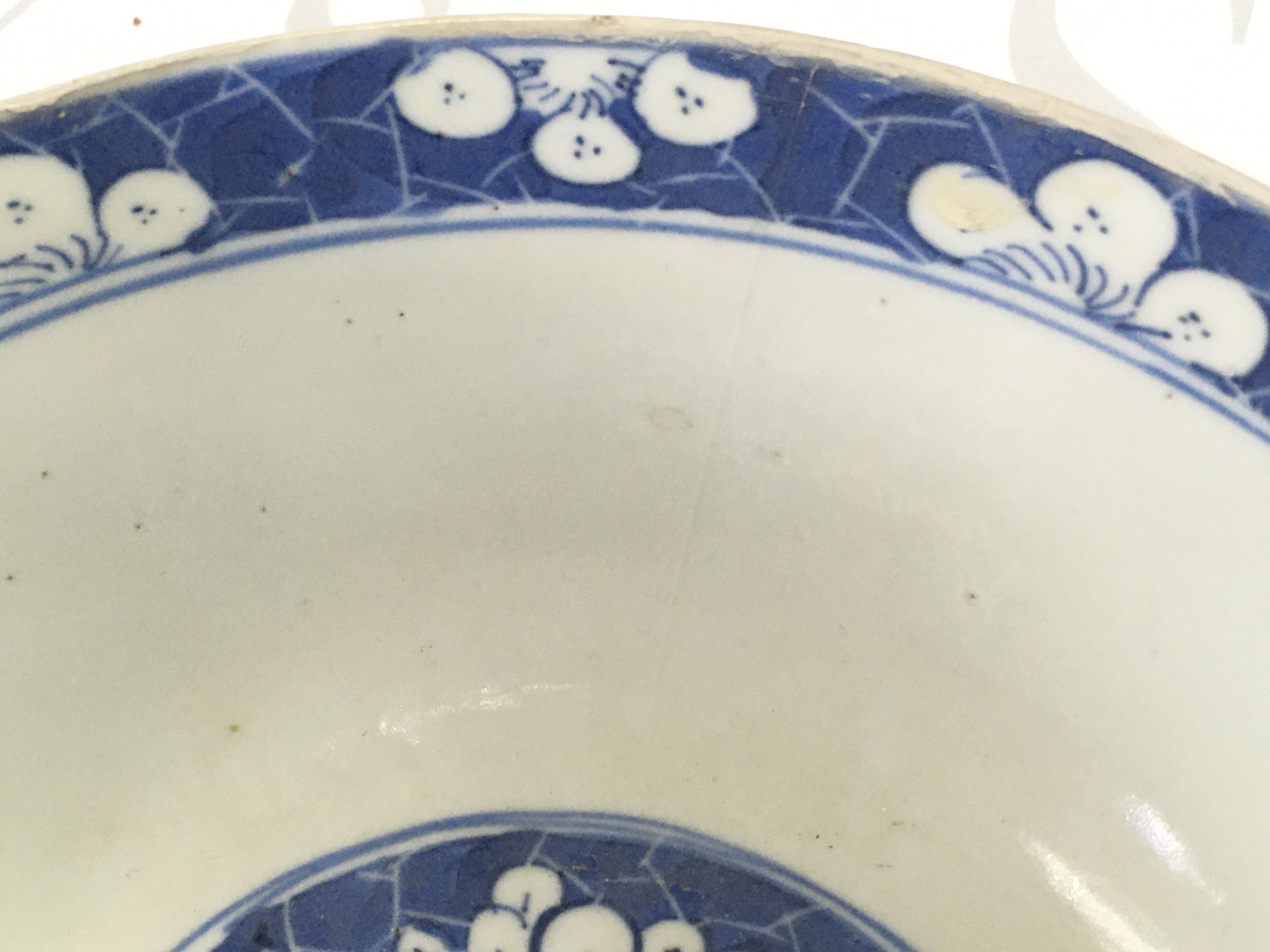 A 19th century Chinese blue and white bowl with a four character mark at the base, 18cm wide. Hairline crack seen and damage. This lot cannot be posted