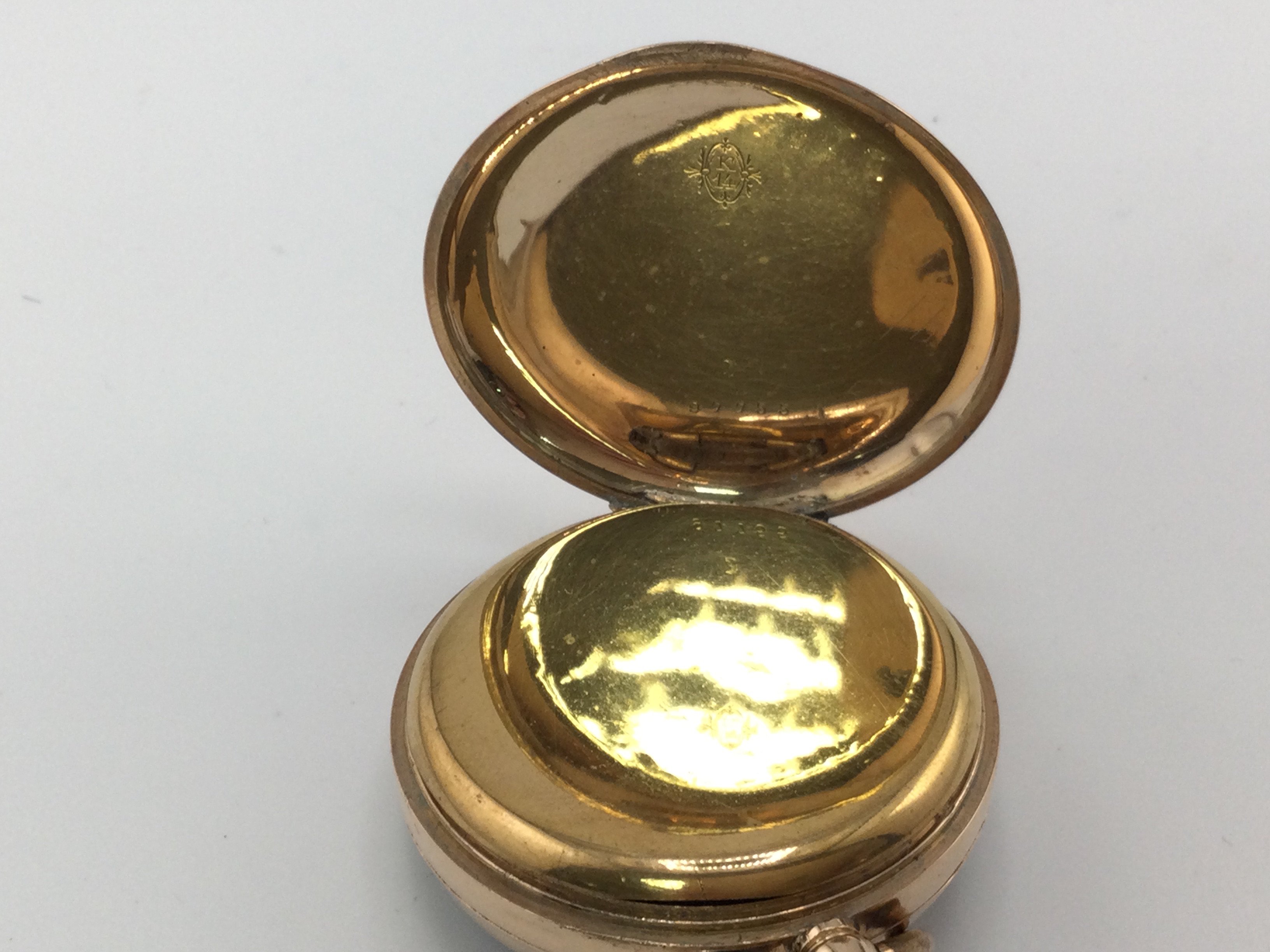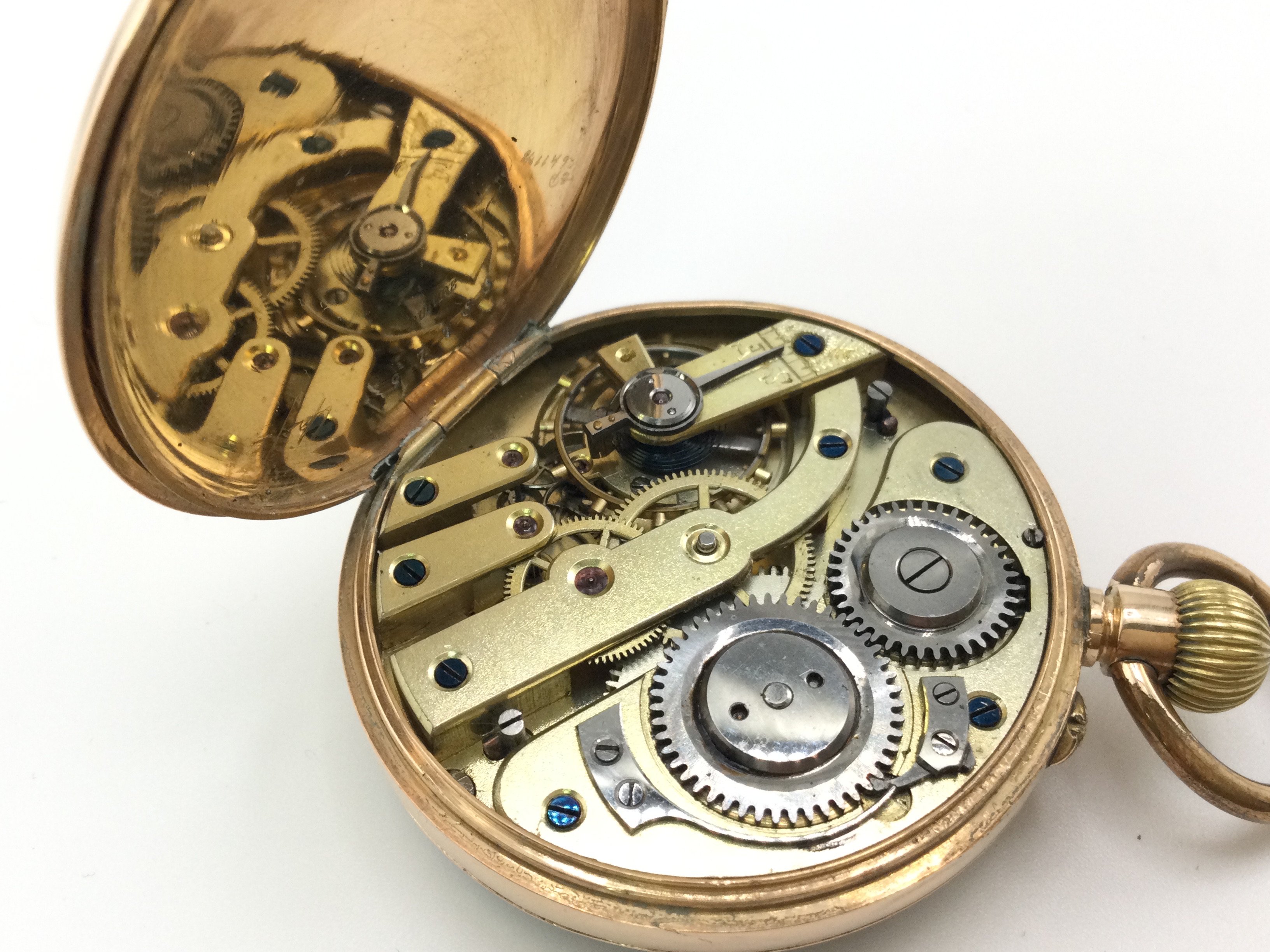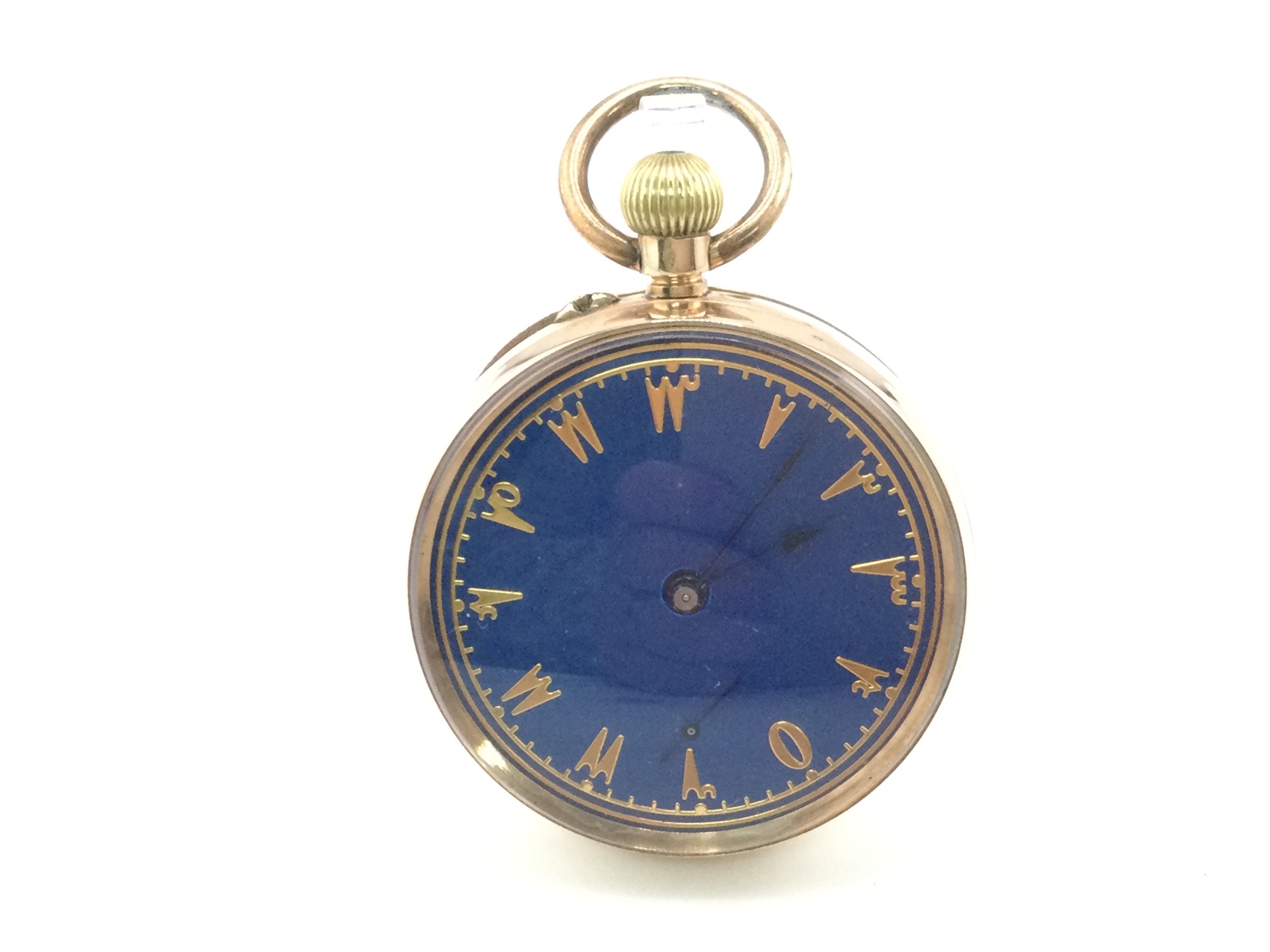 A 14ct outer case button wind pocket watch with blue dial. Approximately 45mm case.
