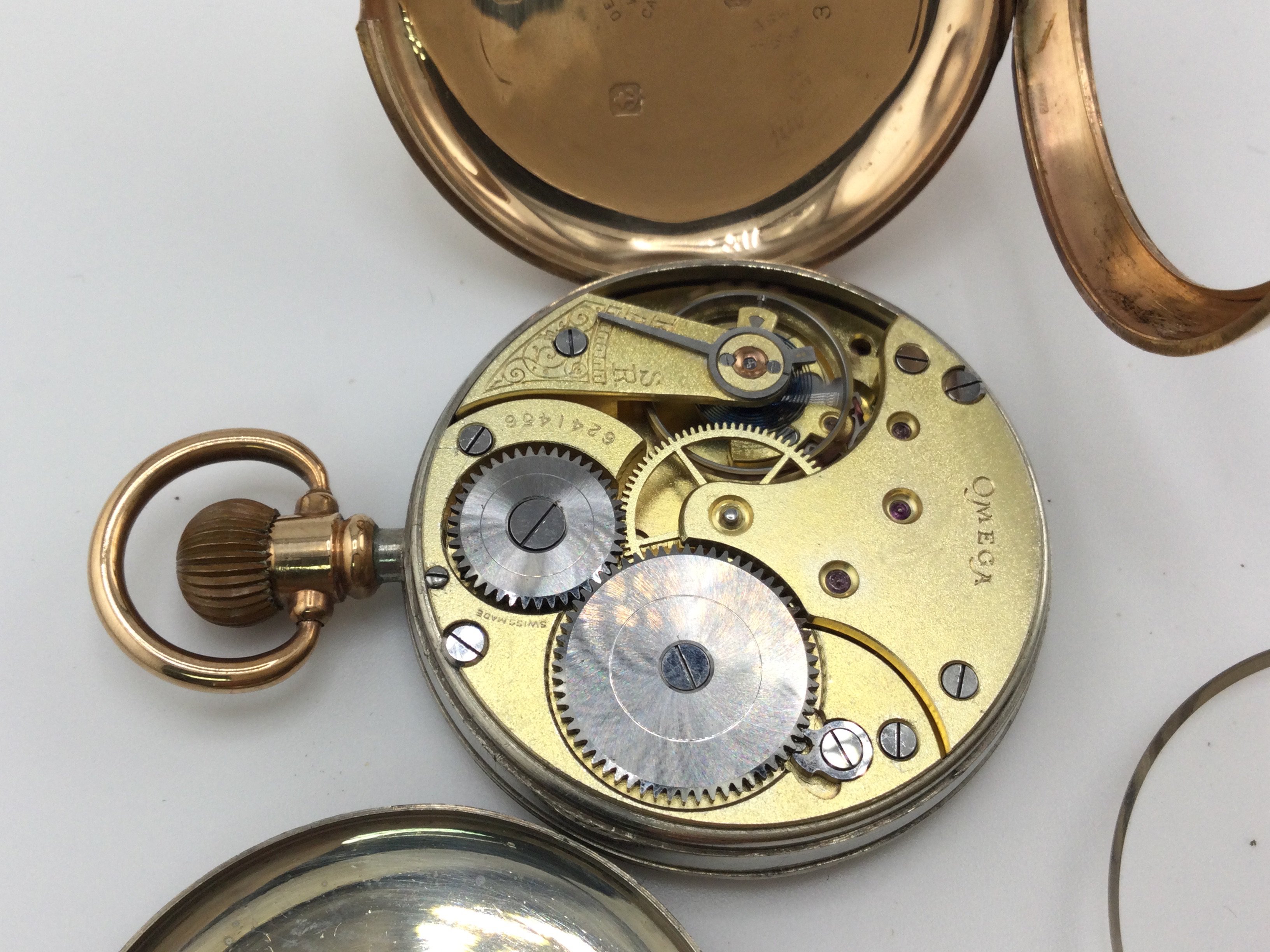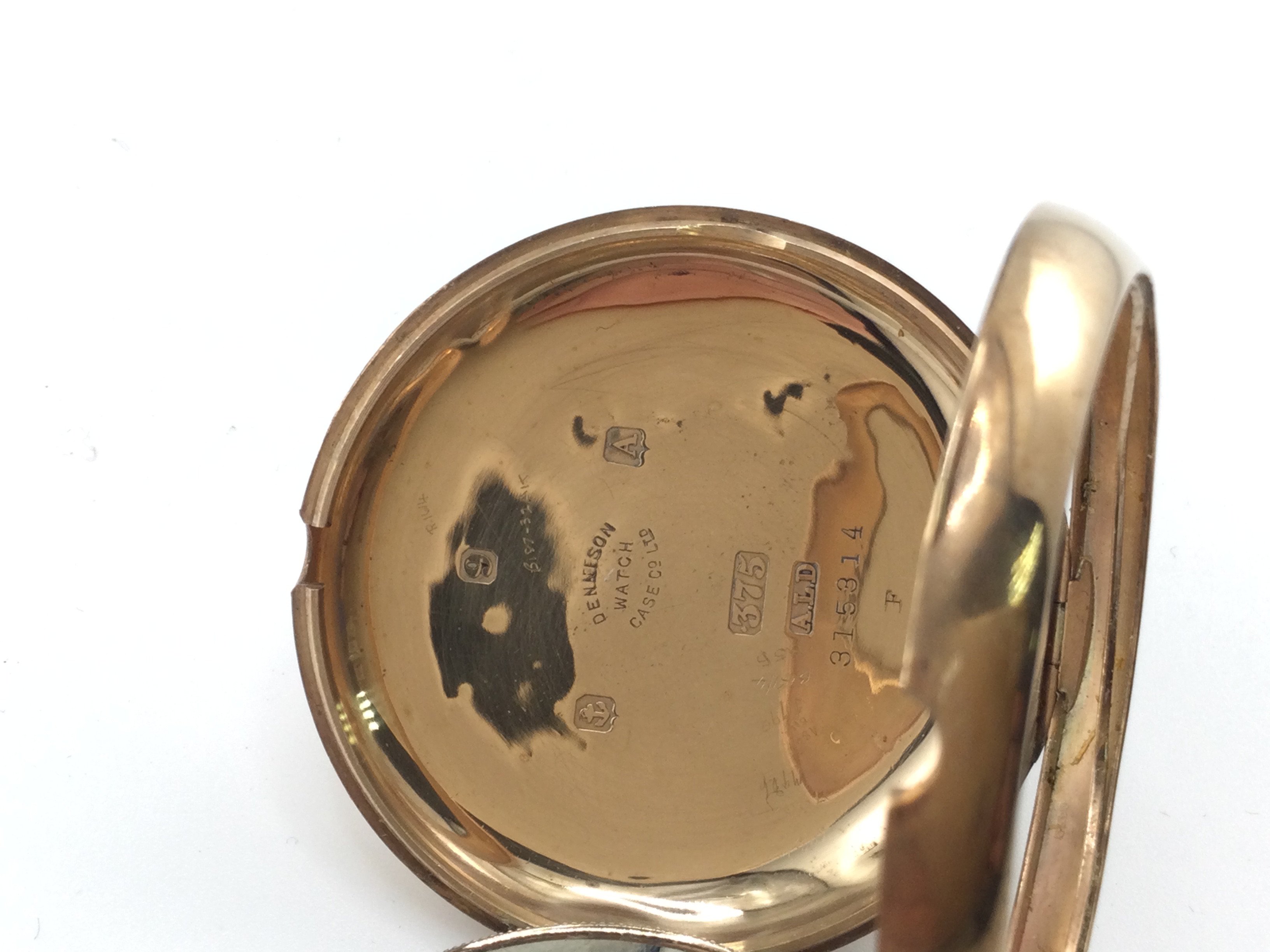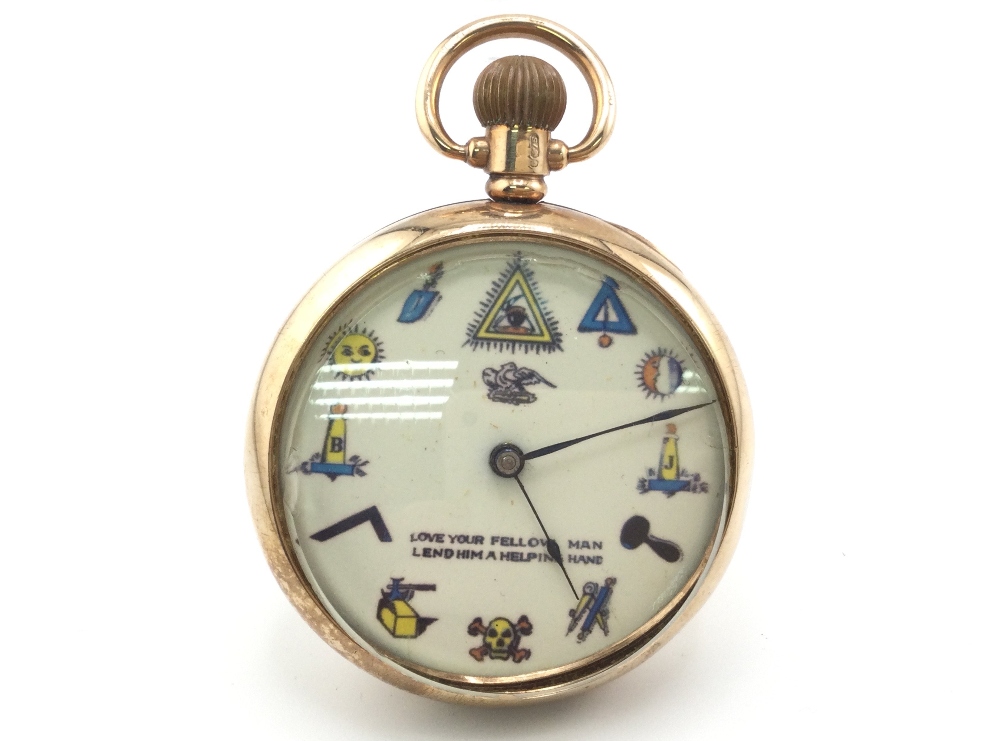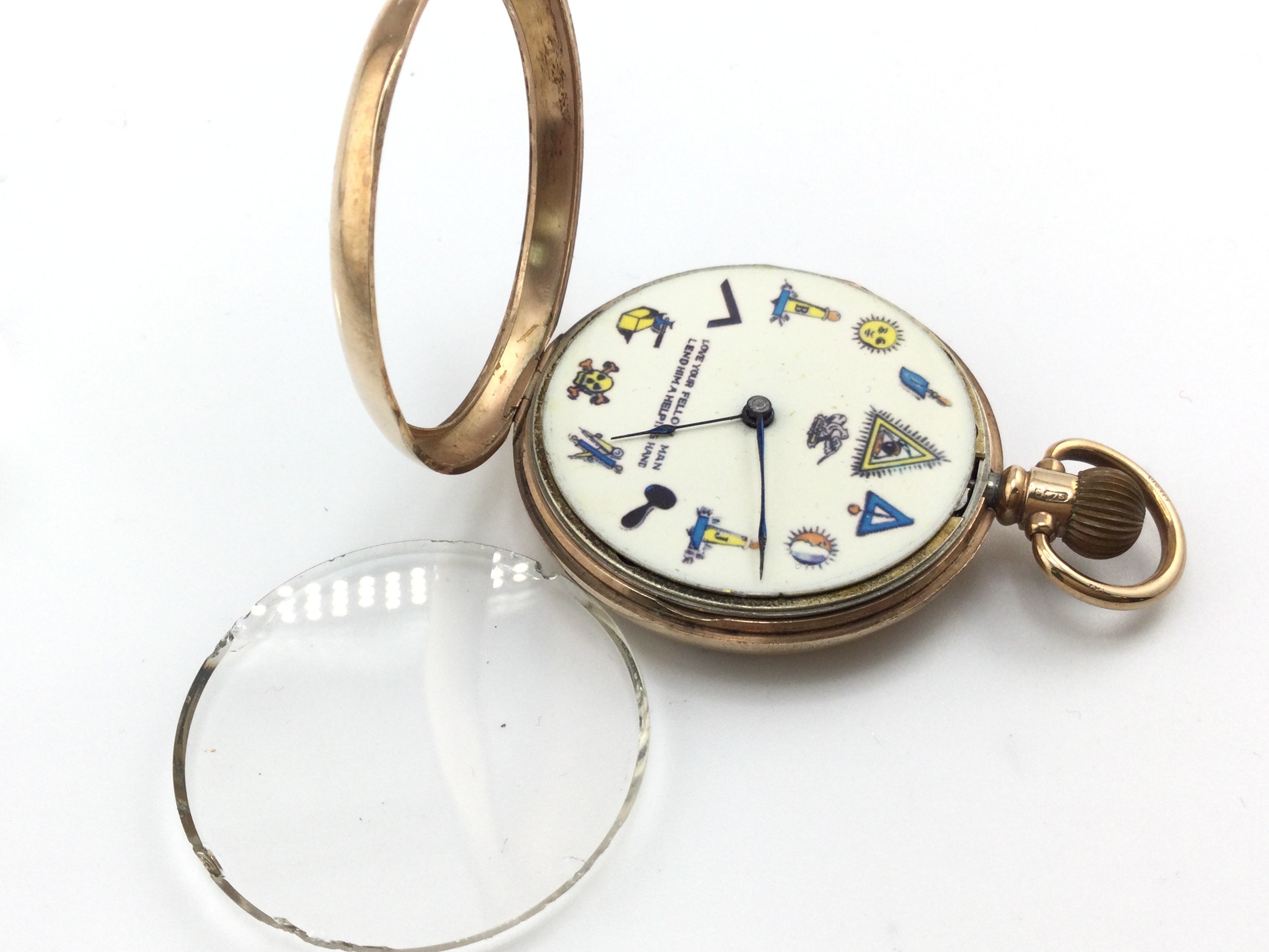 A 9ct gold pocket watch with Masonic dial. Seen running front glass needs fixing.