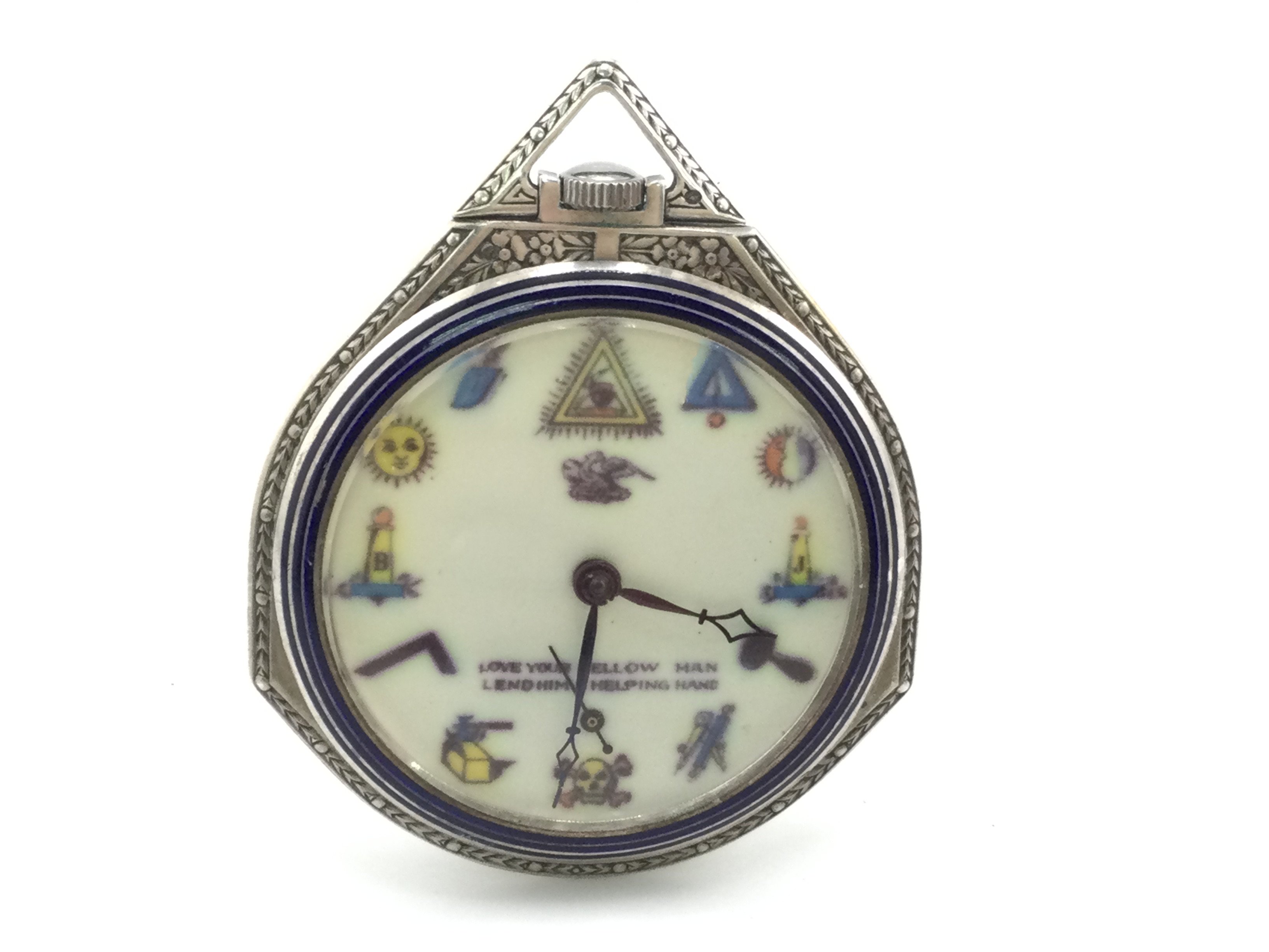 A white metal vase pocket watch with a Masonic dial. Approximately 45mm case.