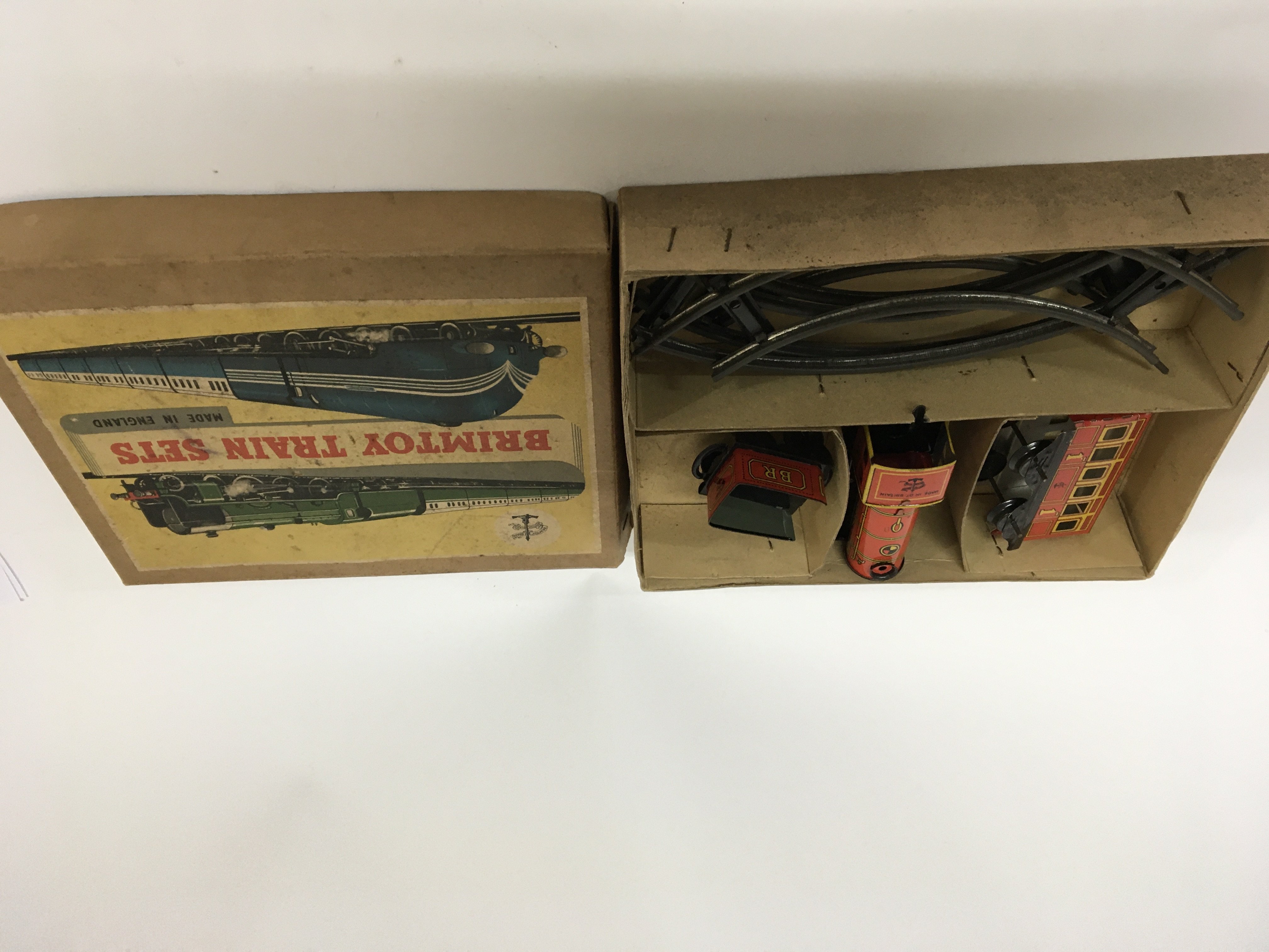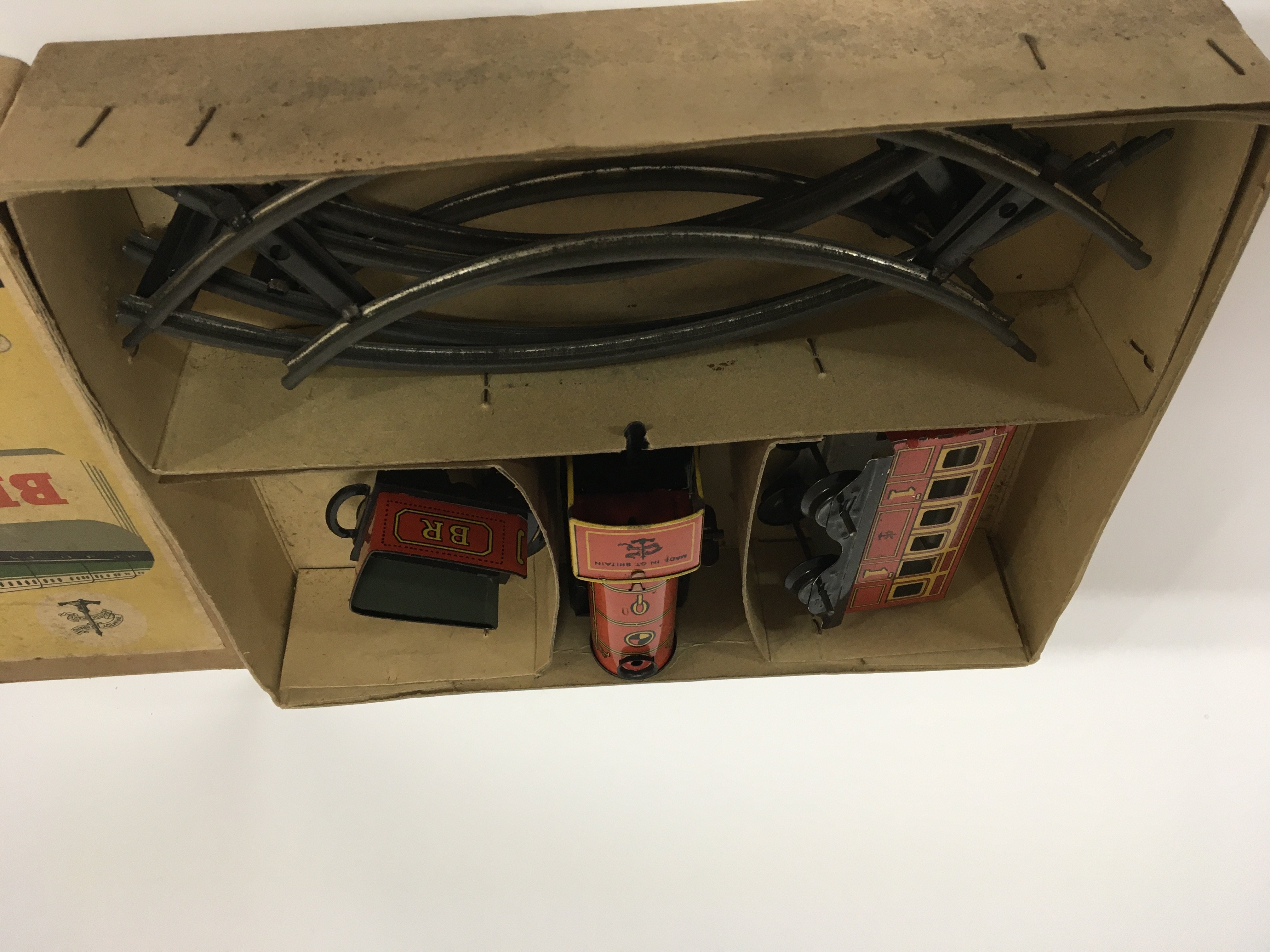A Vintage boxed Brimtoy tin plate clockwork train set in a fitted box. Very good condition. NO RESERVE