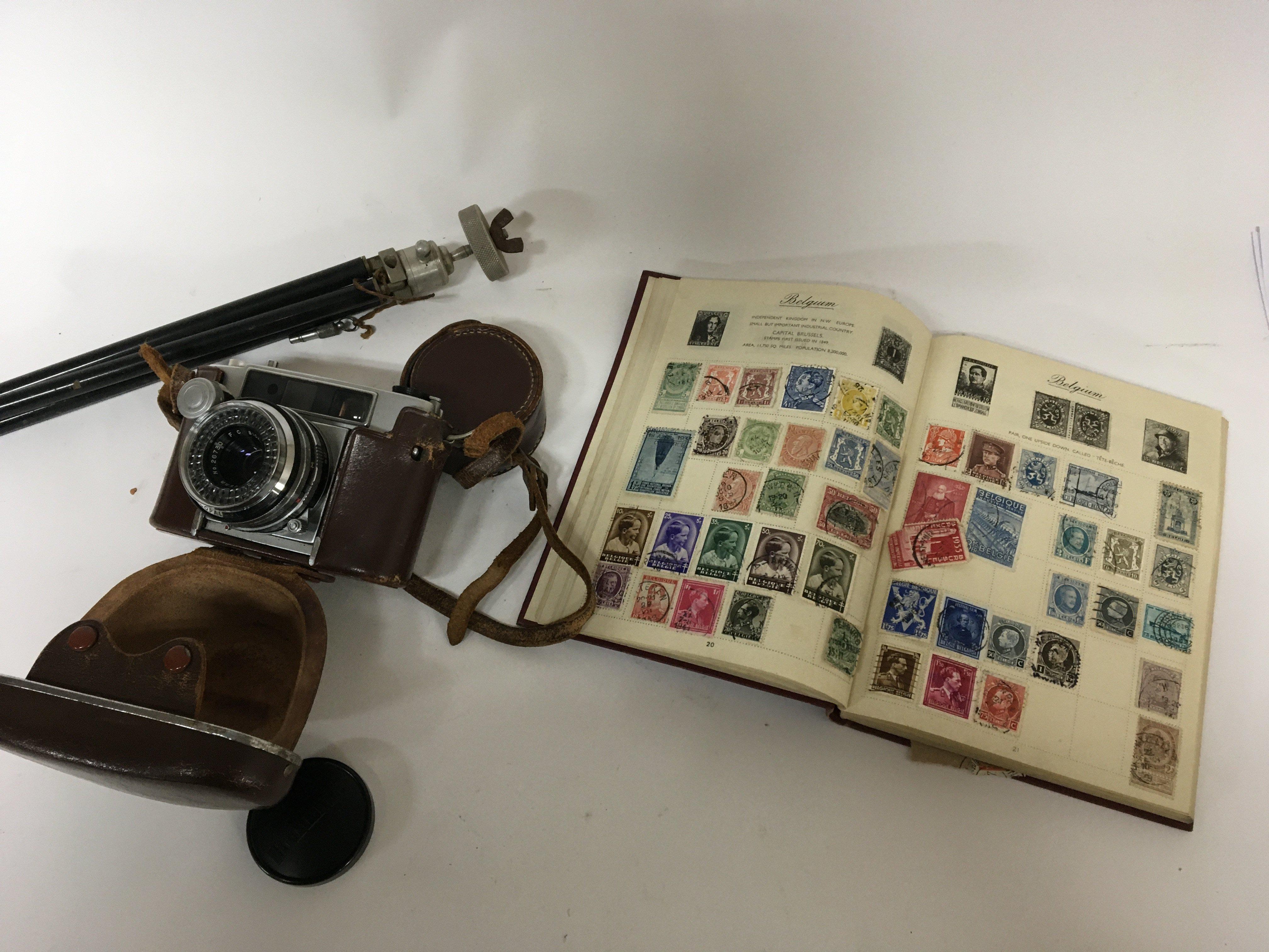 A stamp album containing world stamps The Postboy stamp album and a vintage camera a Japanese Beaumat serial number S11341. NO RESERVE