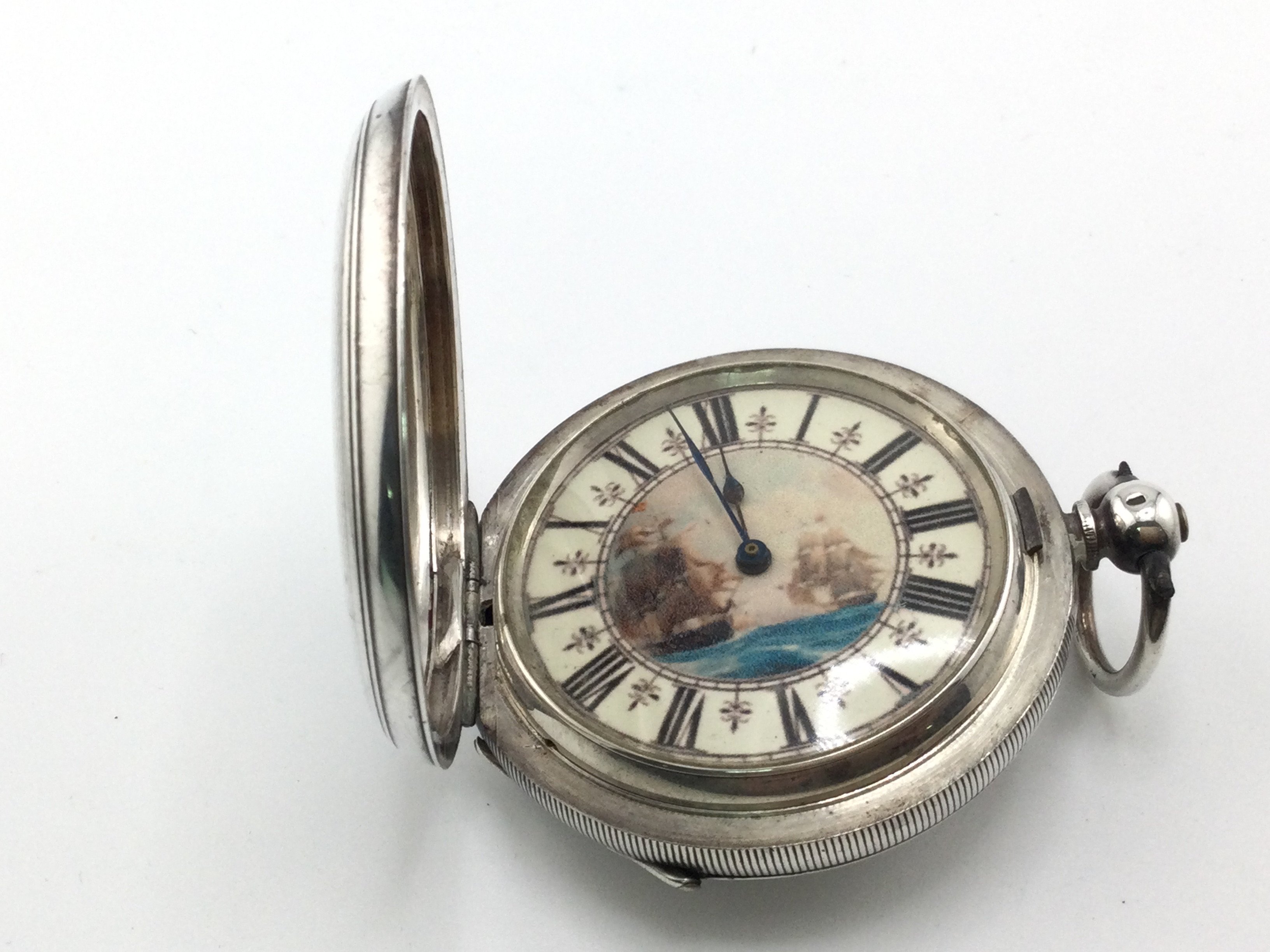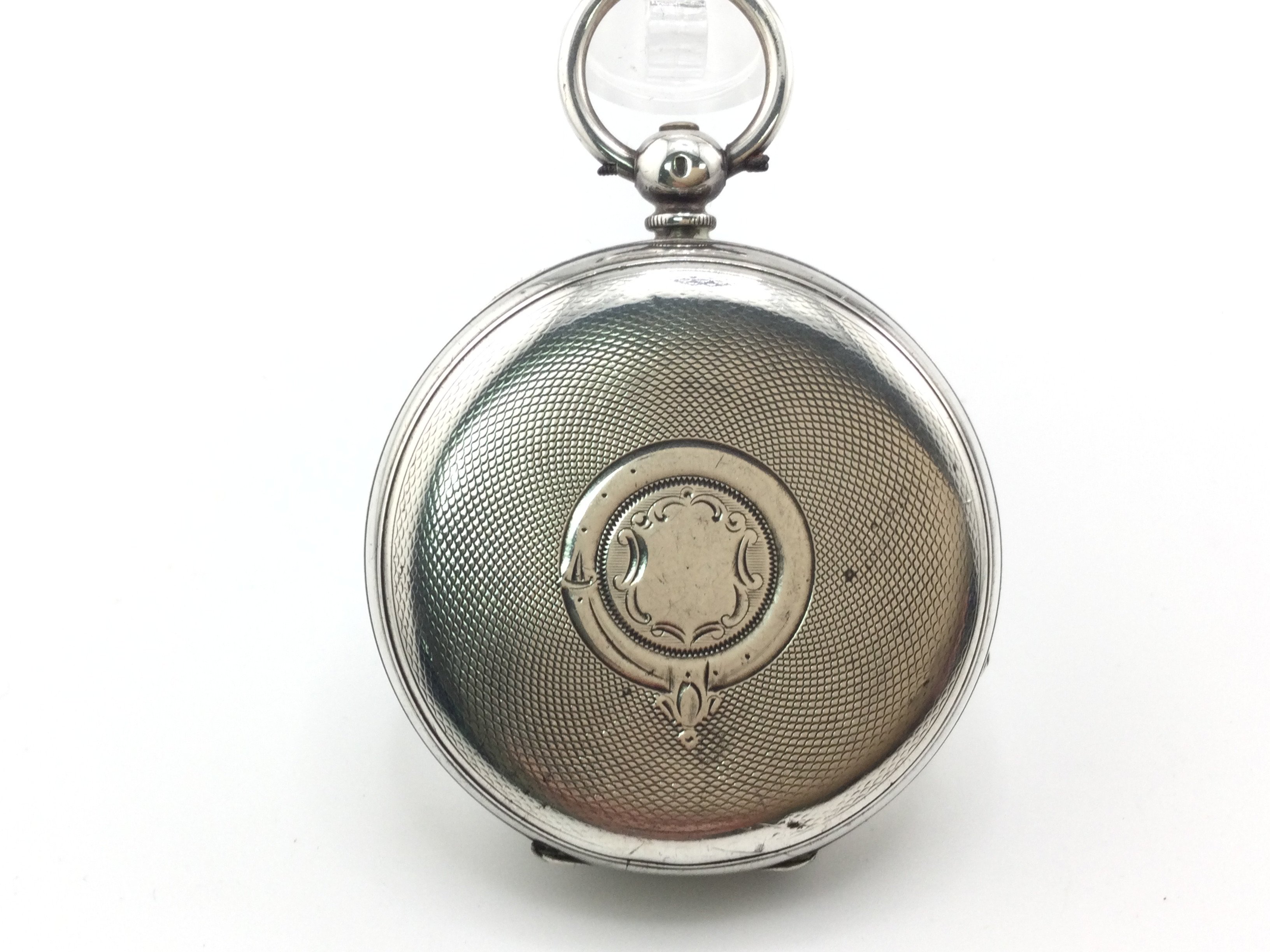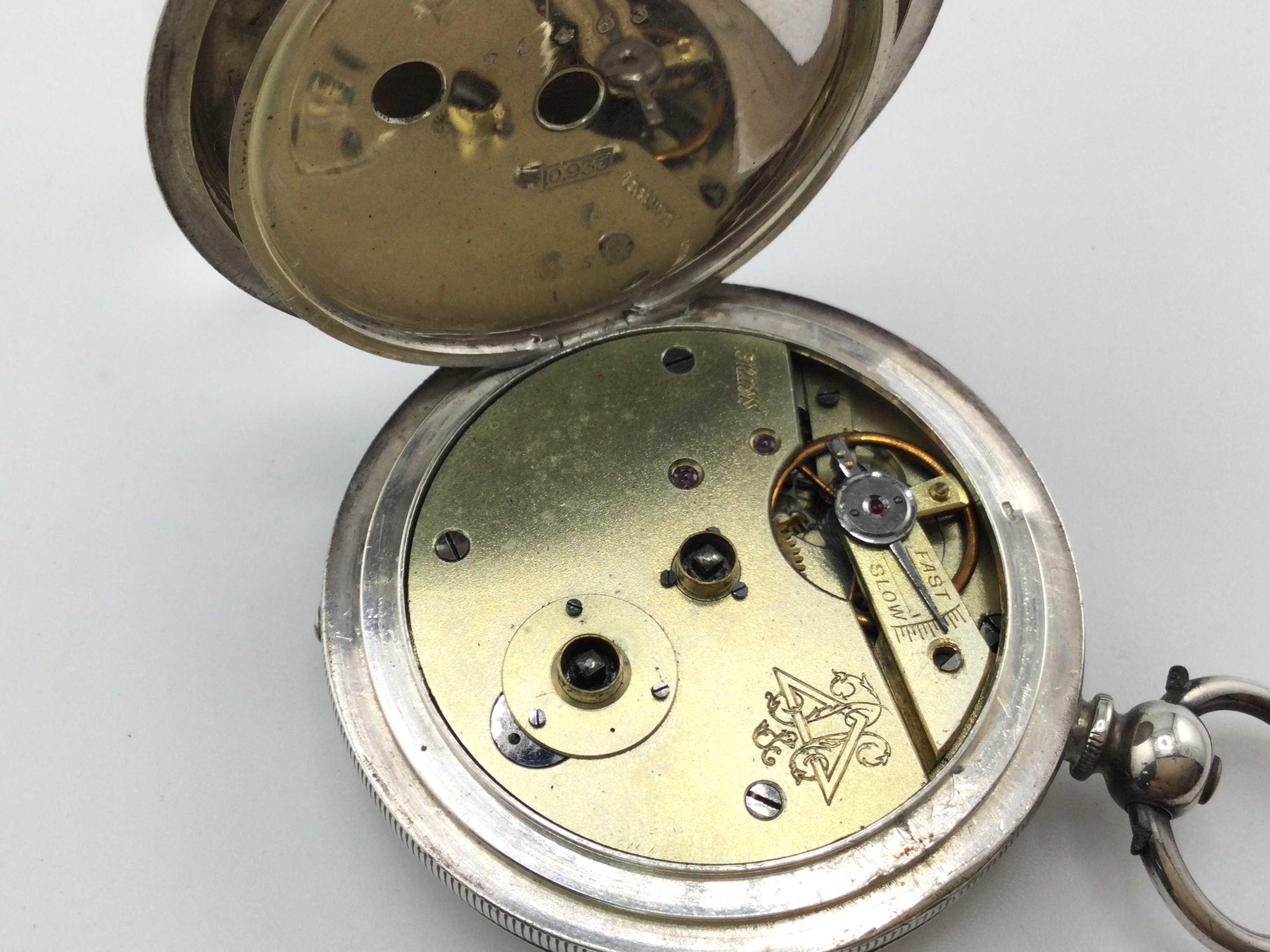 A .935 silver pocket watch. Winds and runs approximately 50mm case.
