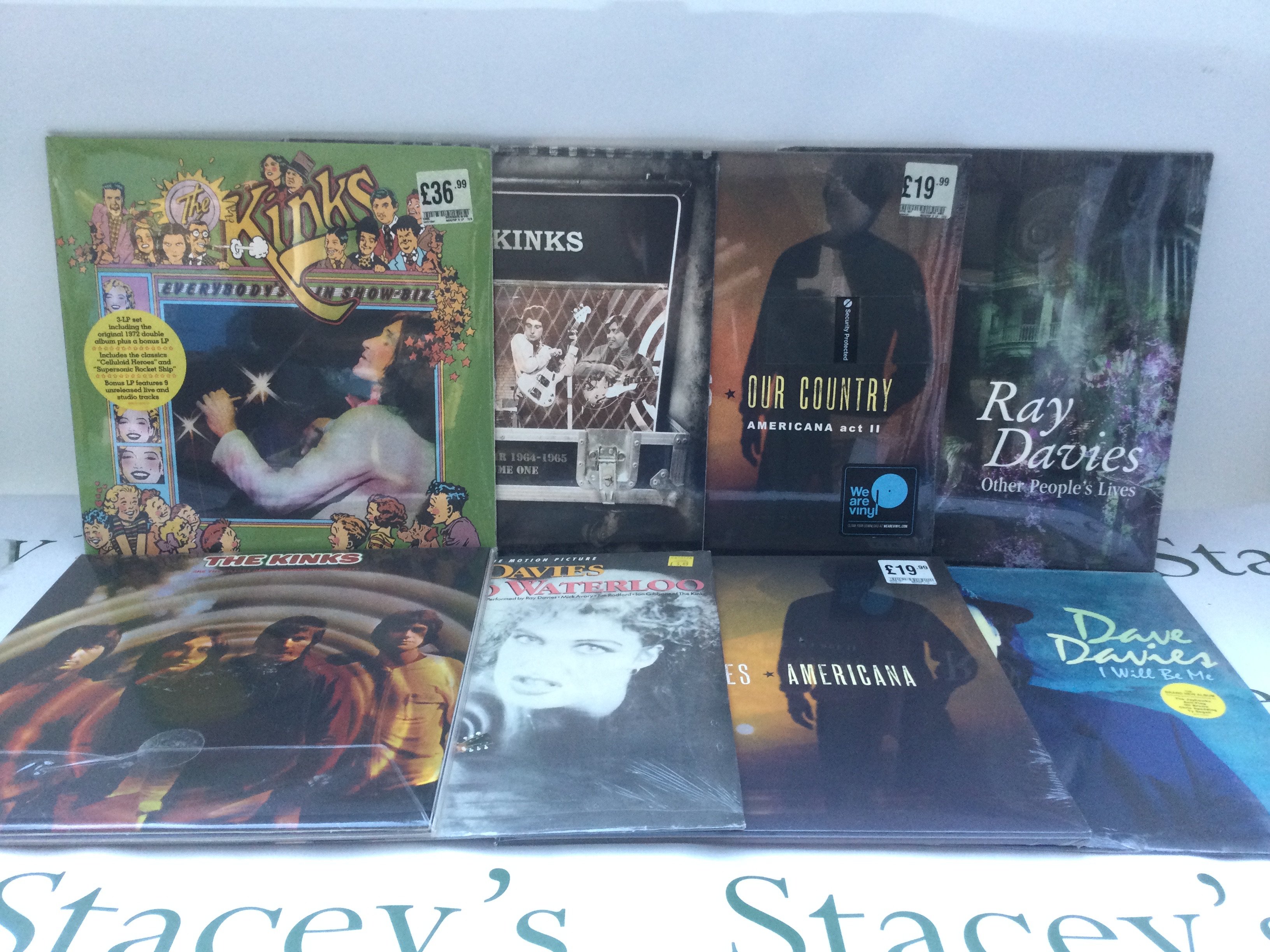 Eight Kinks and solo LPs comprising mainly sealed 180g pressings including 'Village Green Preservation Society', 'Americana', 'Everybody's In Showbiz' and others.