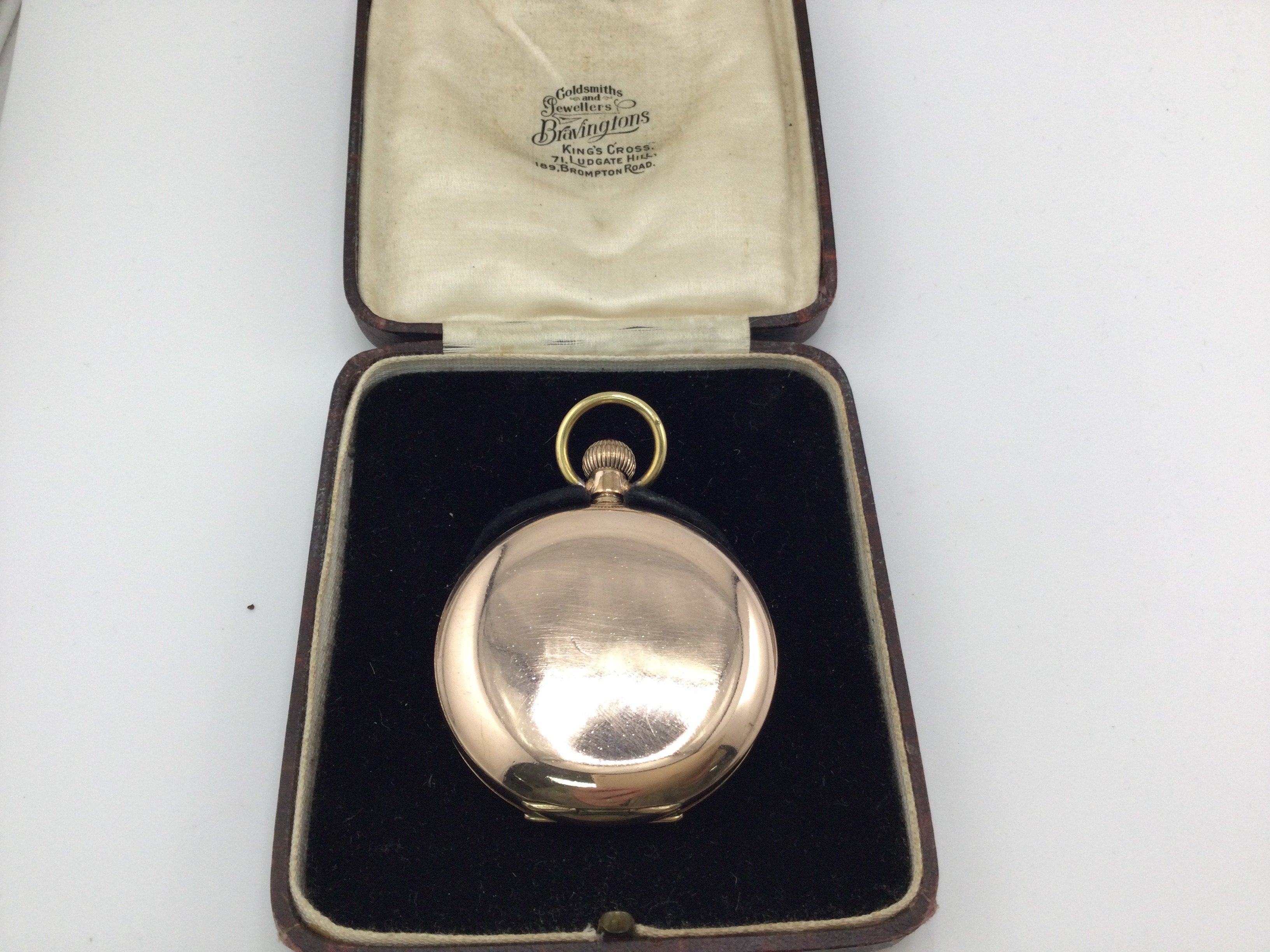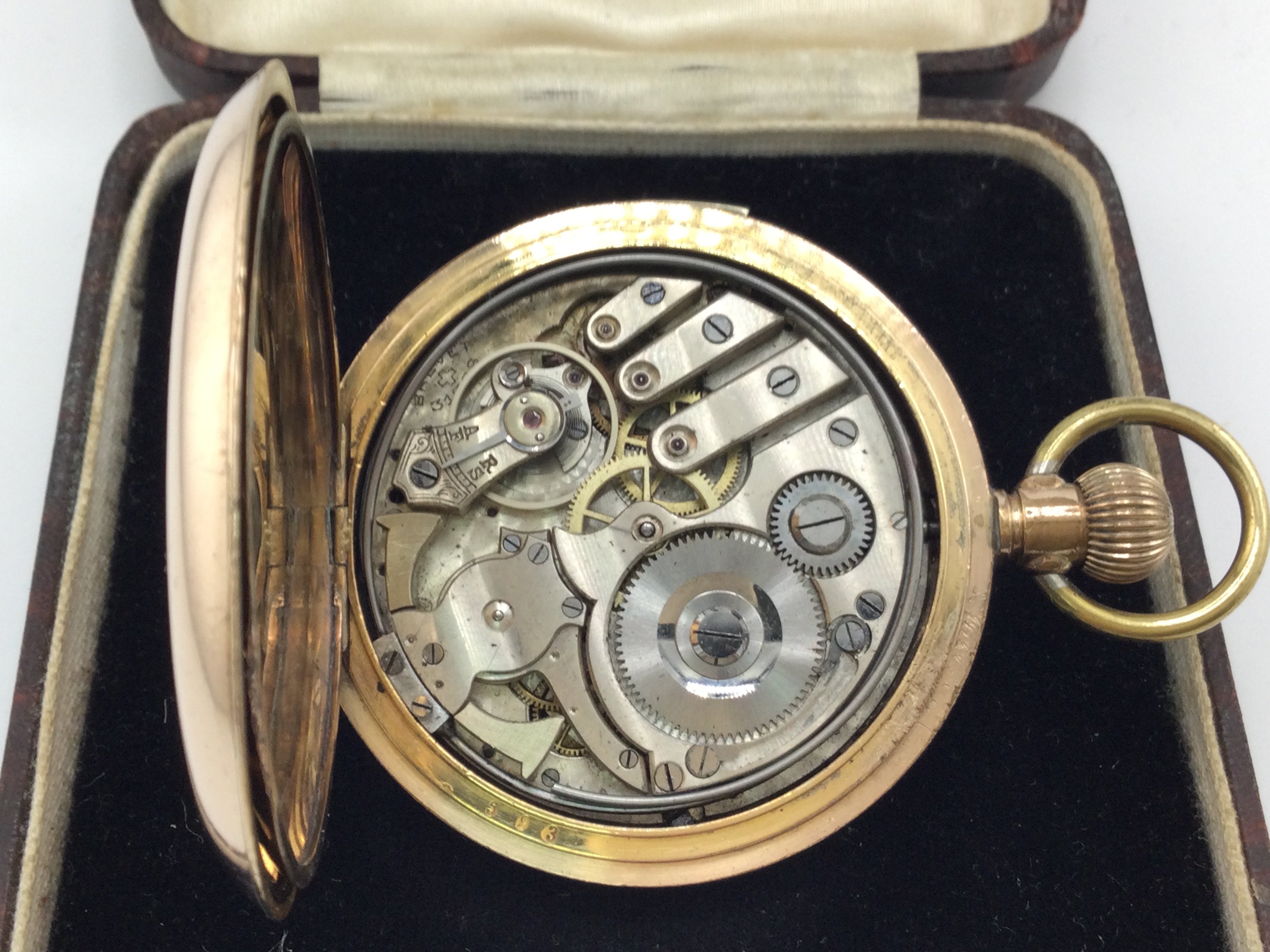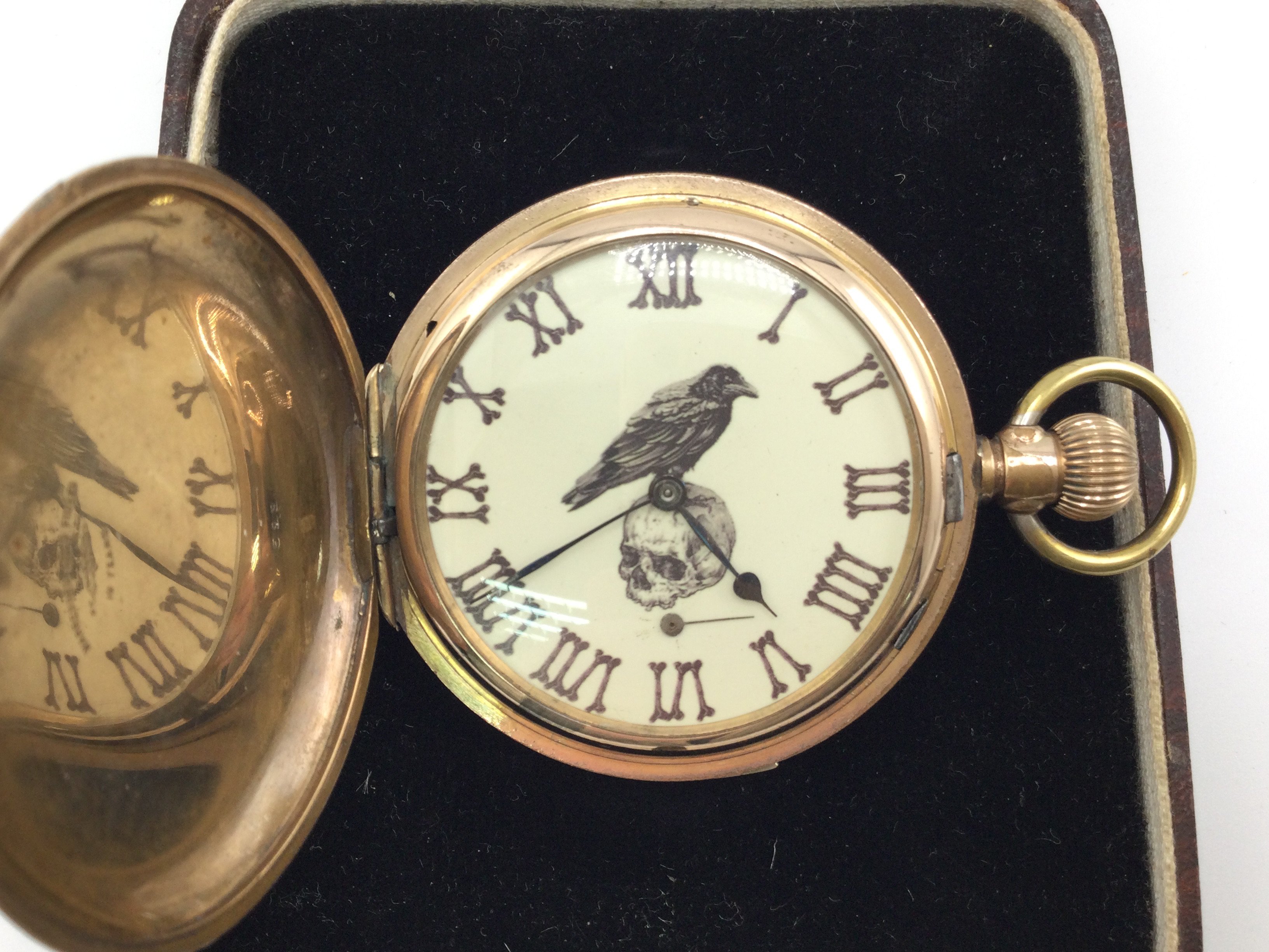 A gold plated pocket watch with Momento mori dial. Seen running.