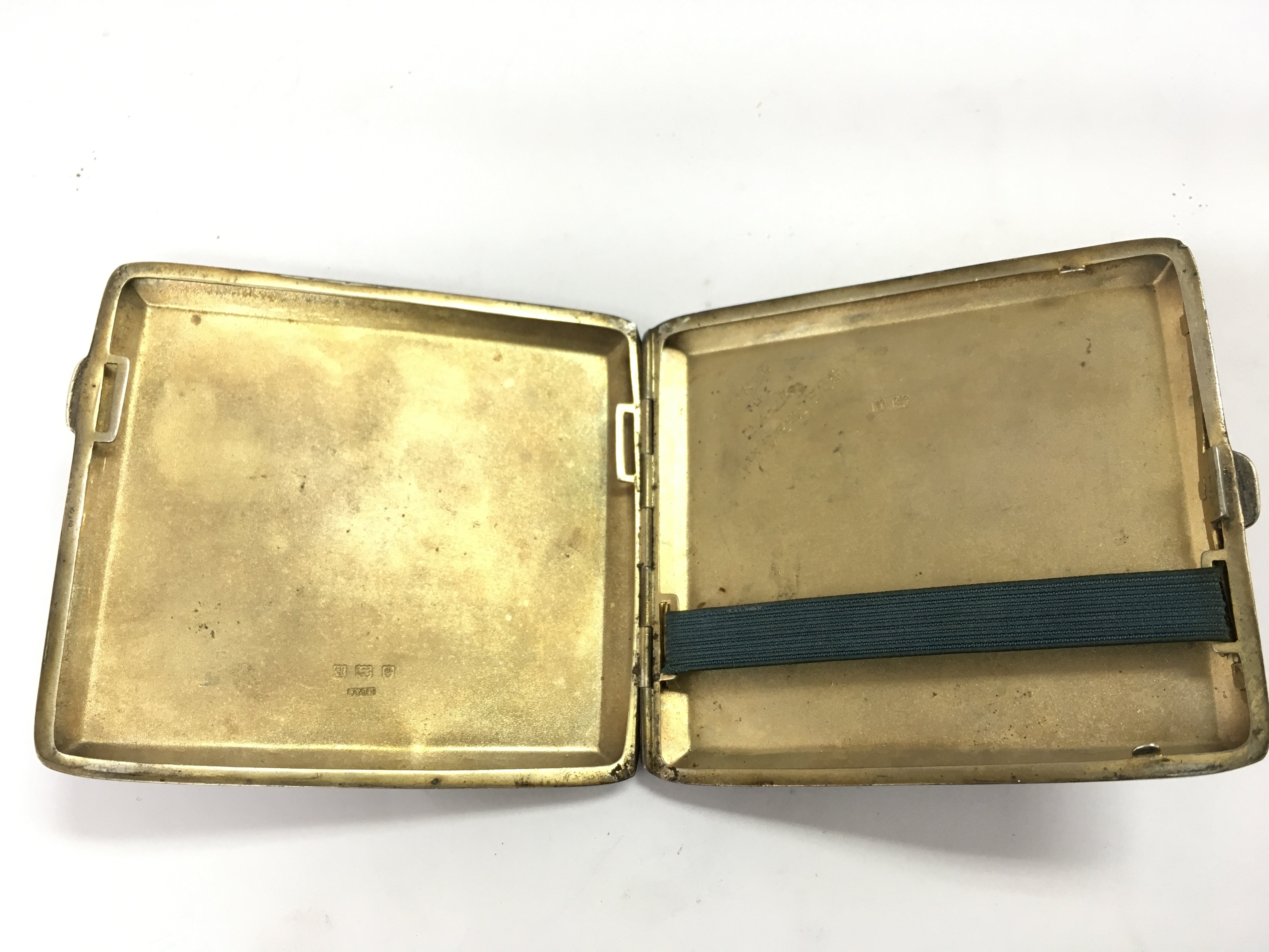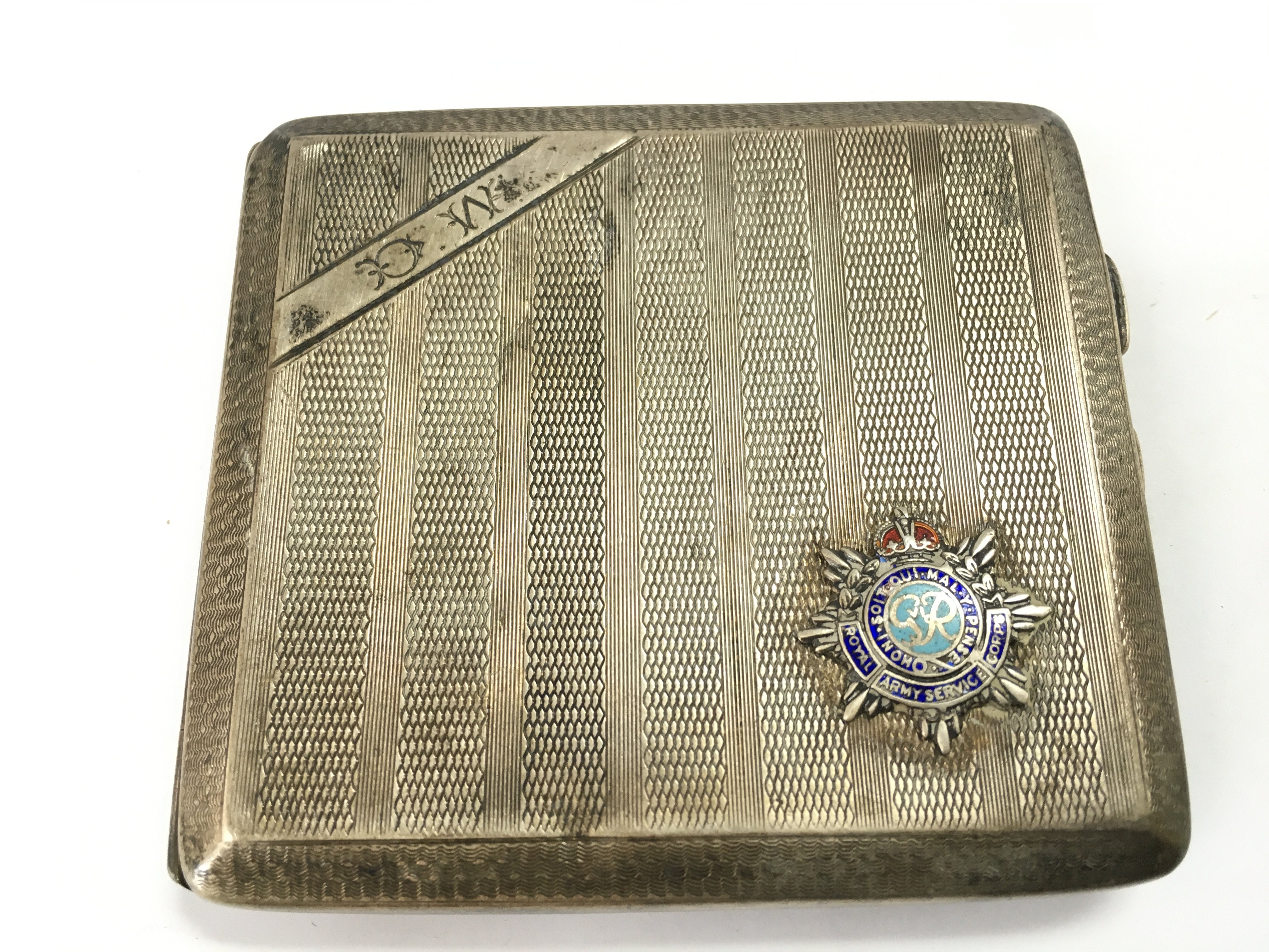 A silver hallmarked cigarette case with enamel Royal Army Service Corps badge applied to the front of the case. Postage category A