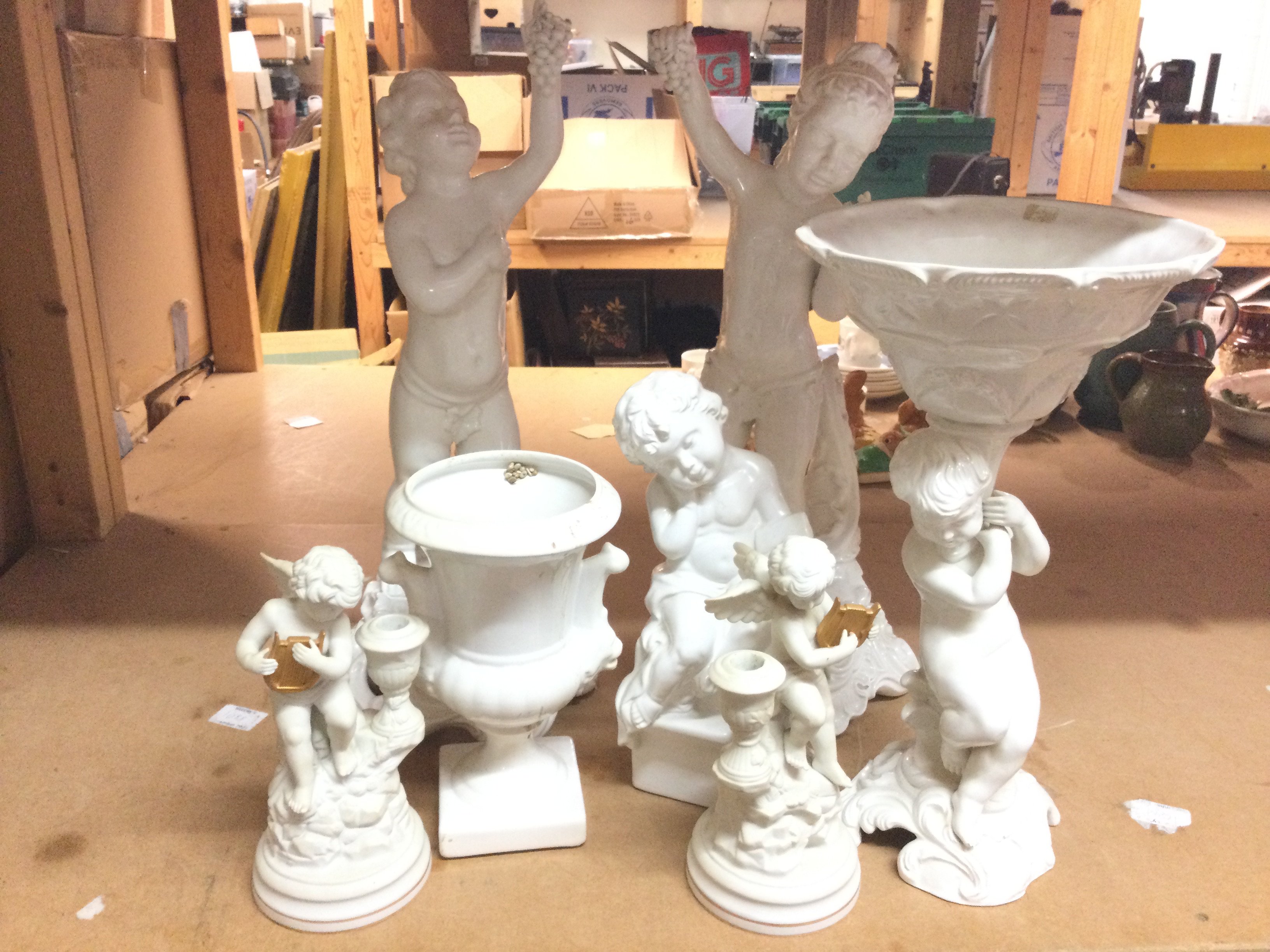 A collection of porcelain Cherub and Putti figures by Franklin Mint, Italian maker etc. Some figures are damaged. 23 to 47cm tall. This lot cannot be posted. NO RESERVE