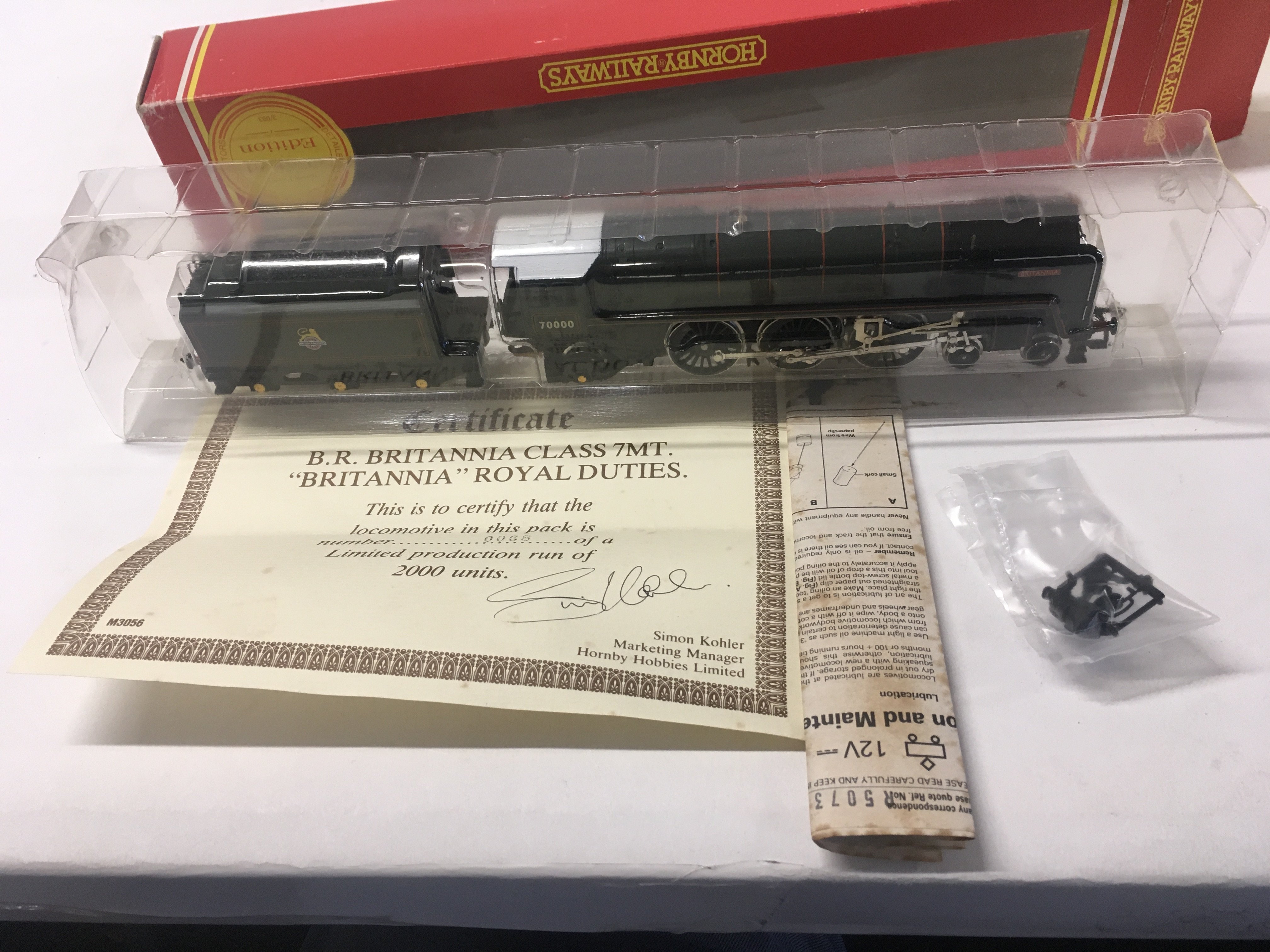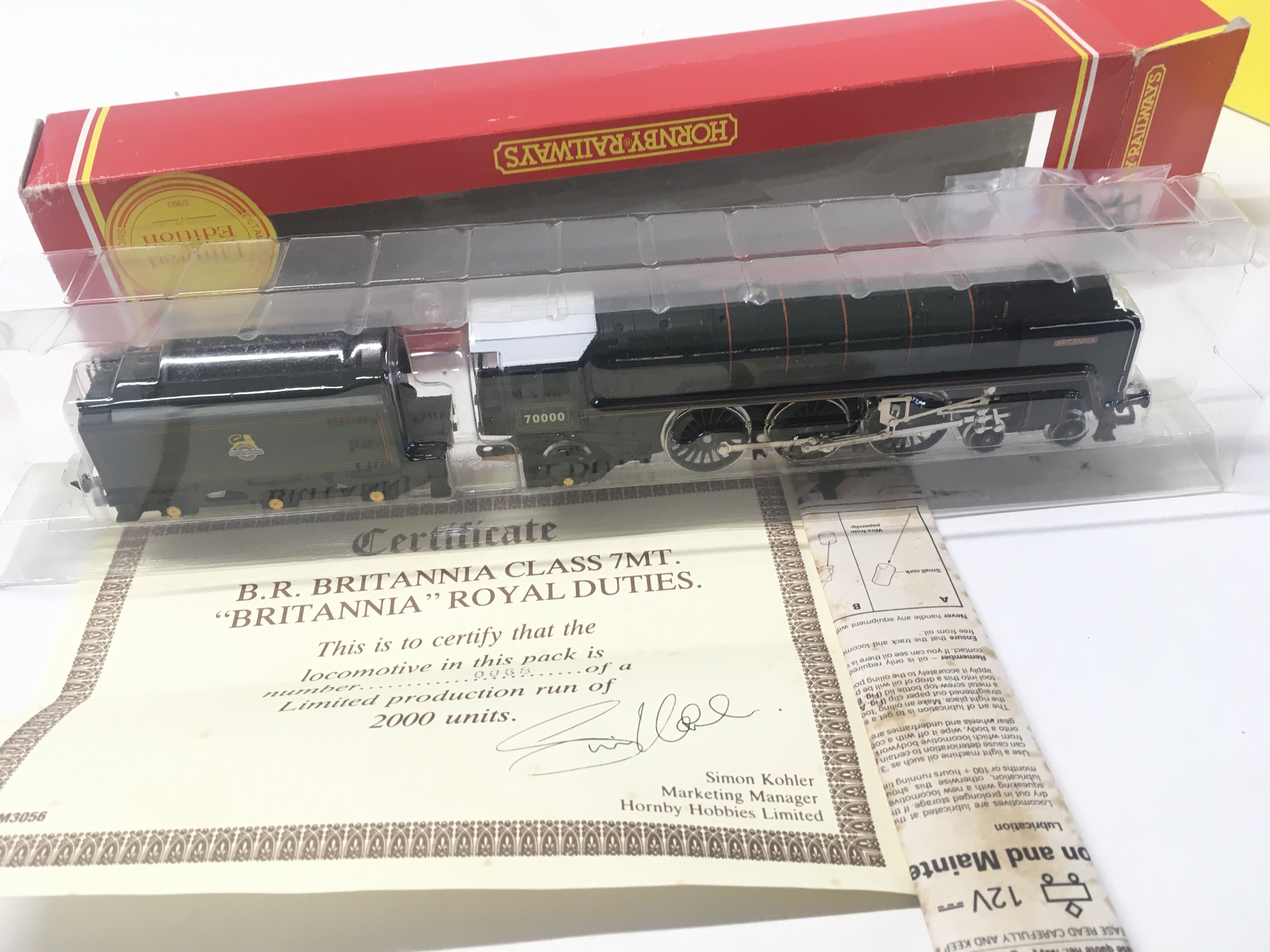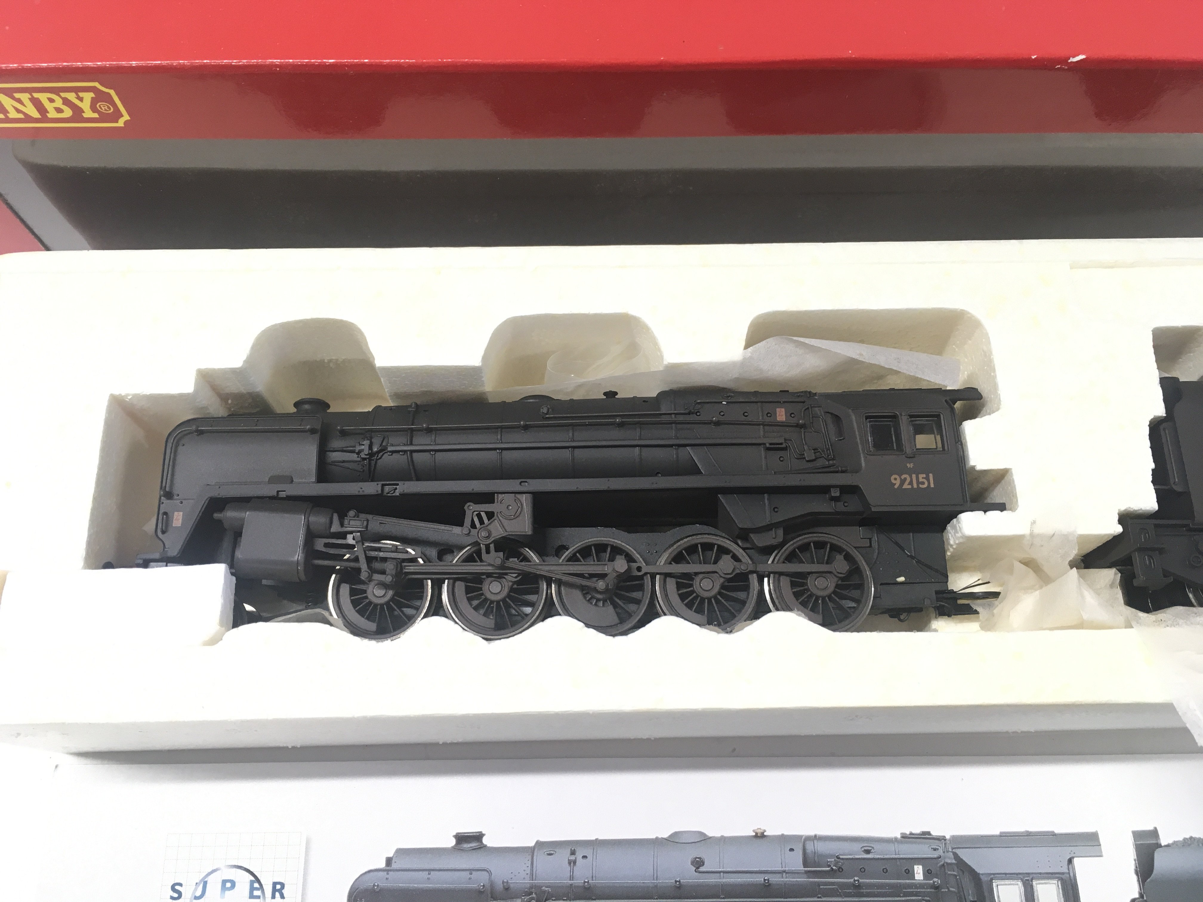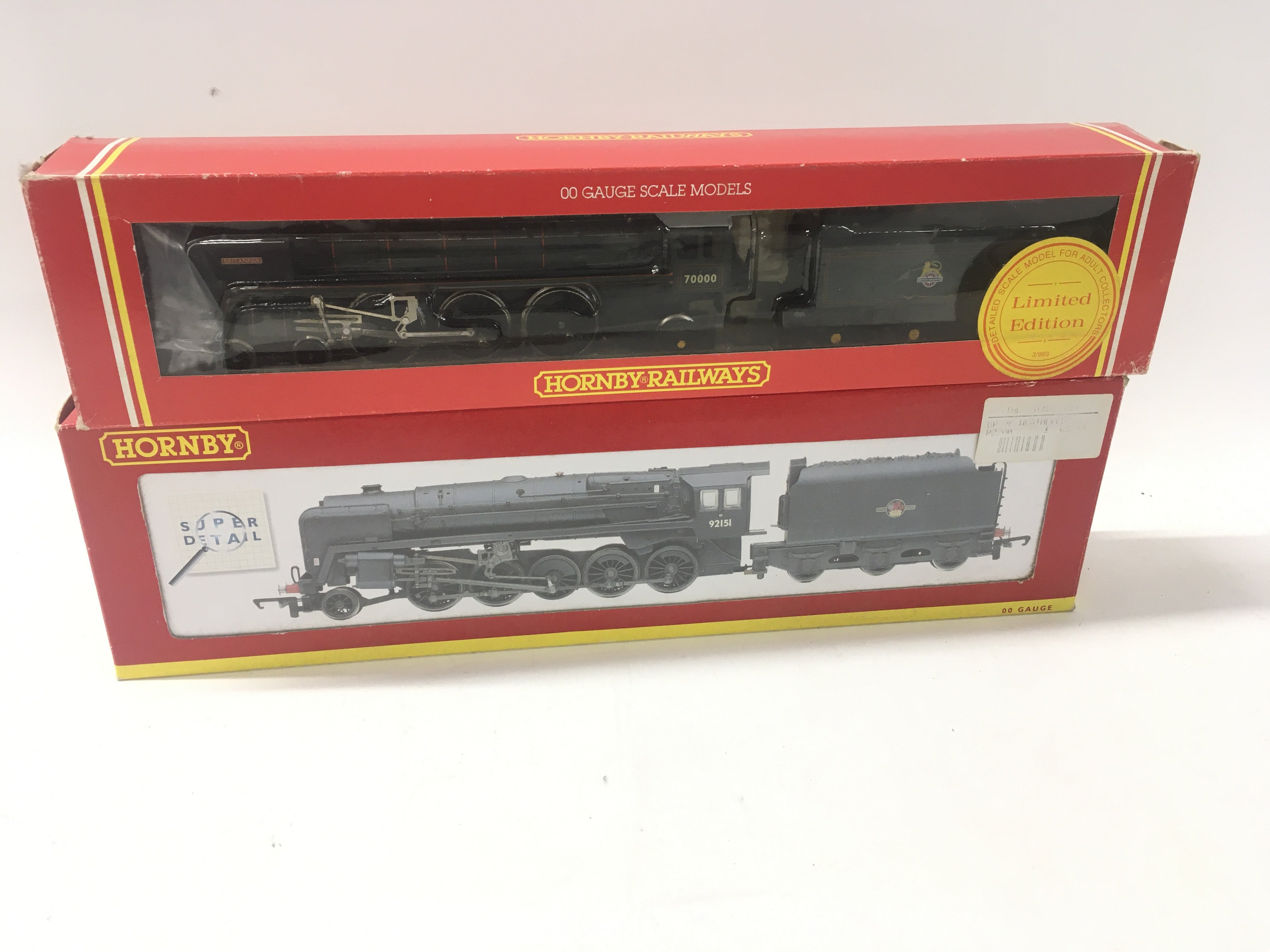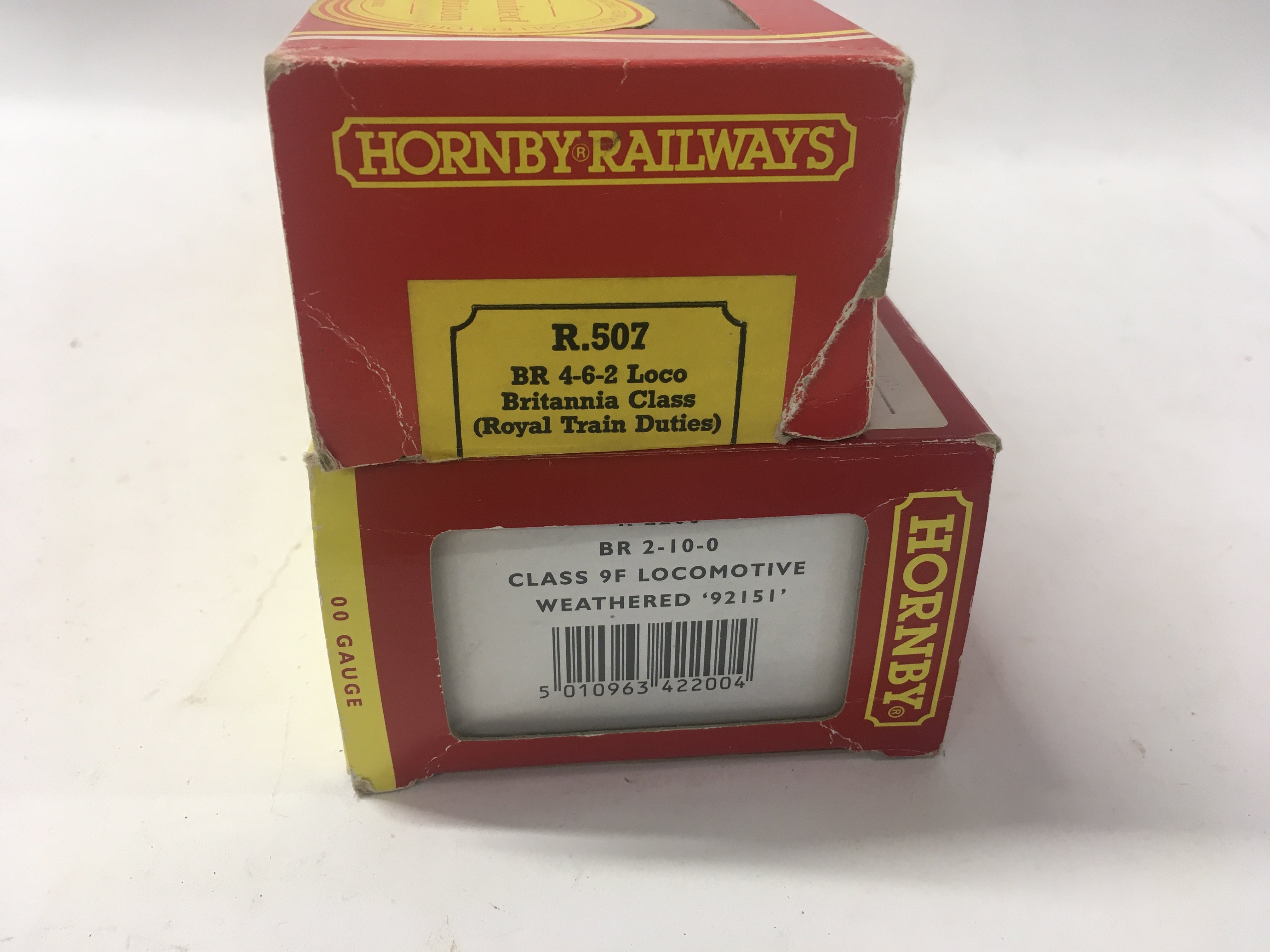 2x boxed 00 gauge model locomotives by Hornby including R.2200. BR 2.10.0. Class 9 F loco weathered 92151. and R507. BR 4.6.2 Britannia Class loco. Royal Train Duties. Special edition. No reserve.