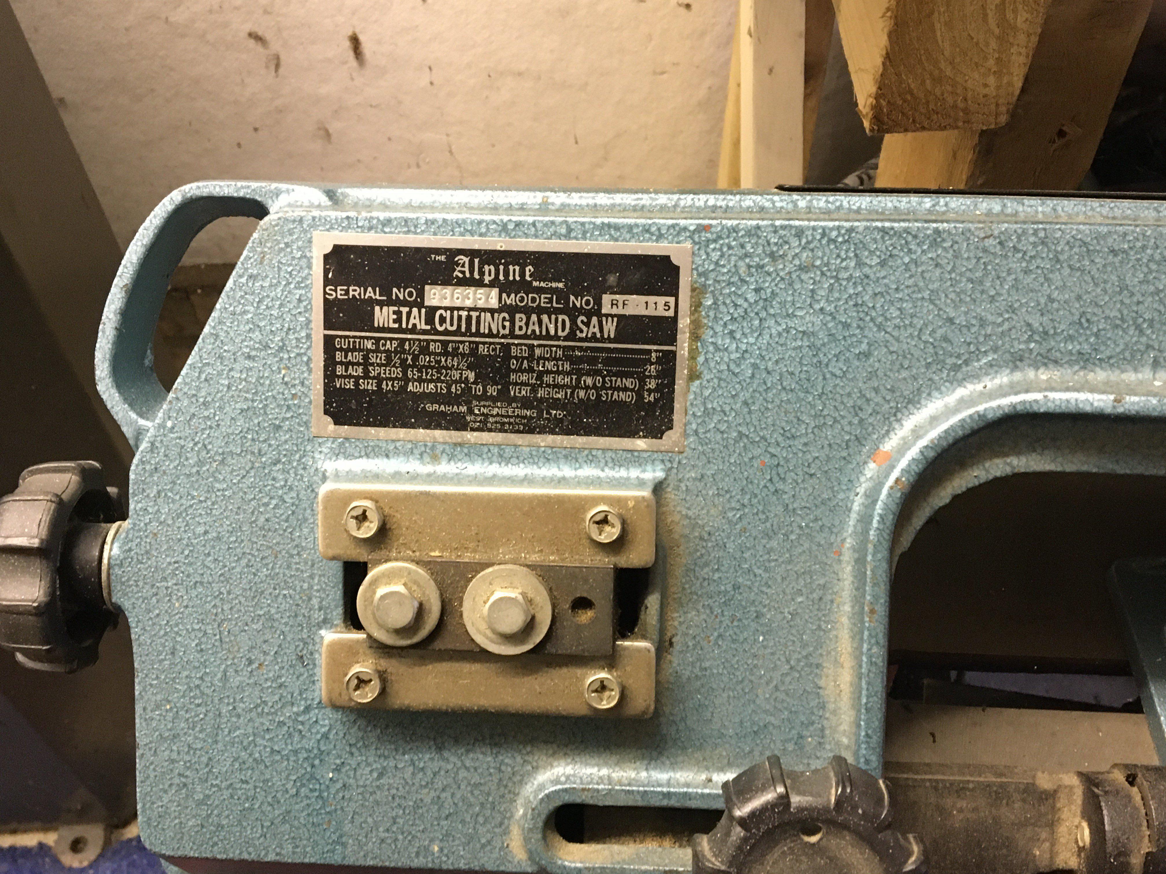 An Electric workshop metal cutting band saw. The Alpne single phase electric in good condition seen working serial number RF115 buyer to collect sold in situ viewing by appointment location area RM15.