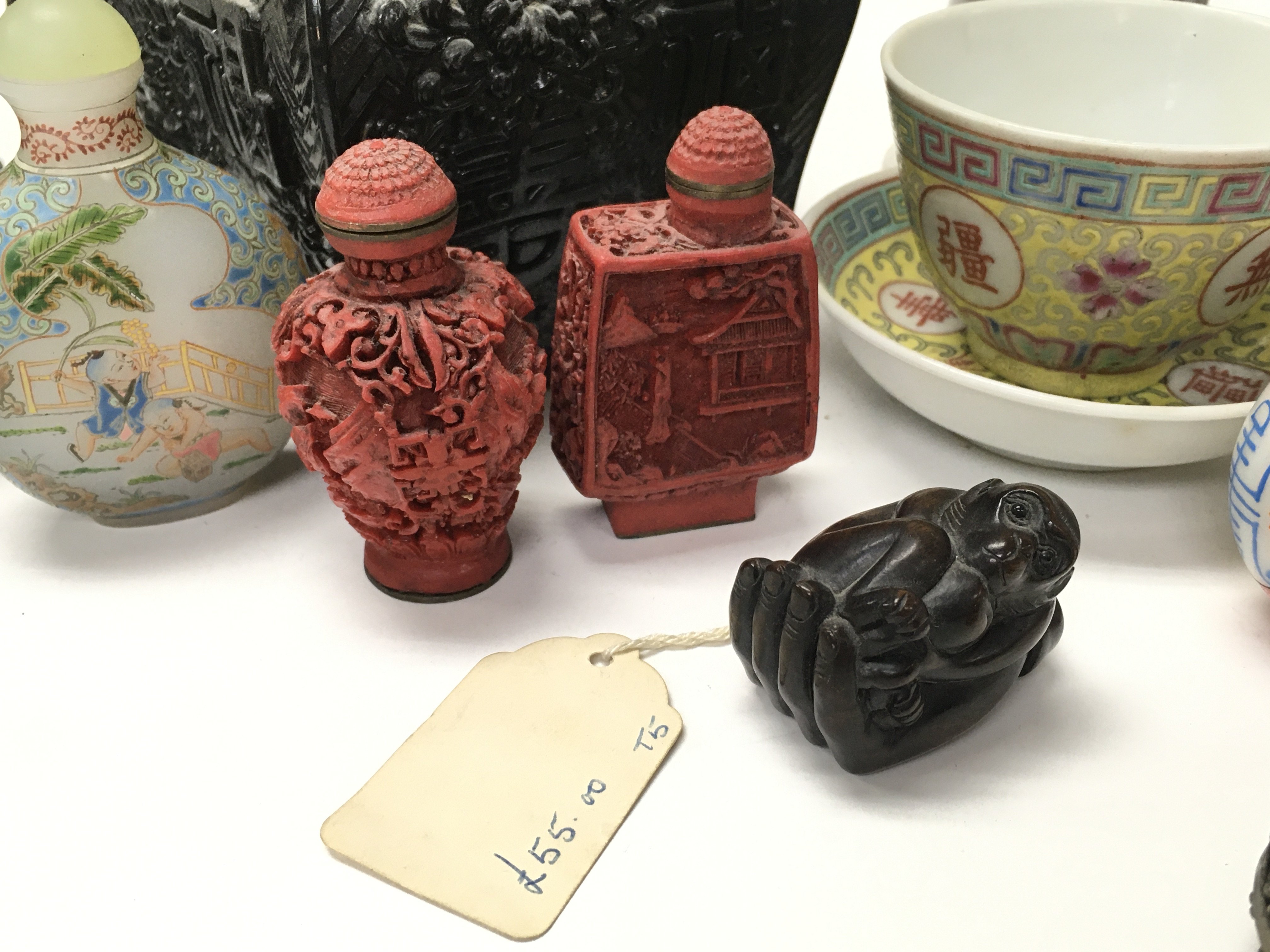 A collection of Chinese items including Snuff bottles, a Japanese wooden Netsuki of a monkey in the palm of a hand, marble fu dogs etc. this lot cannot be posted. NO RESERVE
