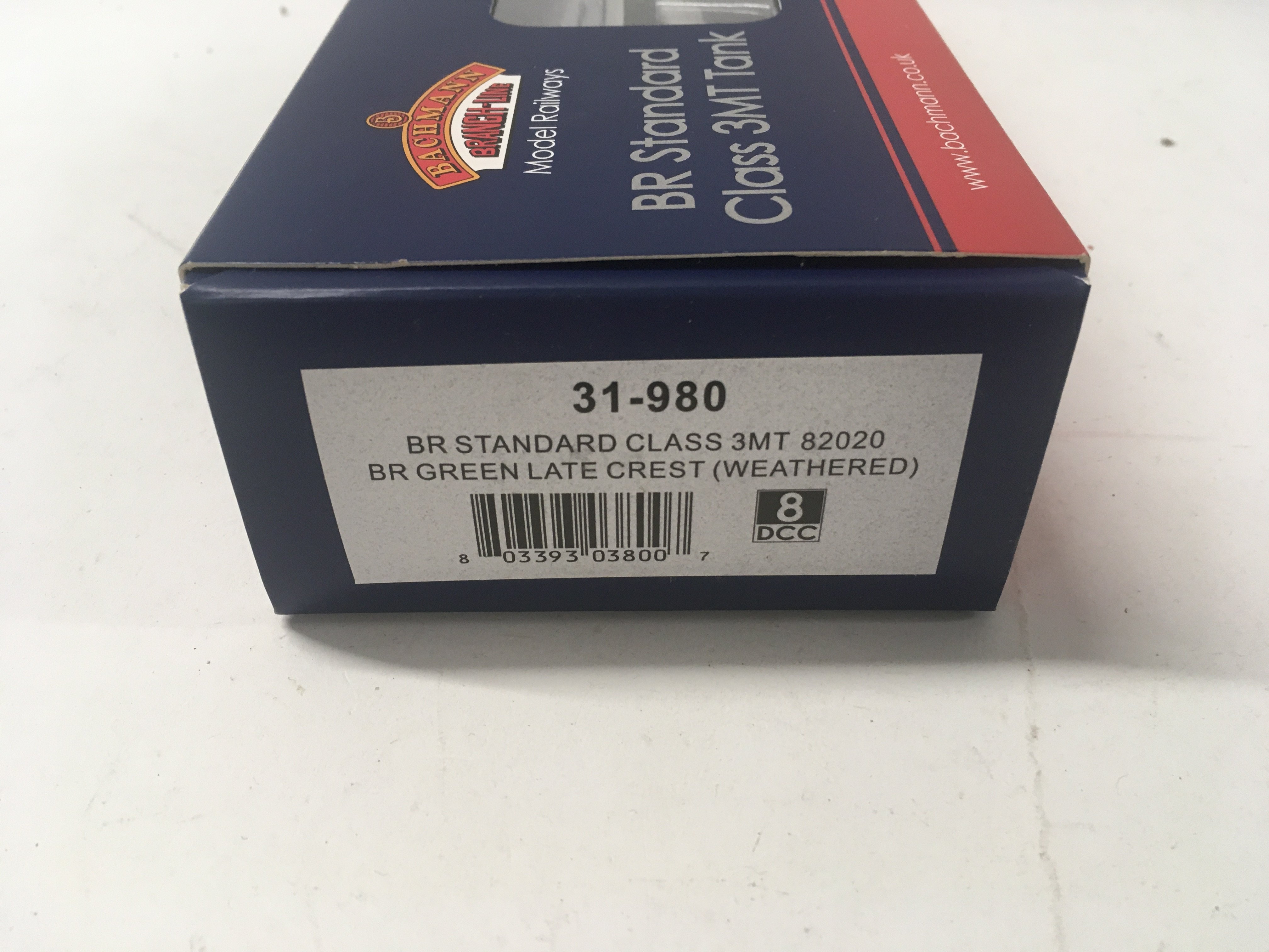 A boxed 00 gauge model locomotive by bachmann 31.980. BR Standard Class 3MT 82020. BR green late crest weathered. 8DCC. No reserve