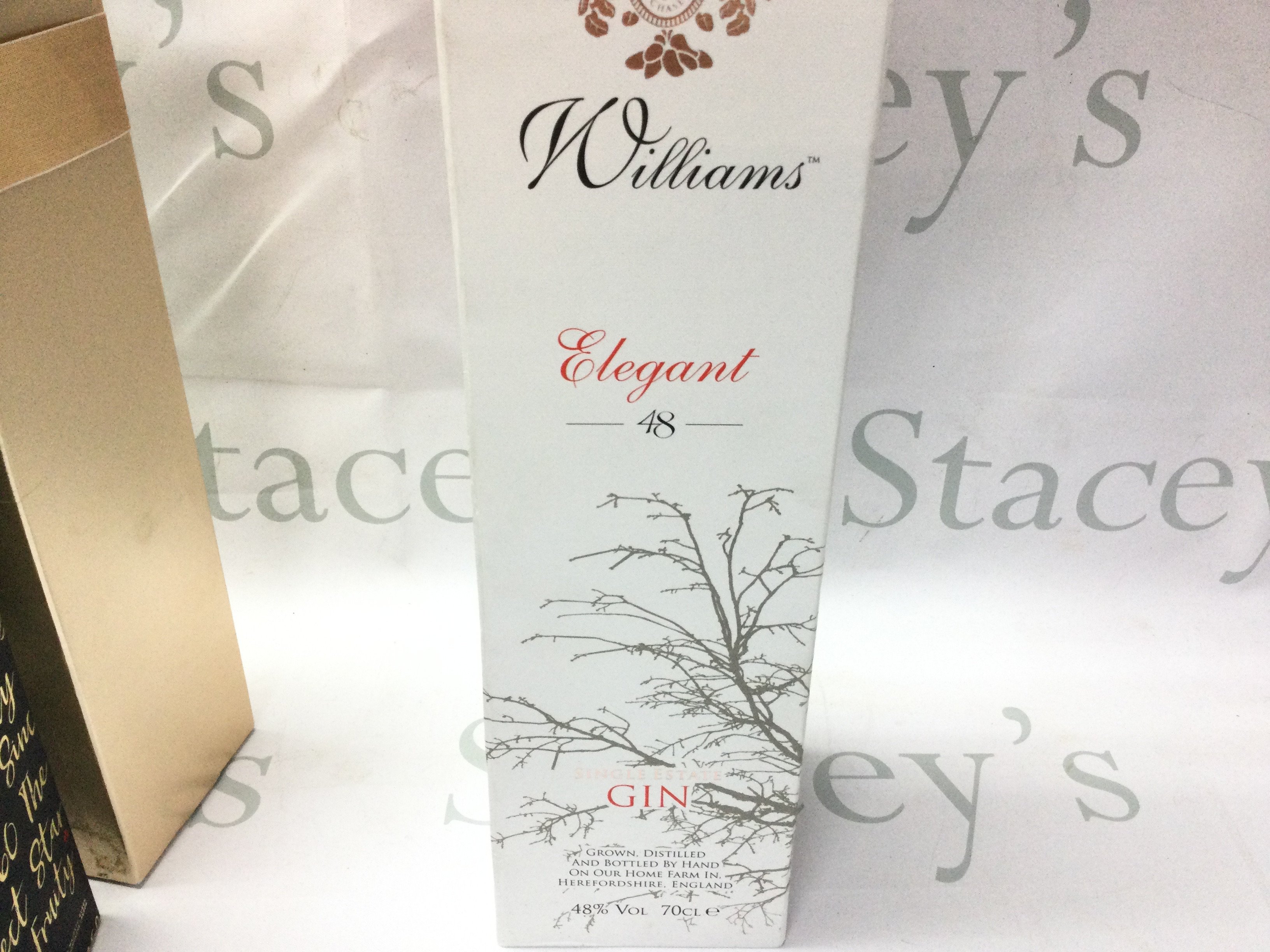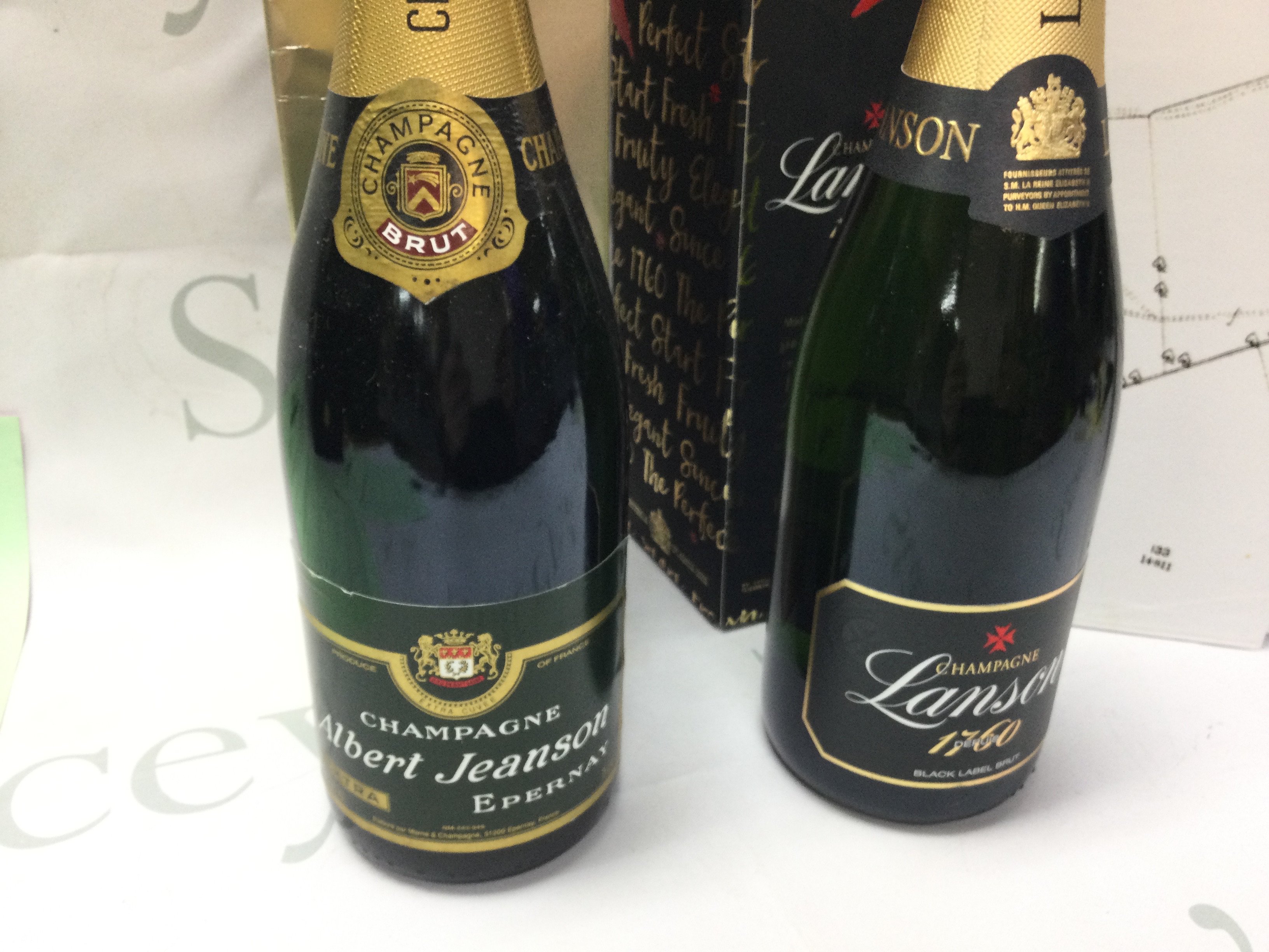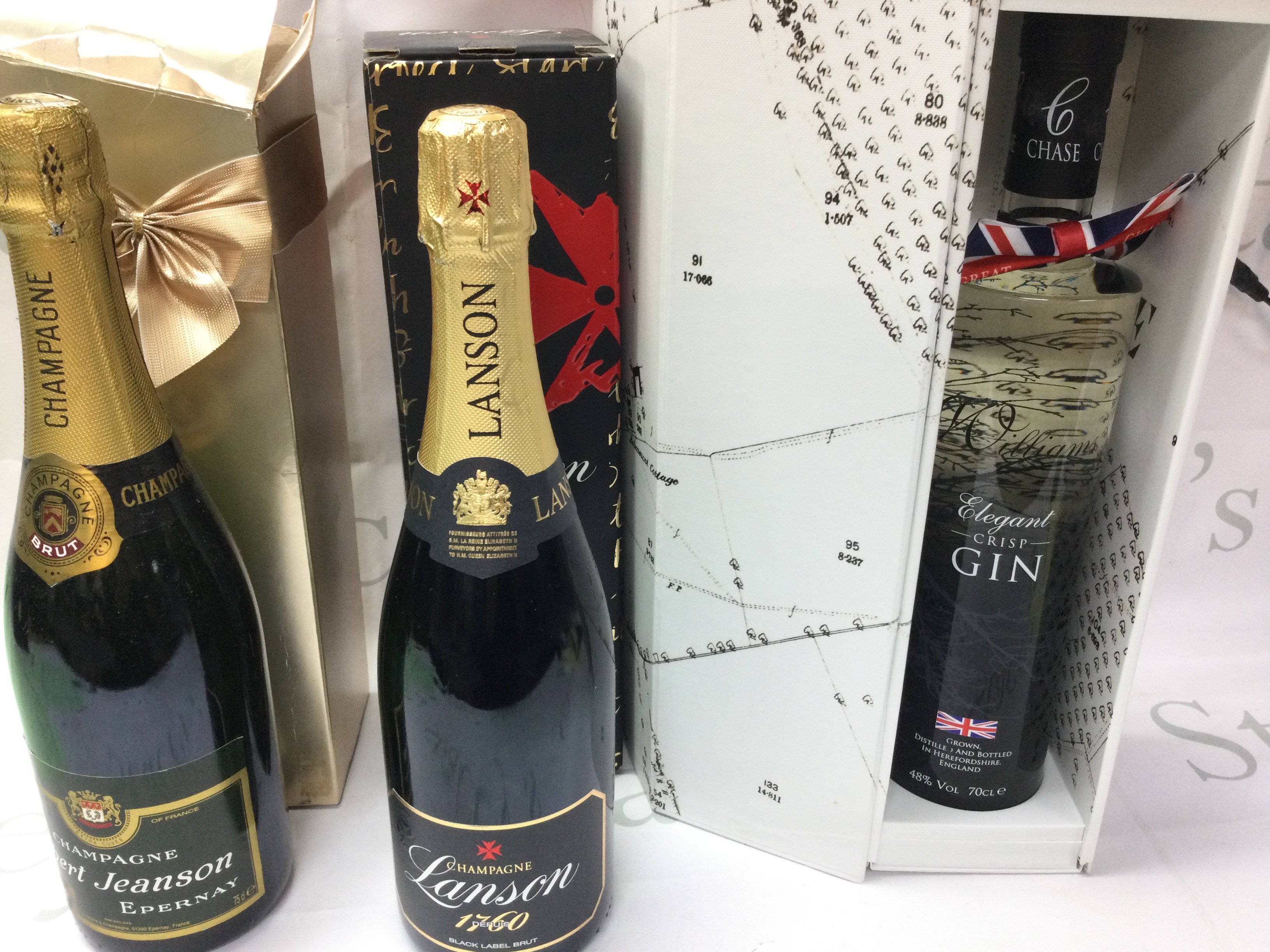 Two bottles of champagne including Lanson black label and a bottle of Williams gin.