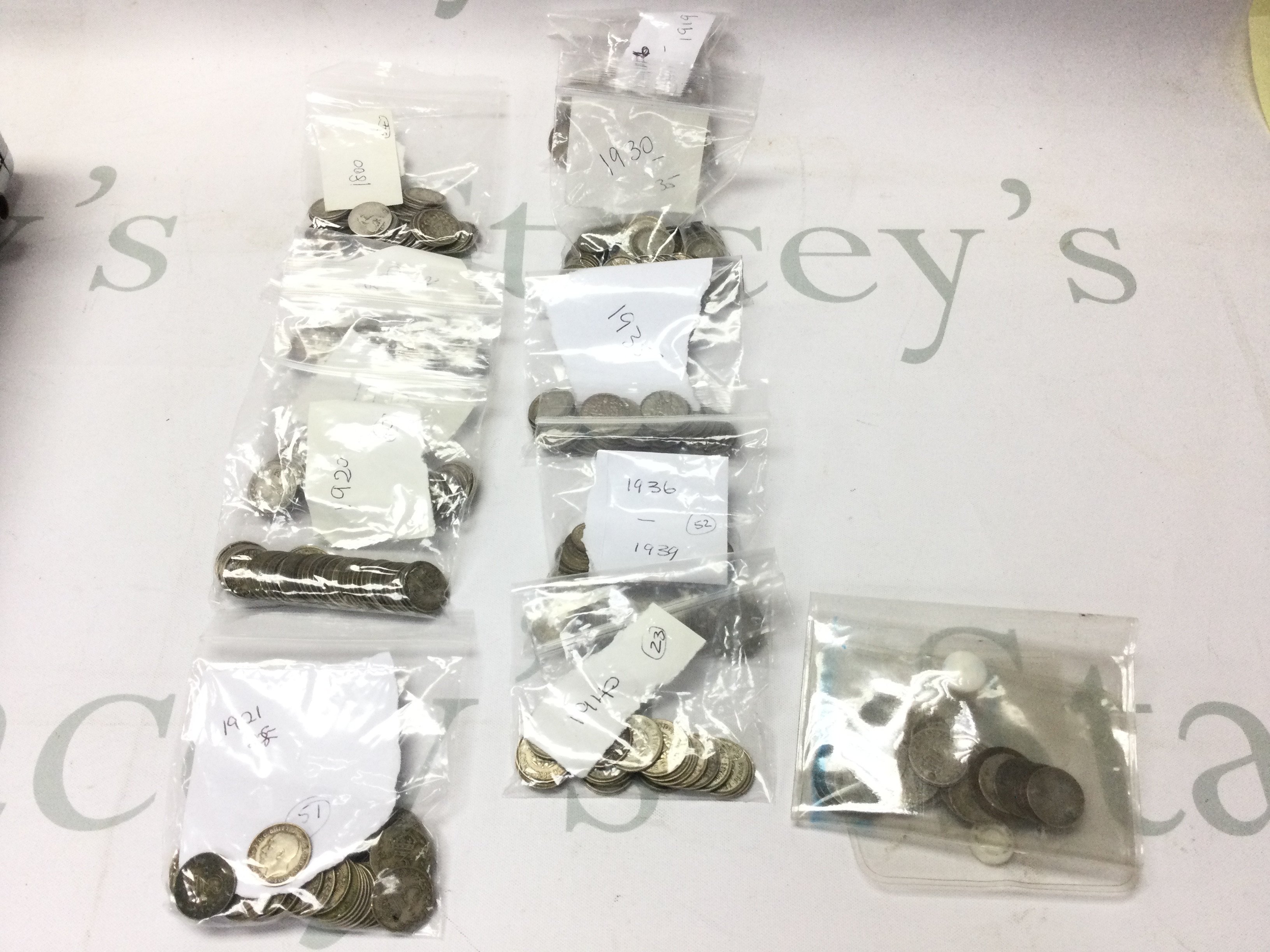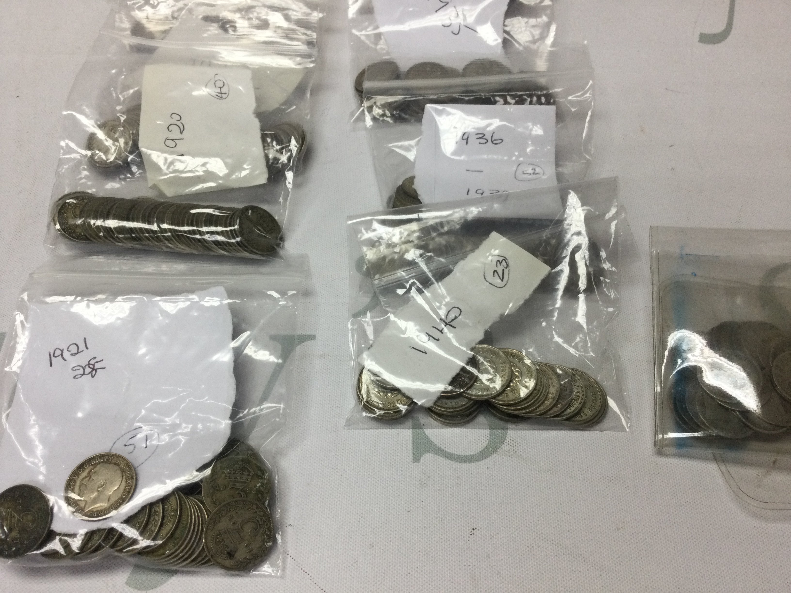 A large collection of silver three pence coins including 295g of 1920 - 1940 and 370g of pre 1920