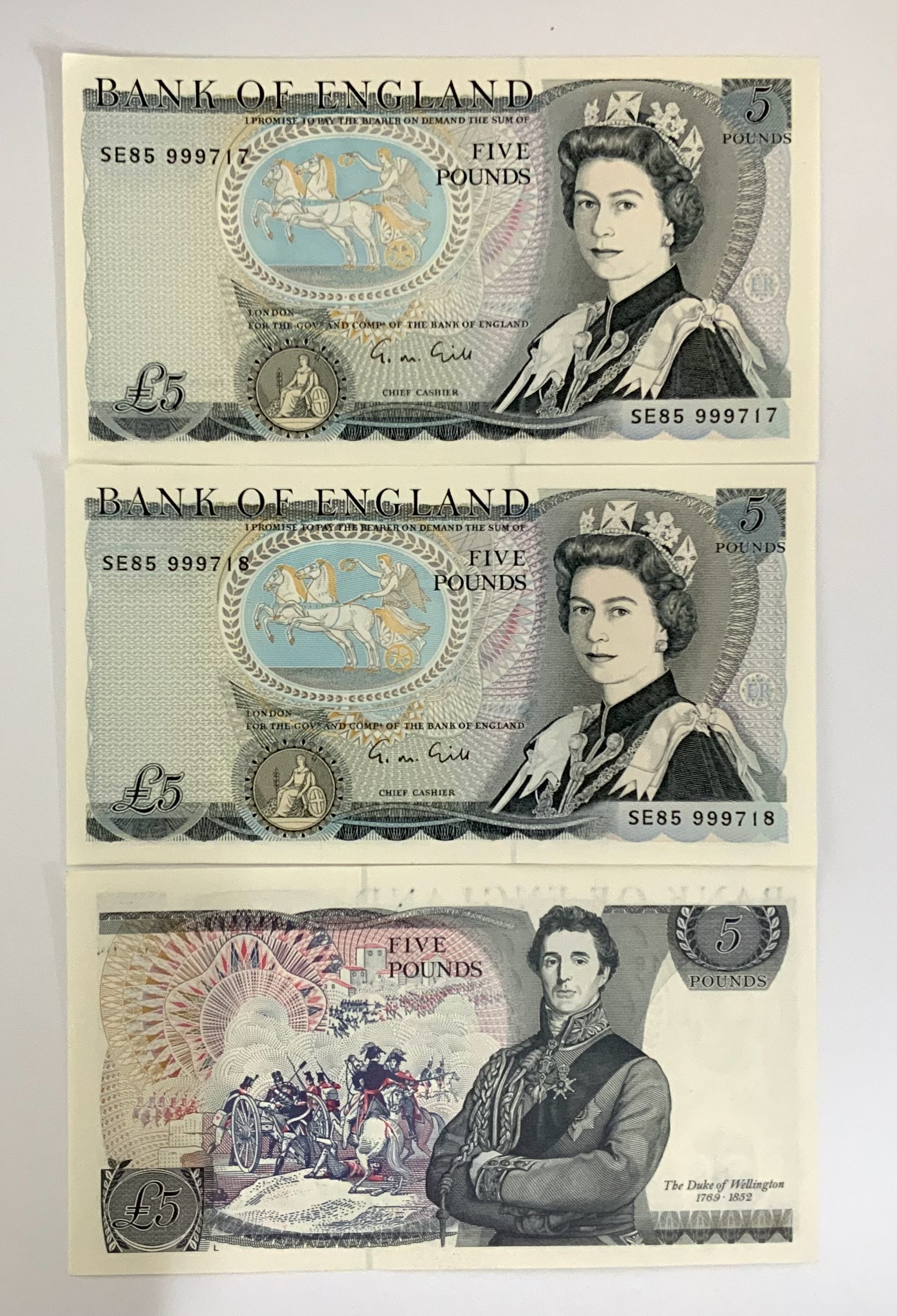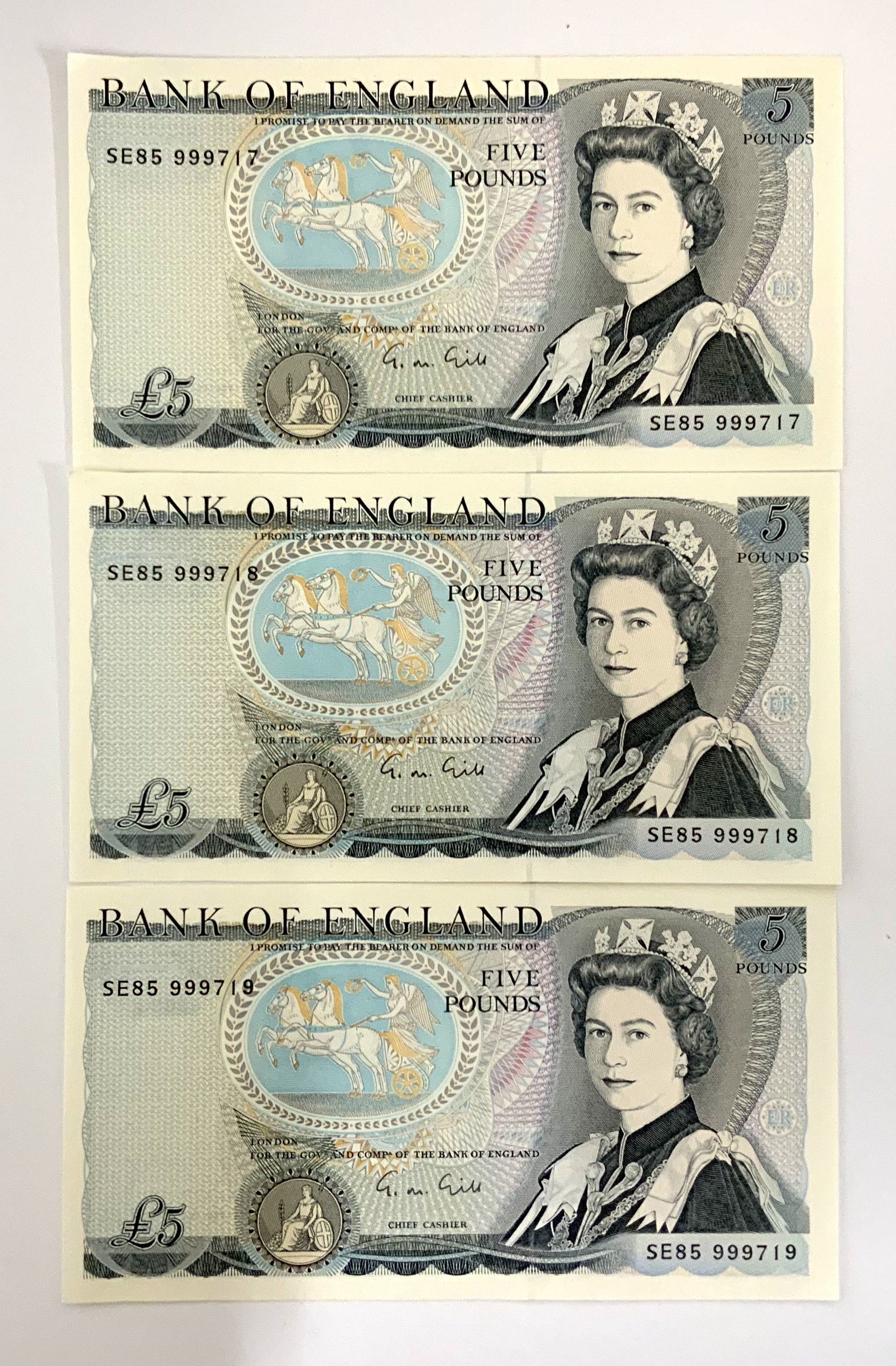 1988, G M Gill Consective 5 notes serial number SE85 999717 - 19.