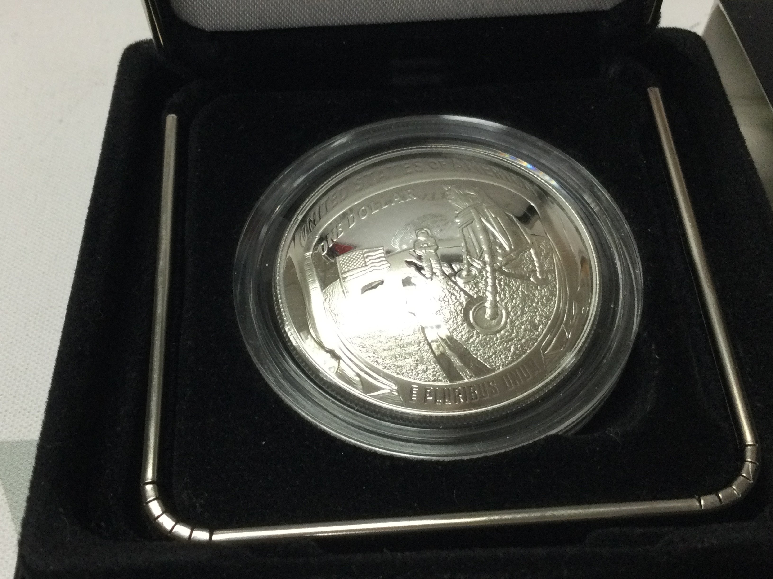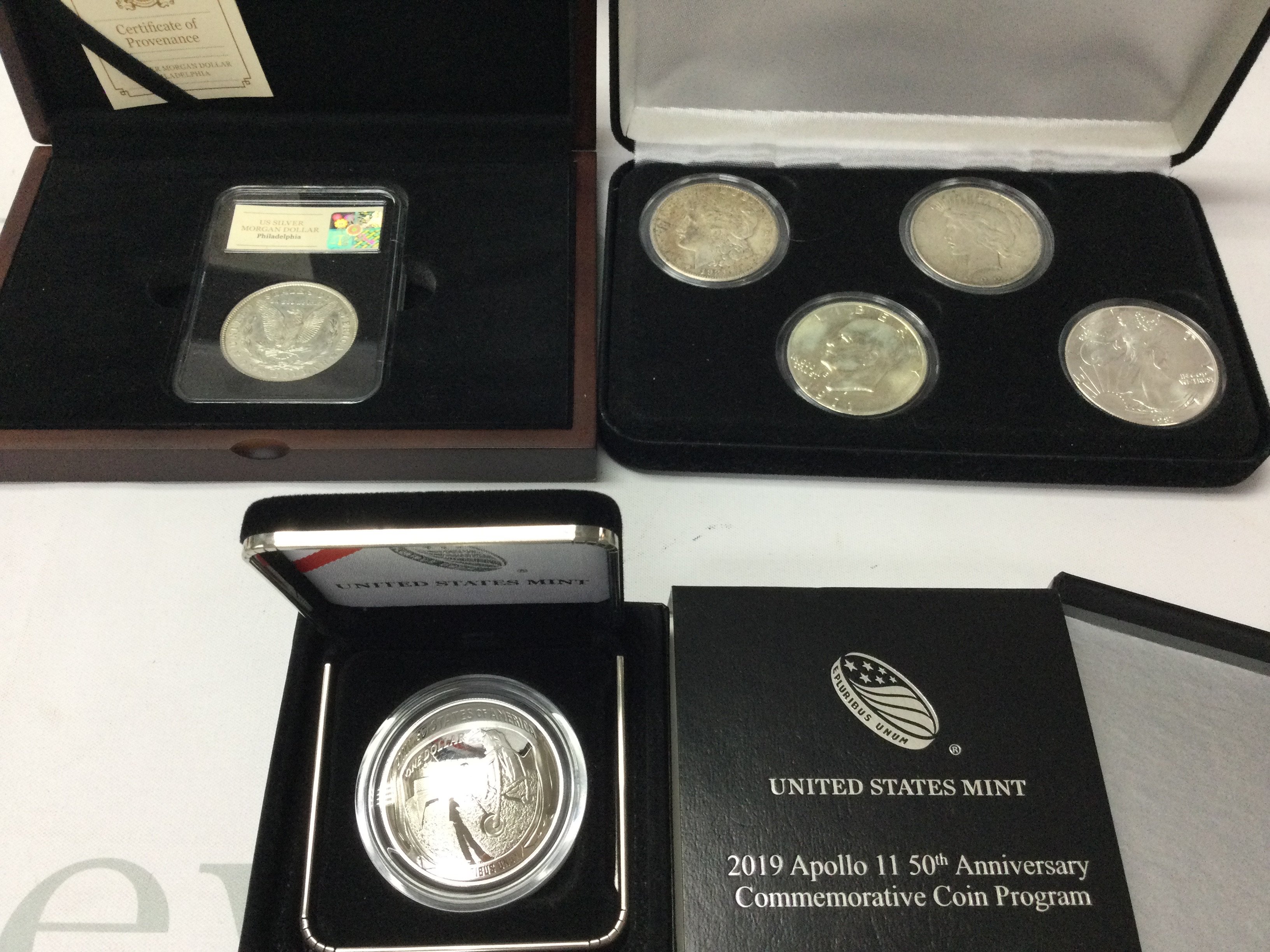 A collection of assorted silver dollars including a 2019 Apollo 11 50th anniversary coin. Postage B