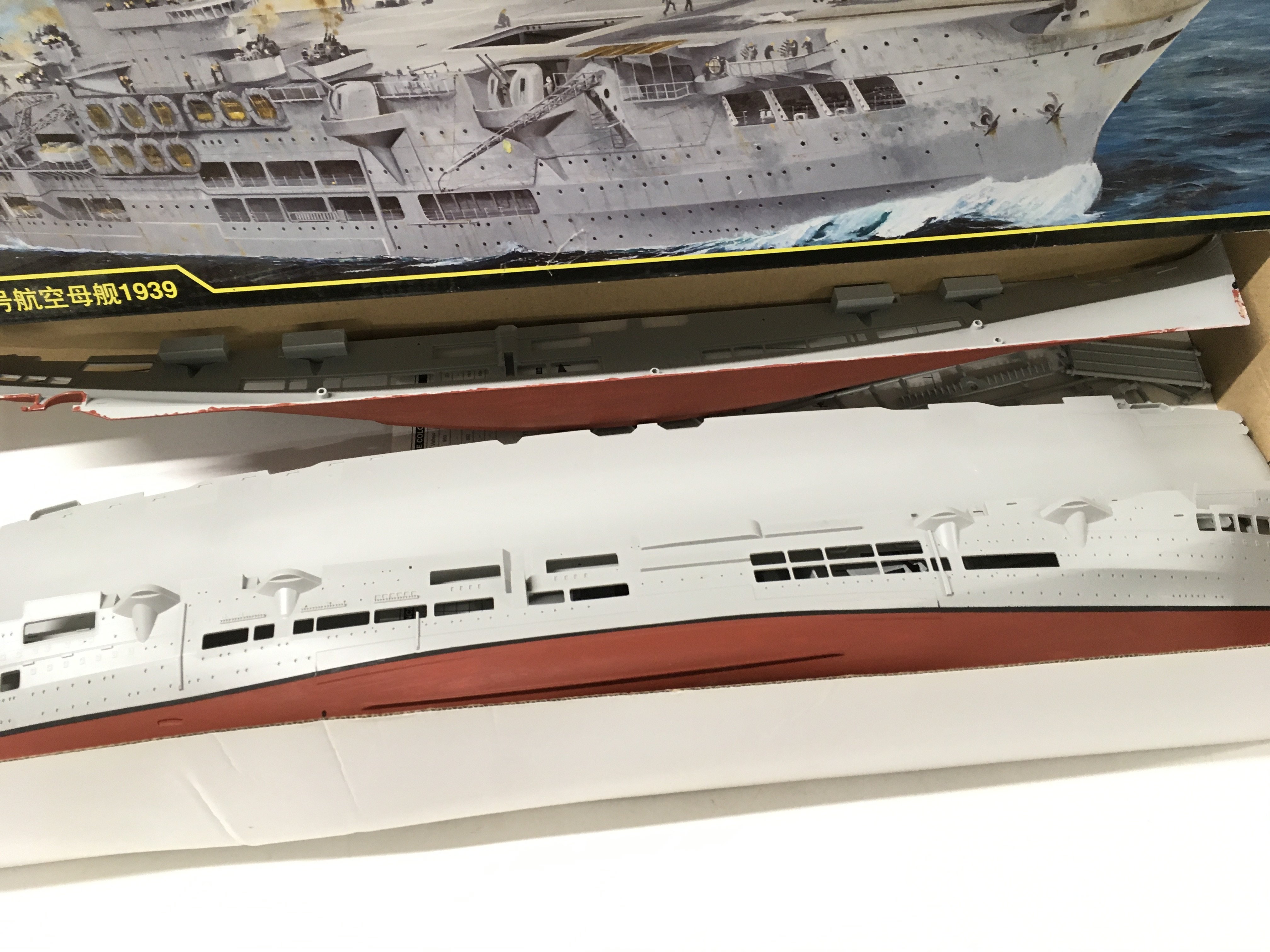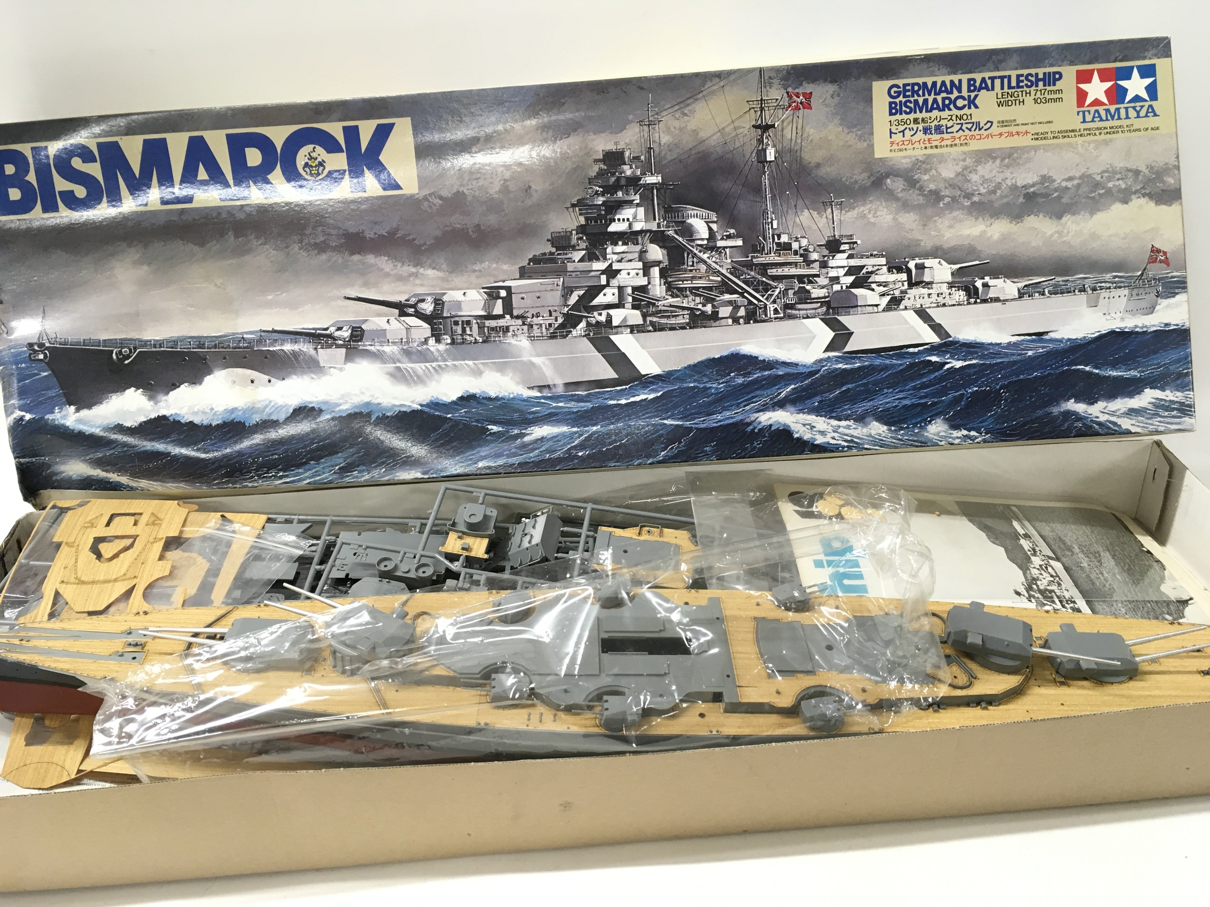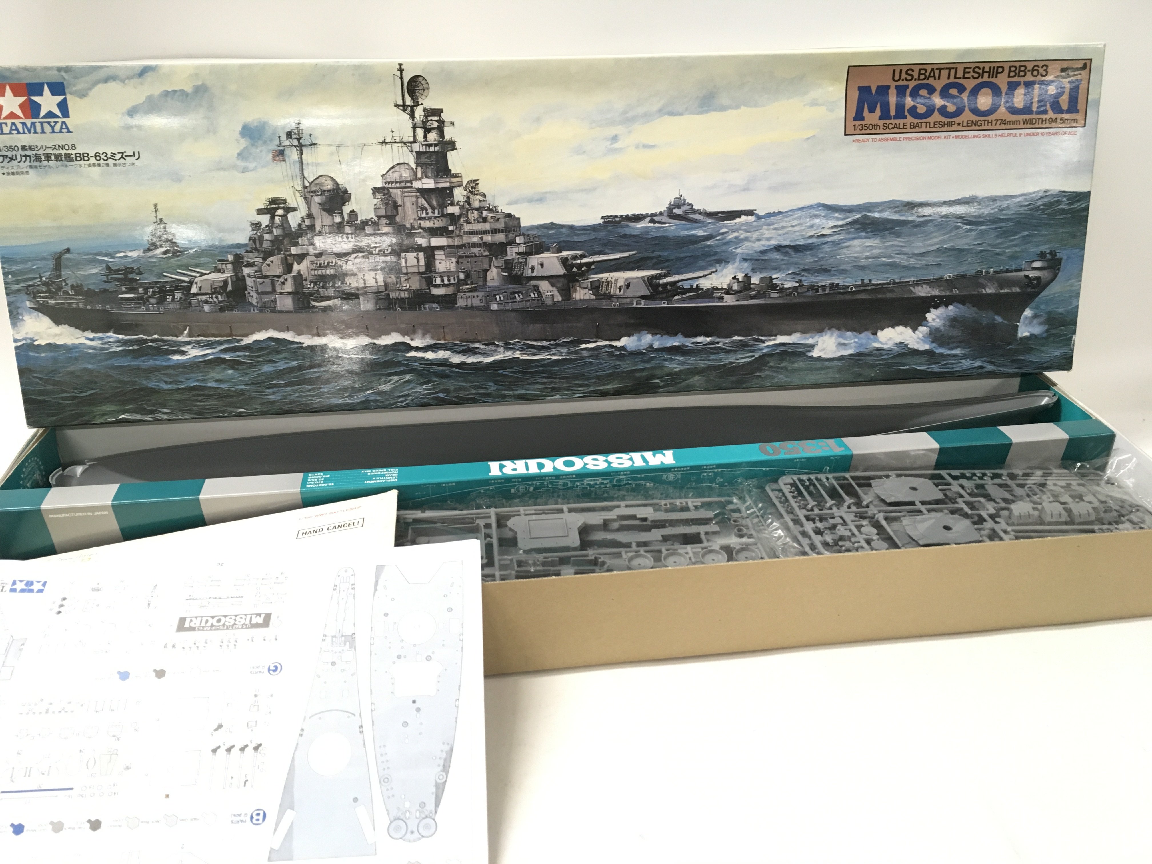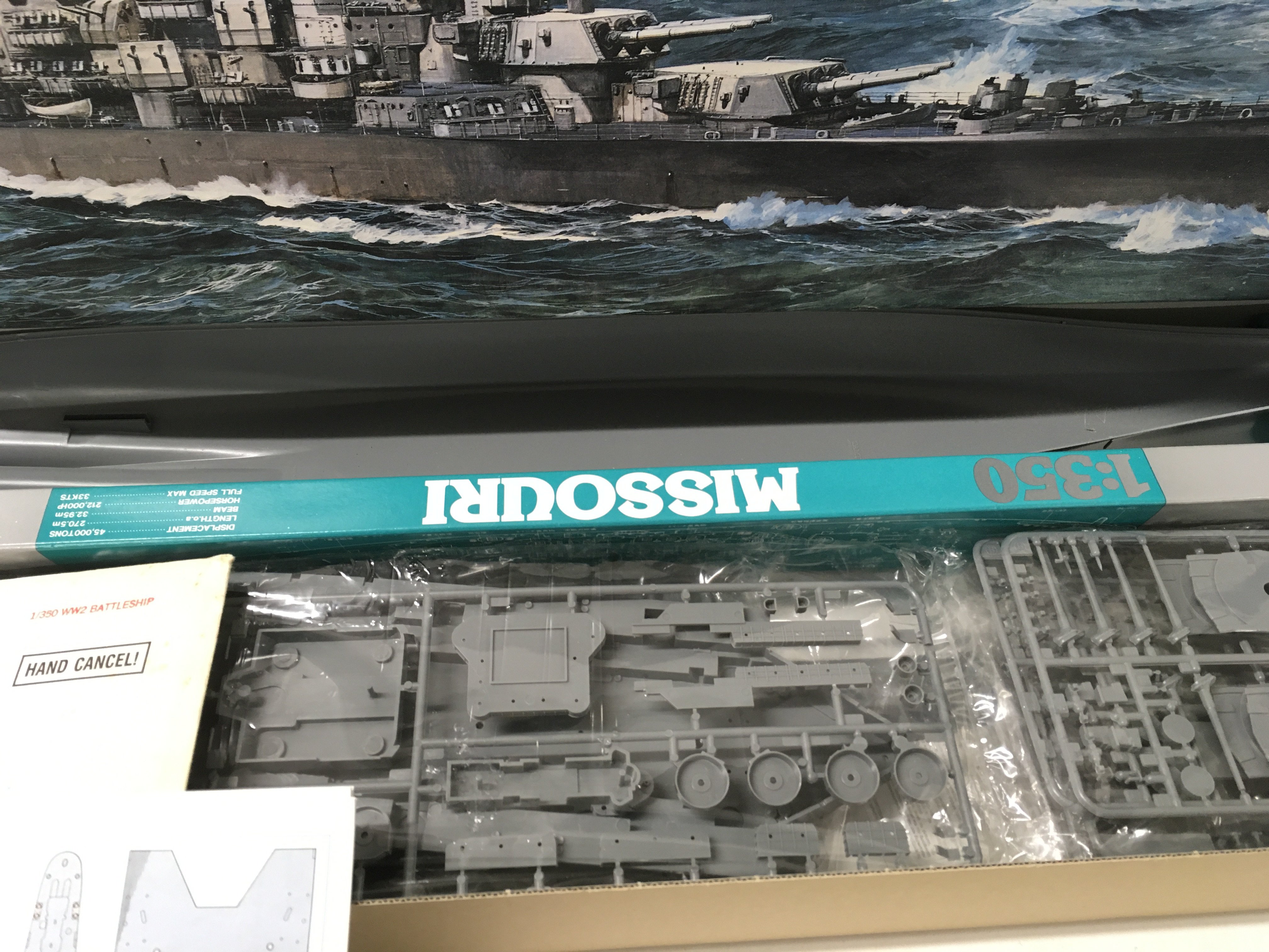 3x boxed model warship kits includes Battleship BISMARCK by Tamiya..started…..Aircraft Carrier. HMS ARK ROYAL1939 by Merit International..started….Battleship USS MISSOURI BB63 by Tamiya.. No reserve (3)