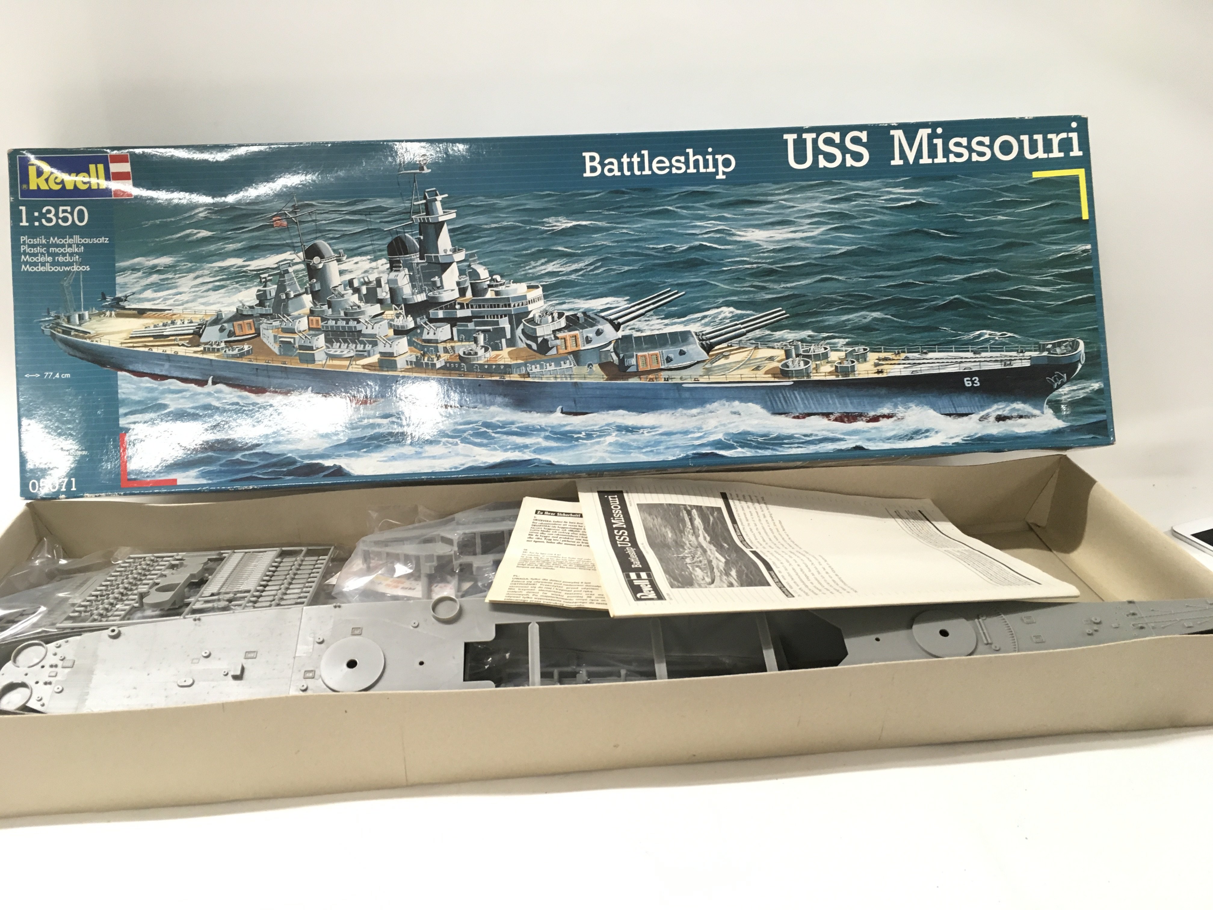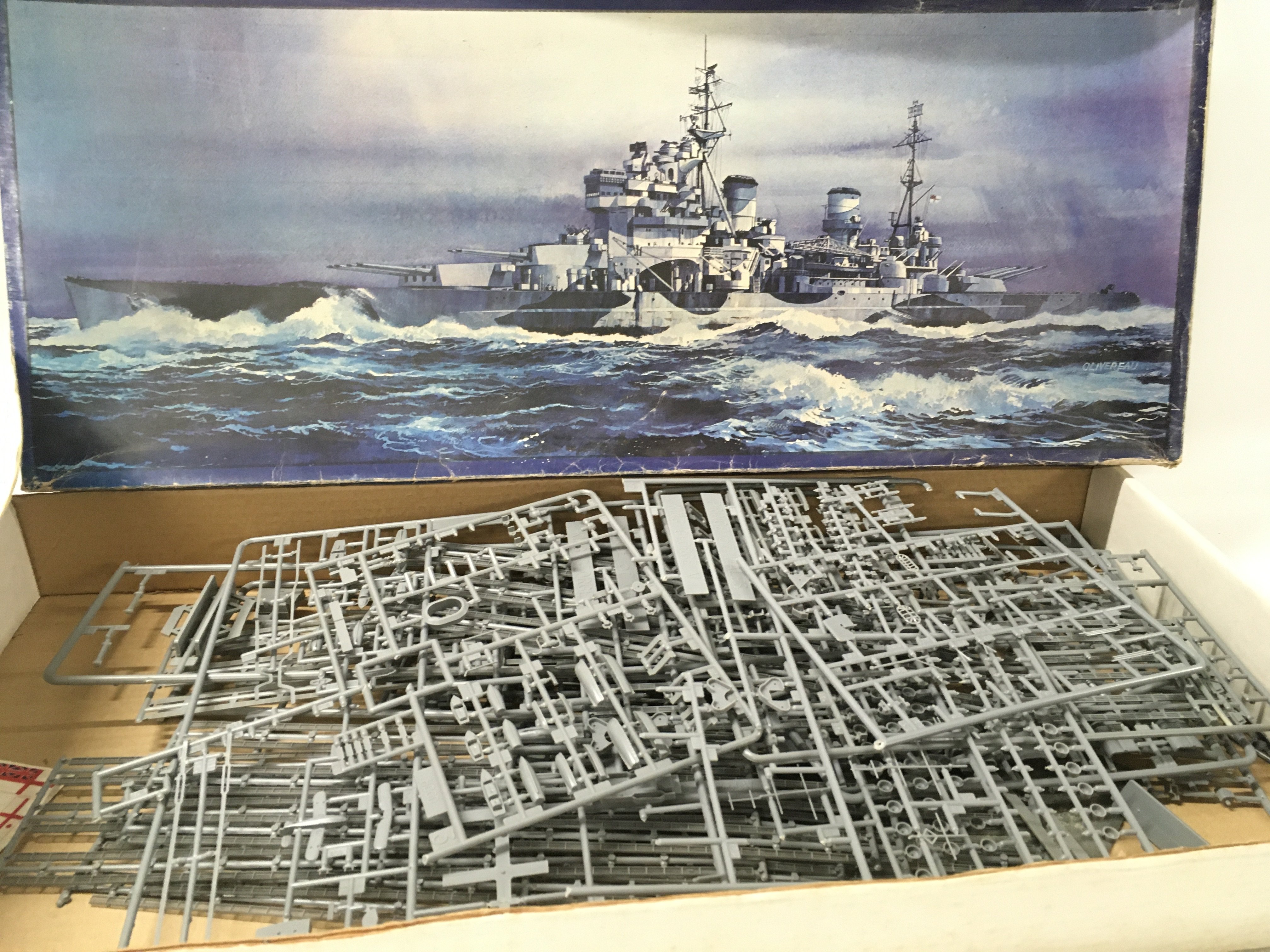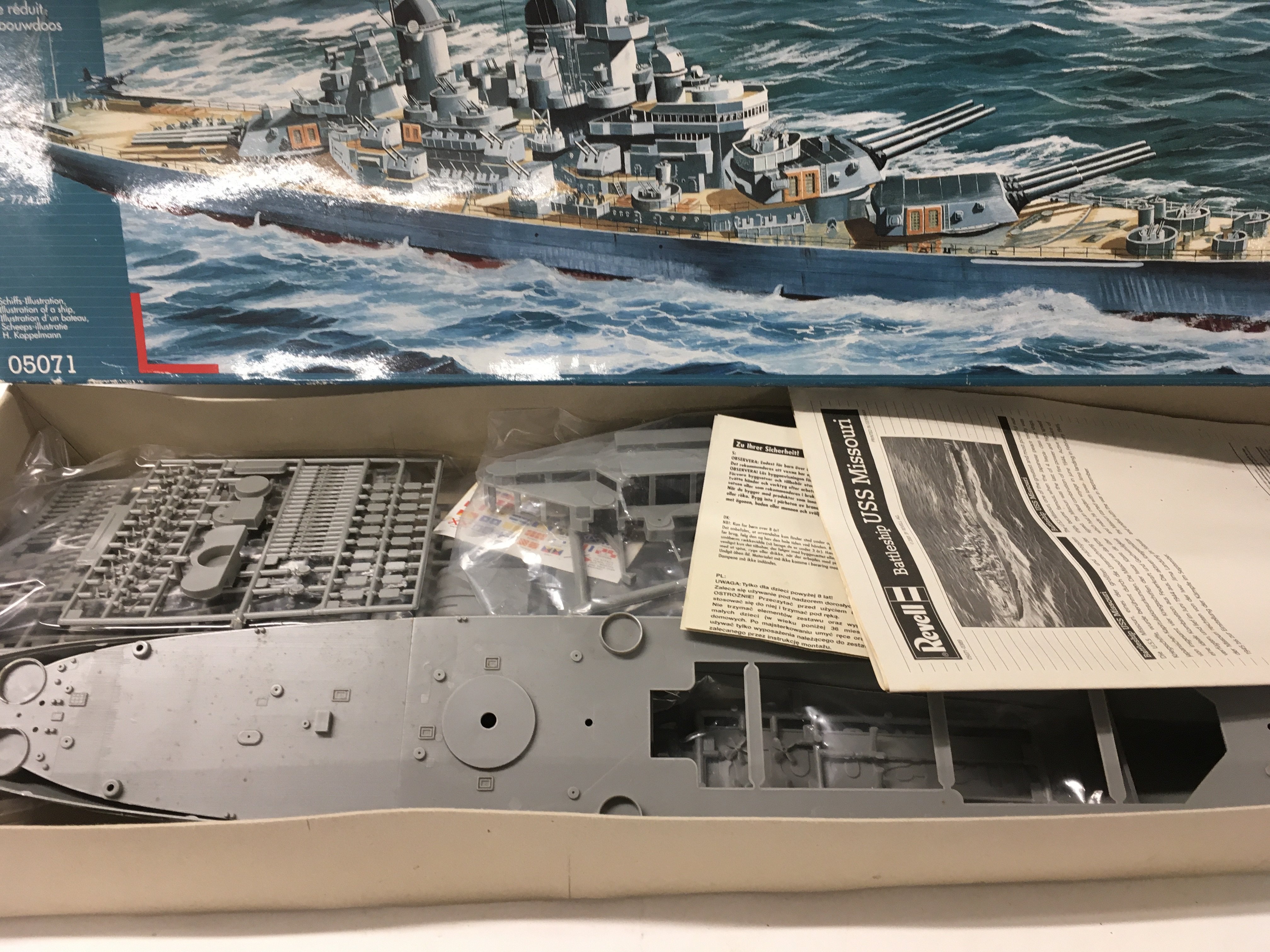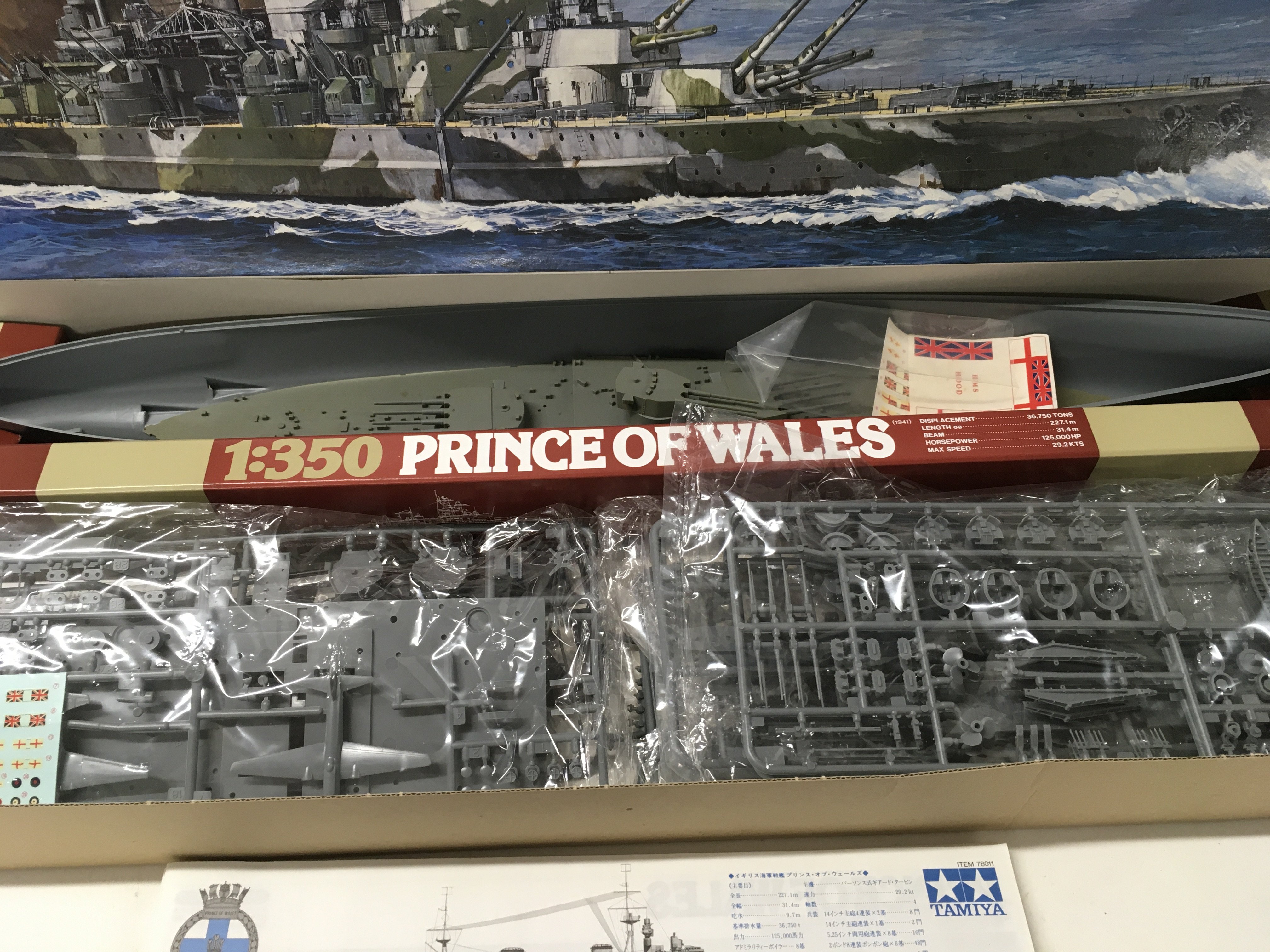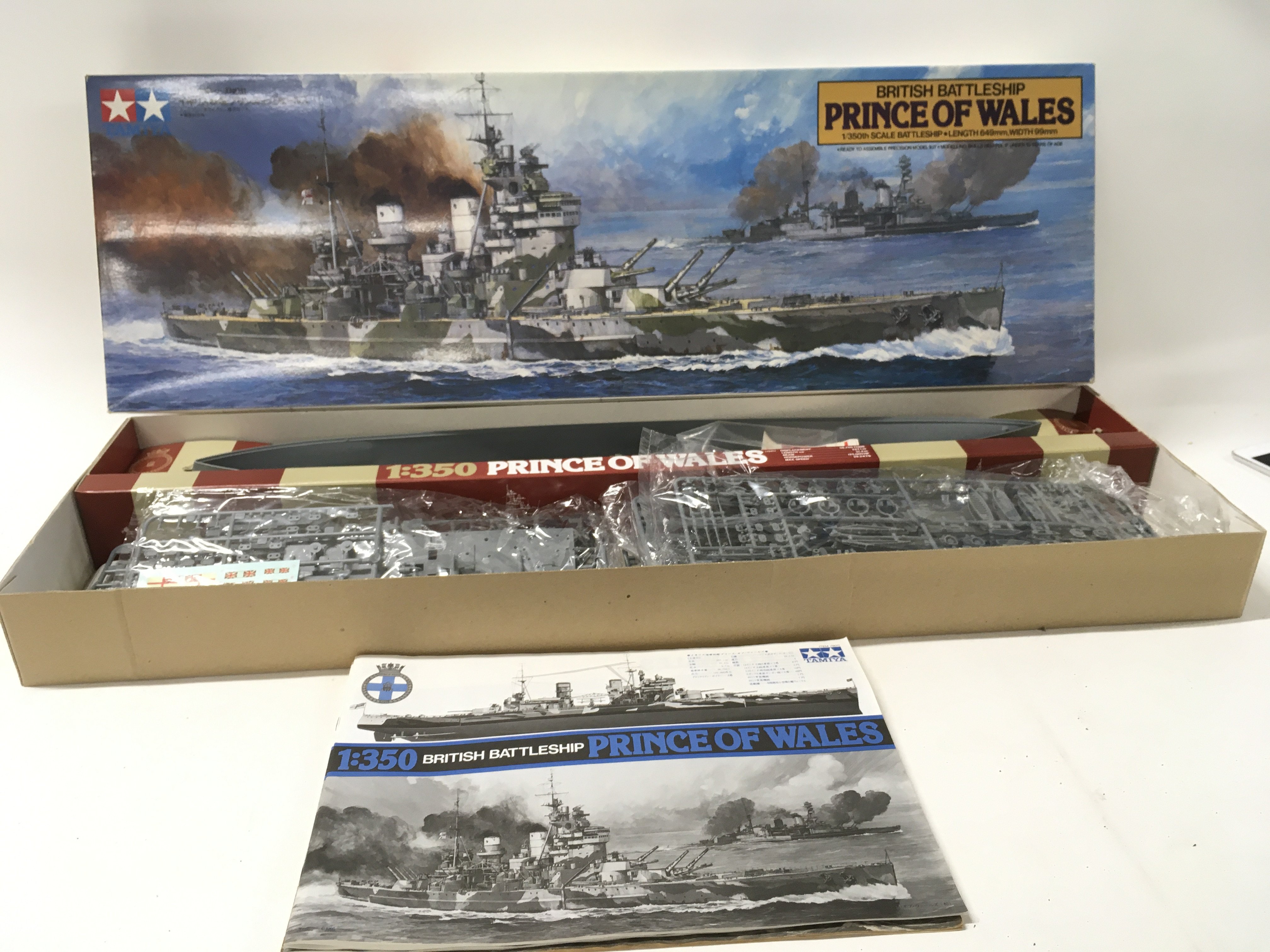 3x boxed warship model kits includes Cruiser HMS KING GEORGE V by Heller..incomplete.. Battleship HMS PRINCE OF WALES. by Tamiya..started….Battleship. USS MISSOURI by Revell. No reserve. (3)