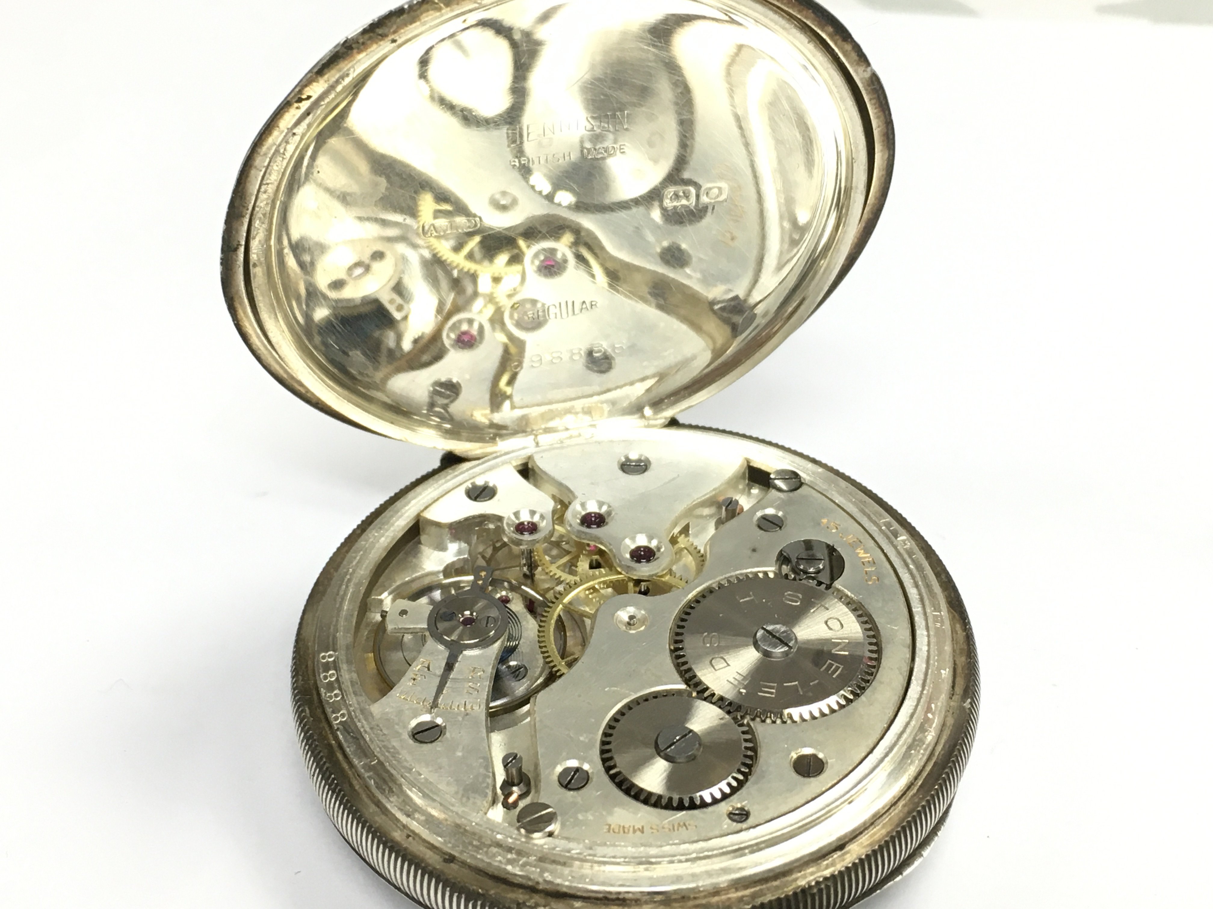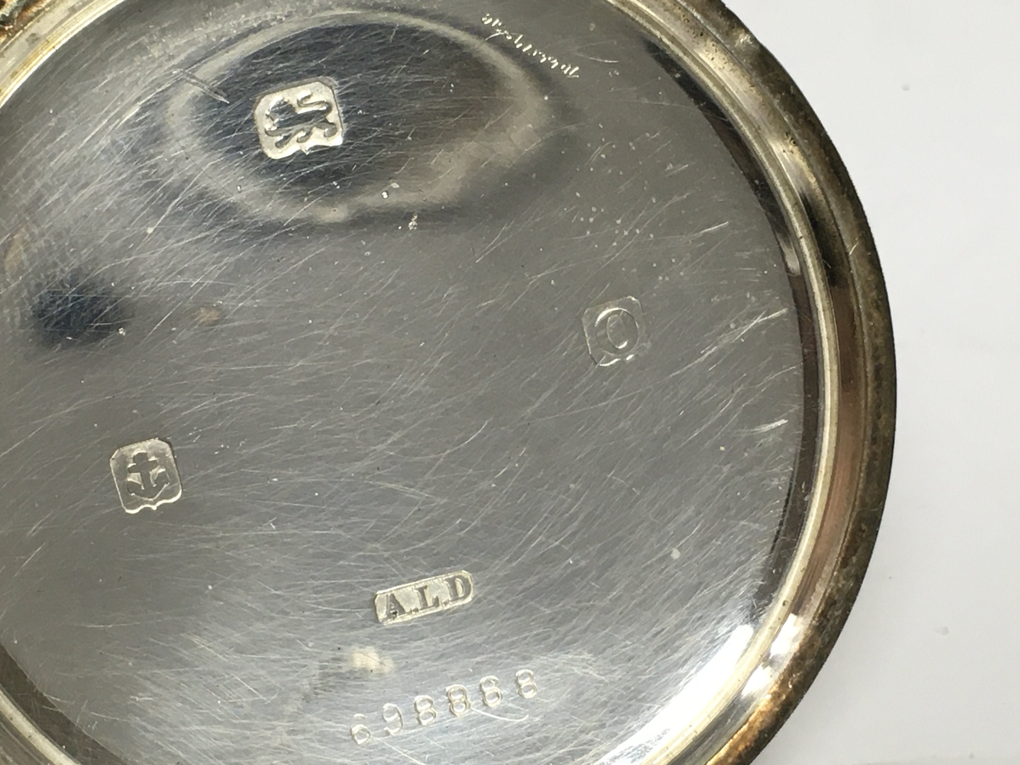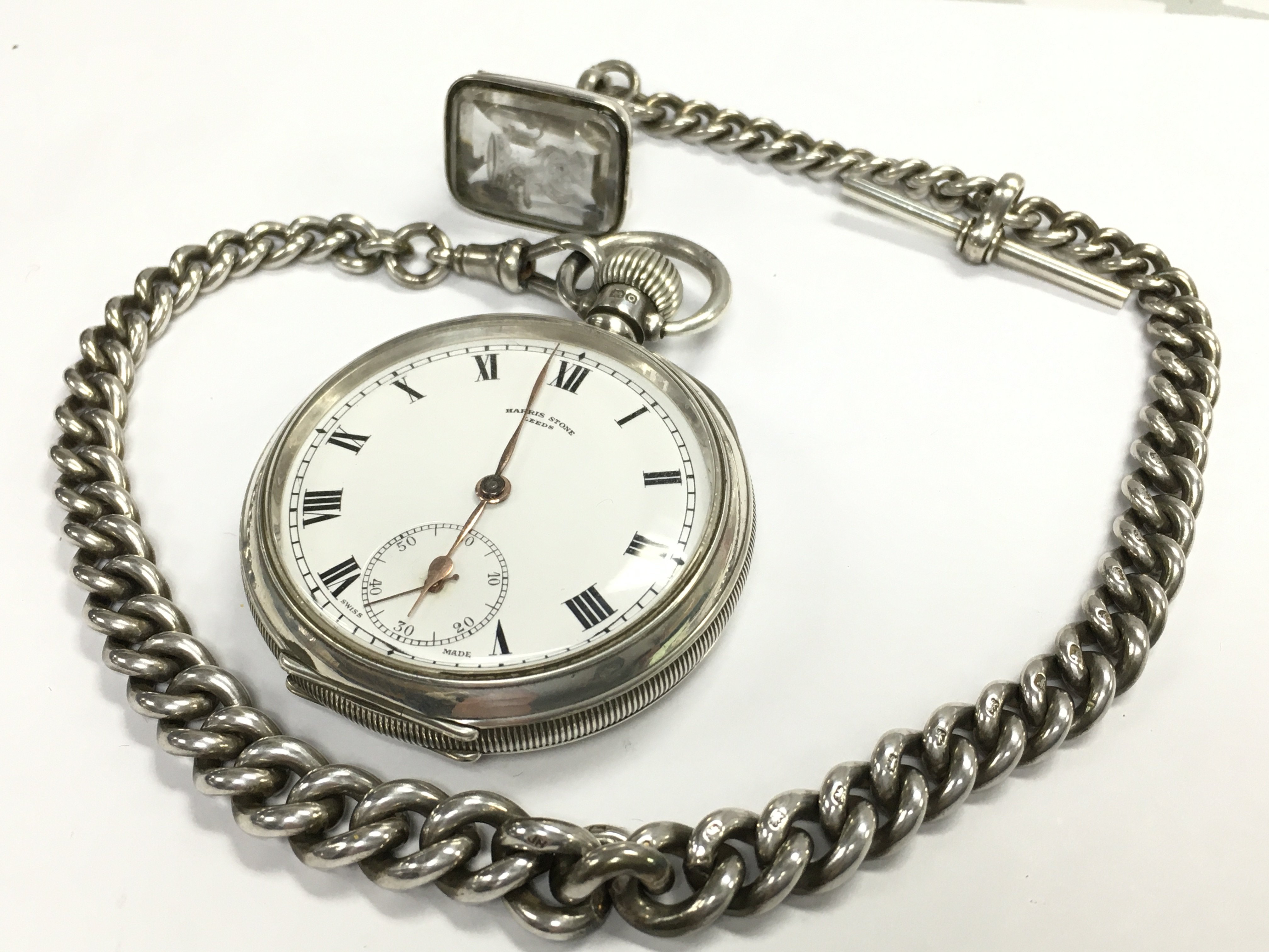 A Harris Stone Leeds silver hallmarked cased button wind 15 jewels pocket watch with silver chain and fob , seen working. Postage category a