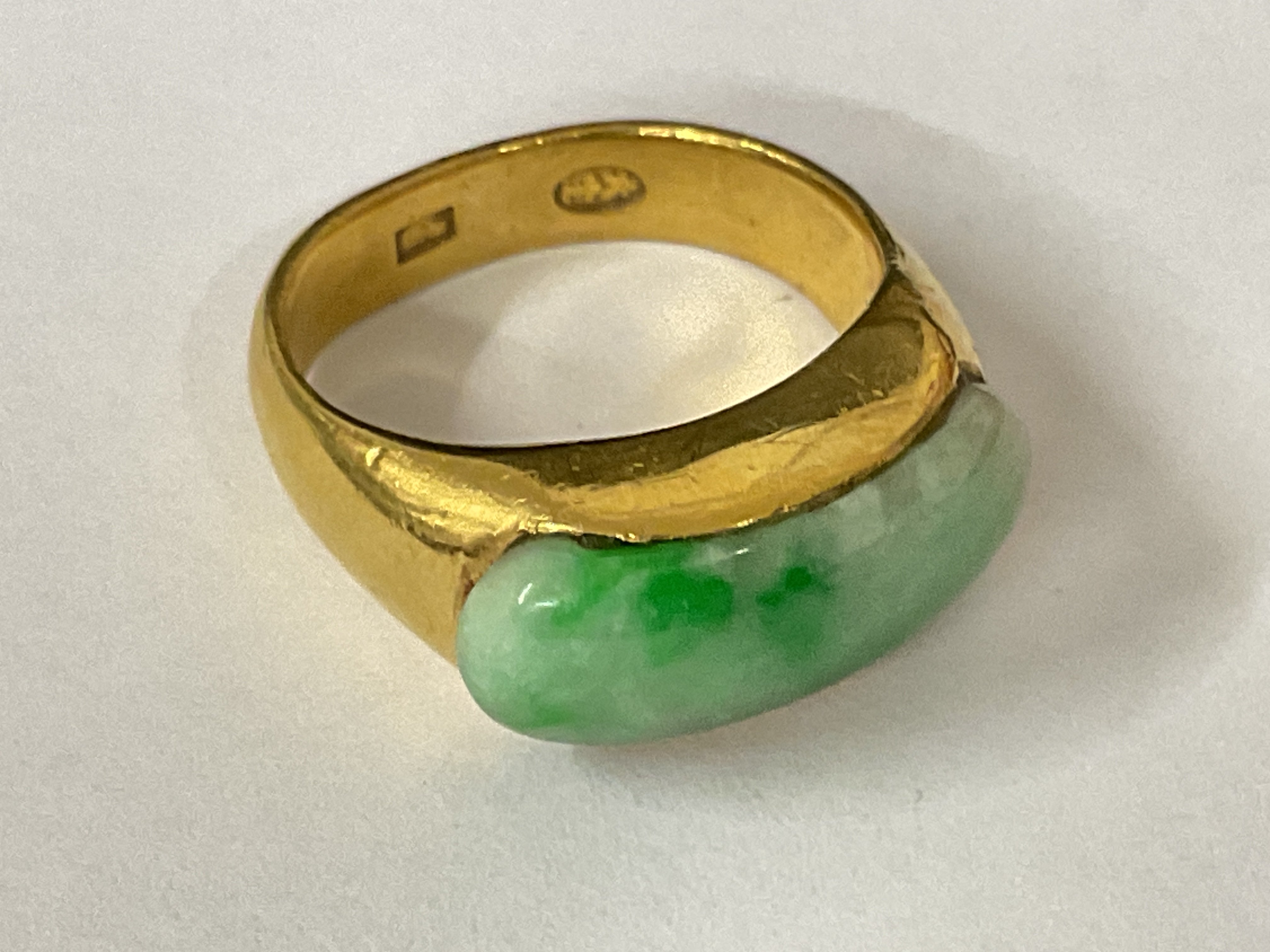 High ct gold ring inset with Jade and oriental hallmarks, approx 10.12g, ring size approx M, postage category A.