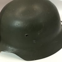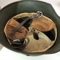 A German Third Reich steel helmet appearing to be original green paint no decal the back edge with an Applied original fitting and with liner no inner edge stamp marks.