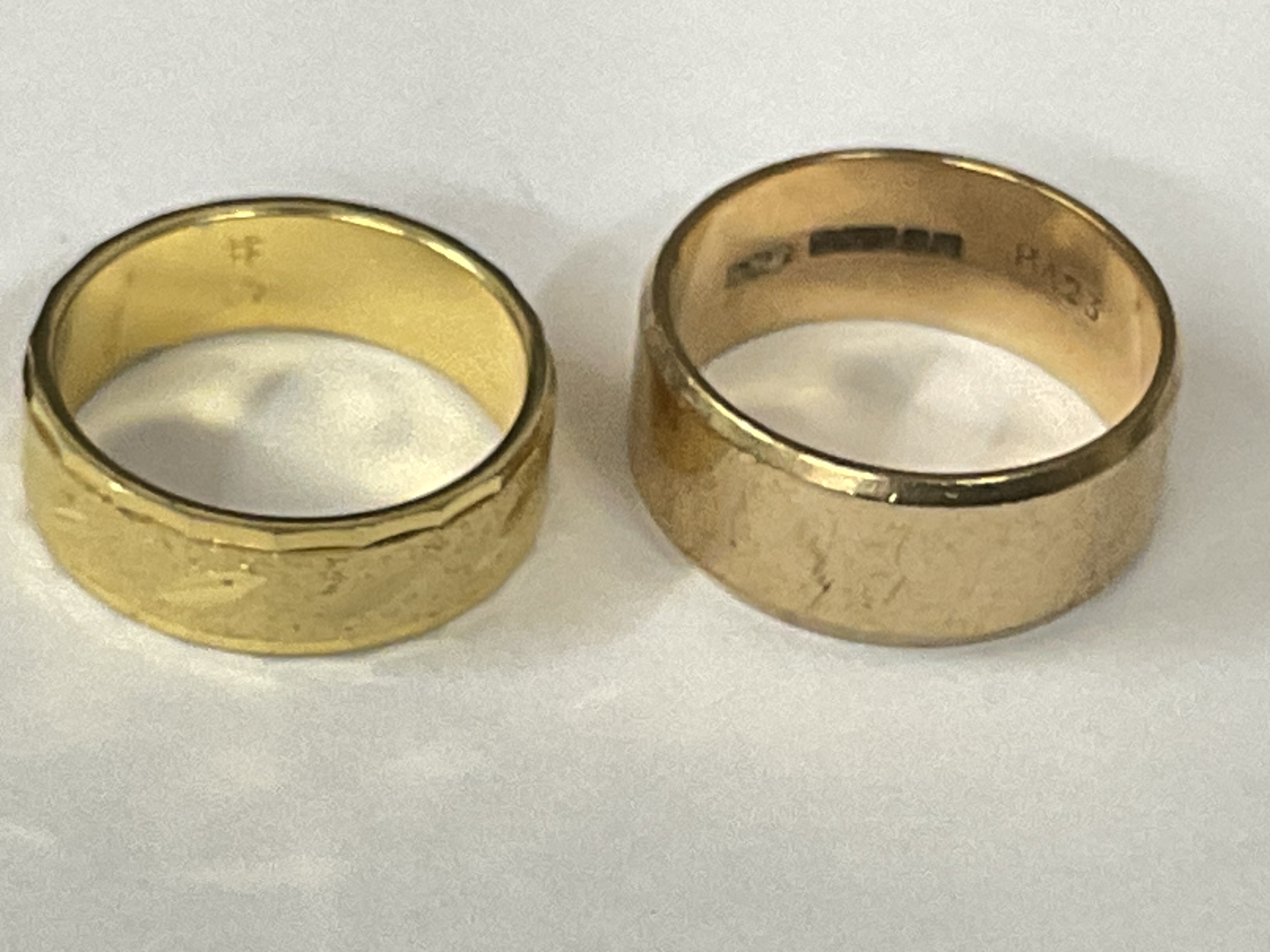 Two 9ct gold bands, approx 8.01g, approx ring size L and N, postage category A.