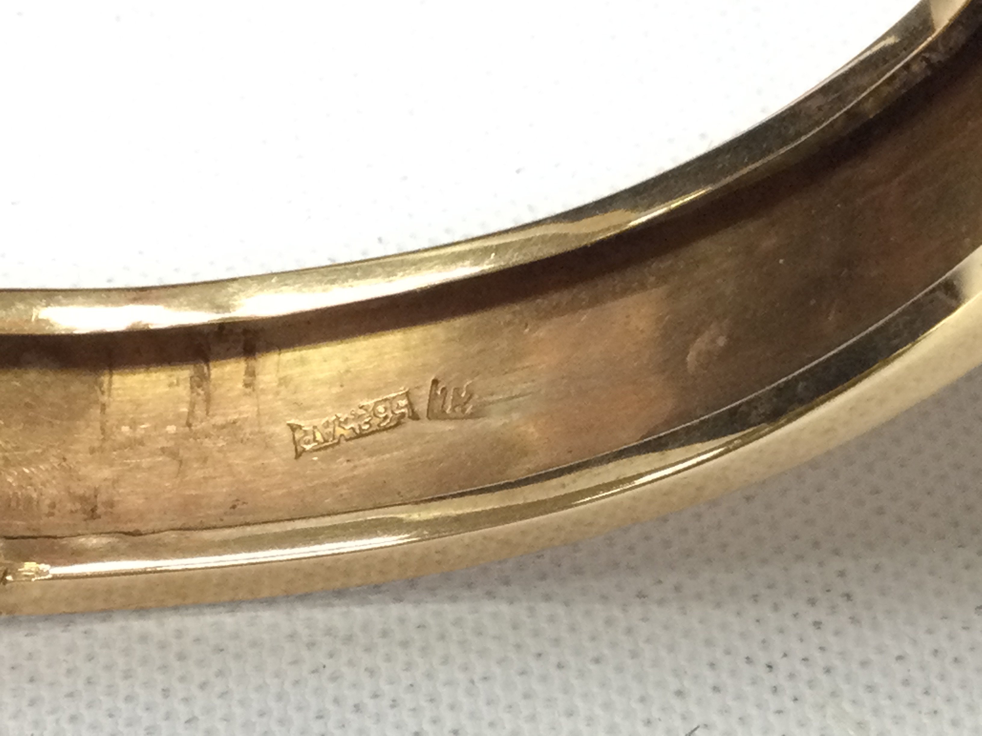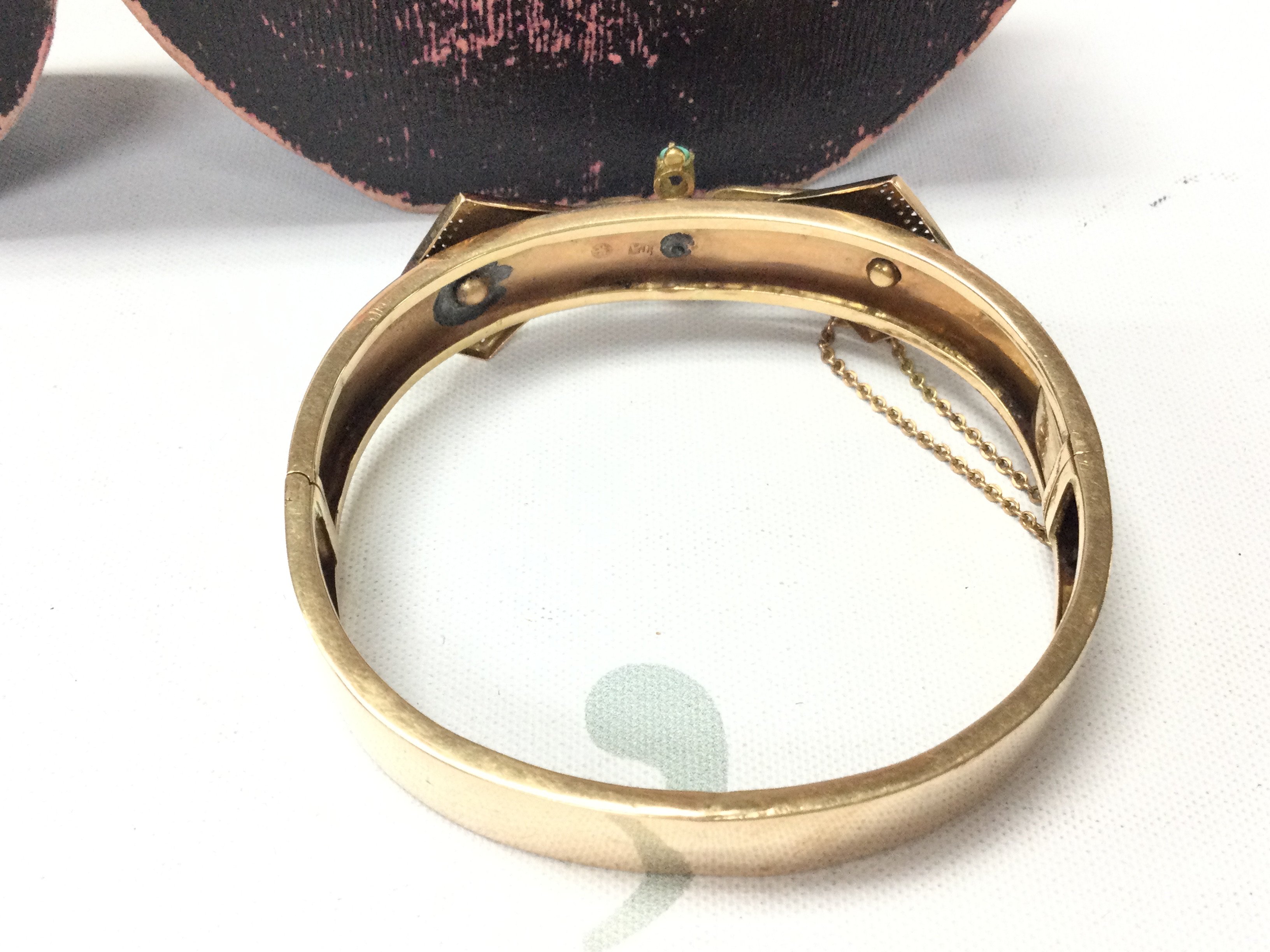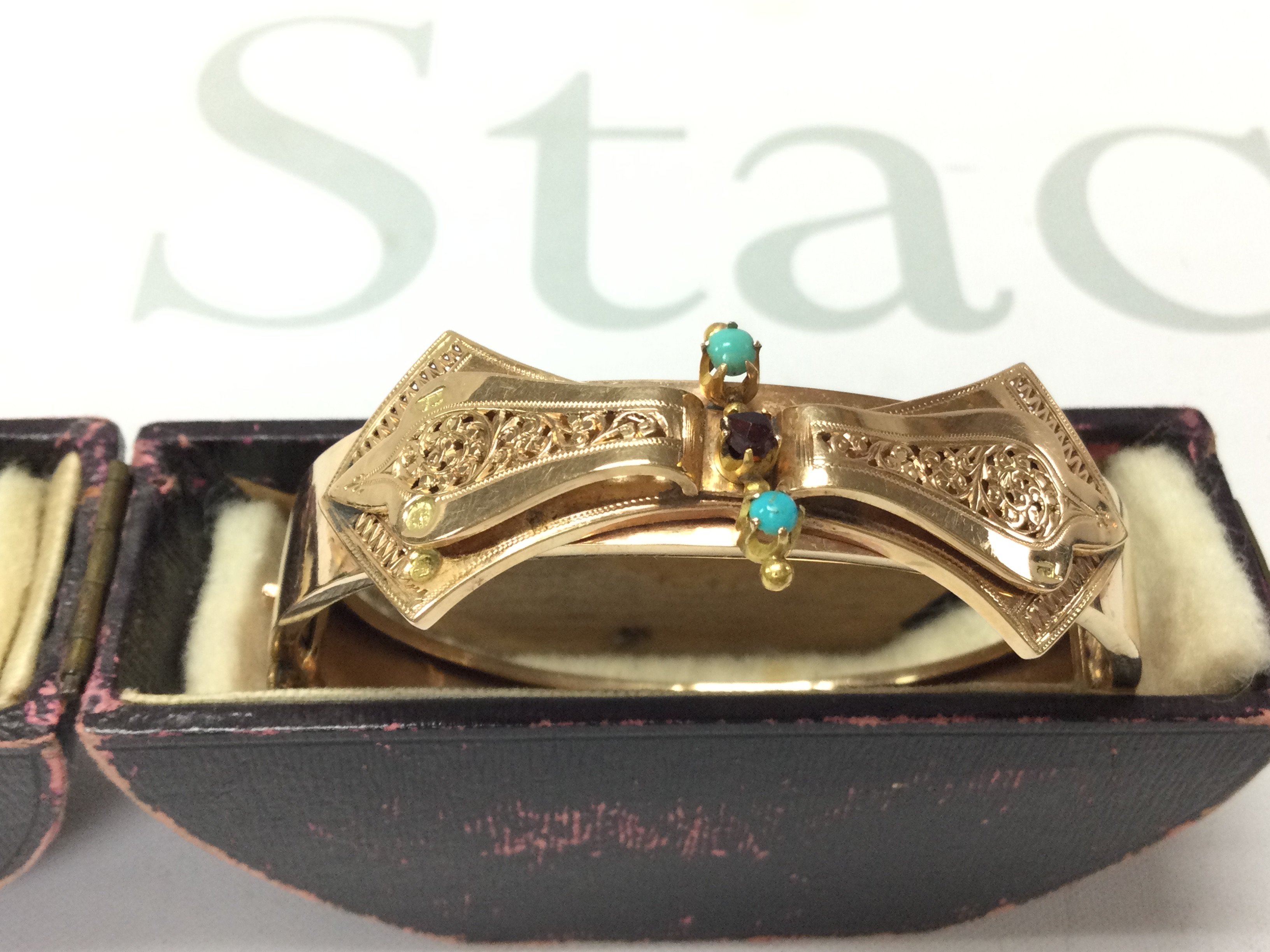 A 15ct gold Russian bangle inset with garnet and turquoise. 15.42g and approx 6cm diameter.