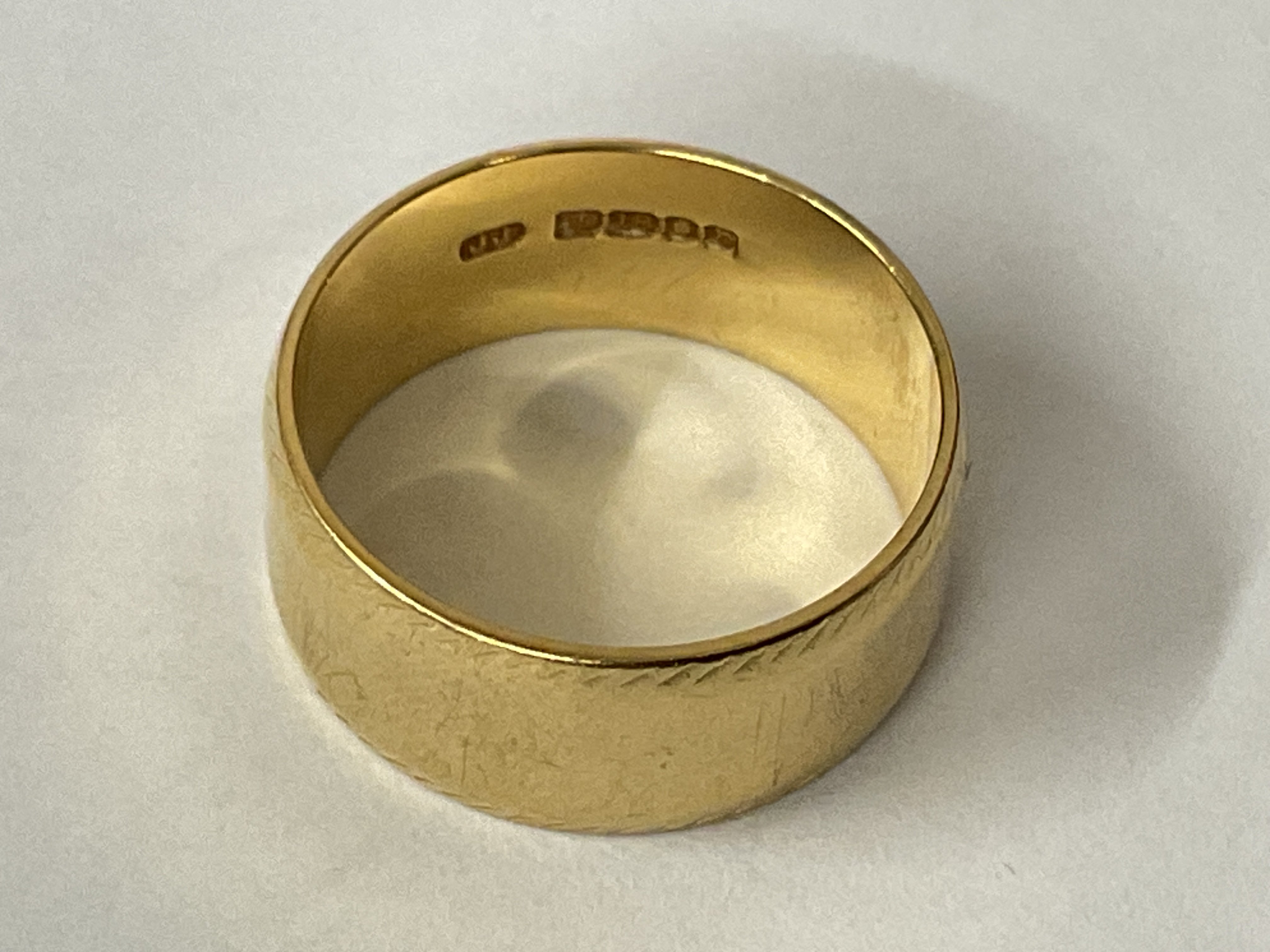 18ct gold wedding band, approx 6.43g, approx ring size O, postage category A.