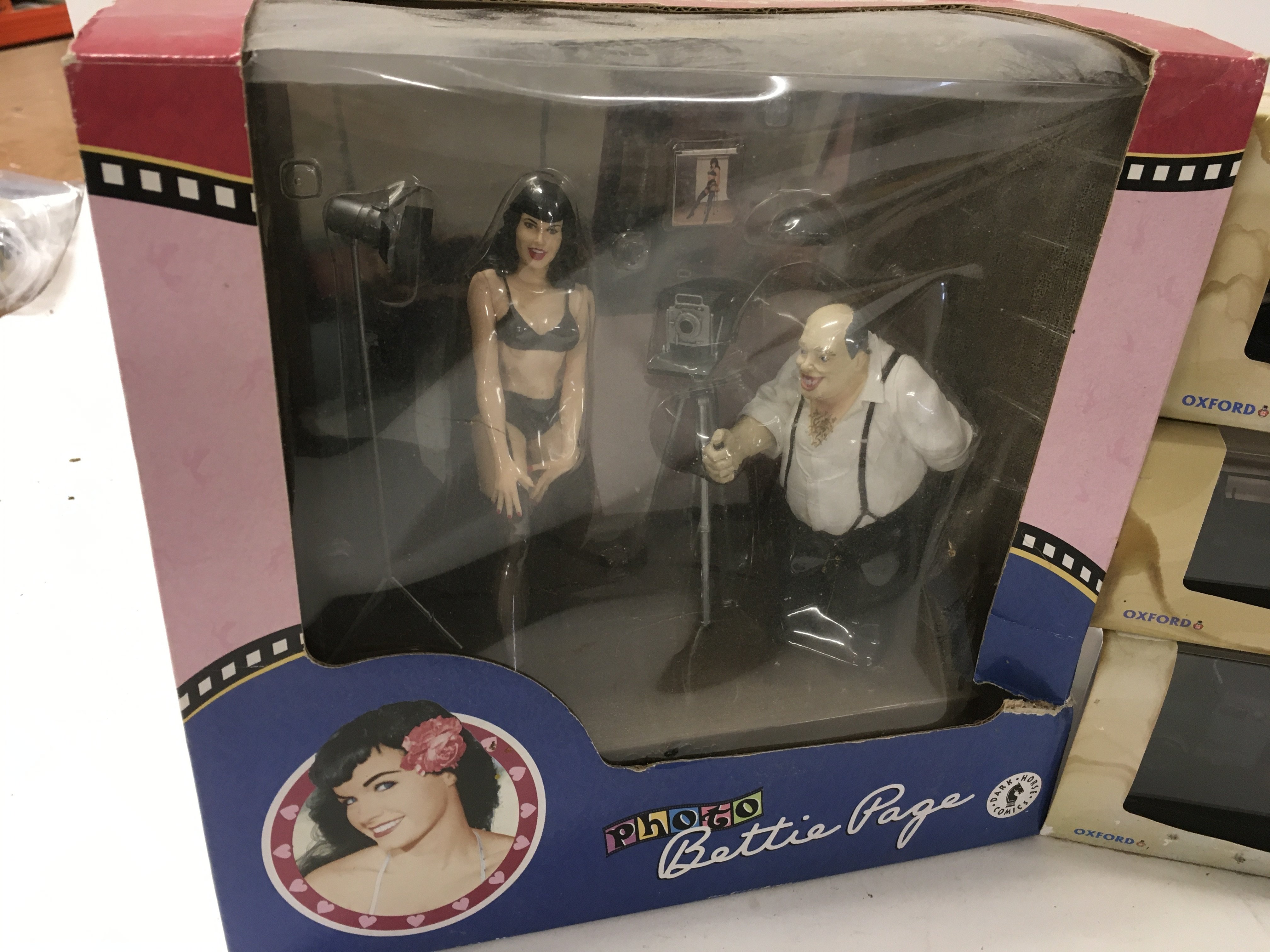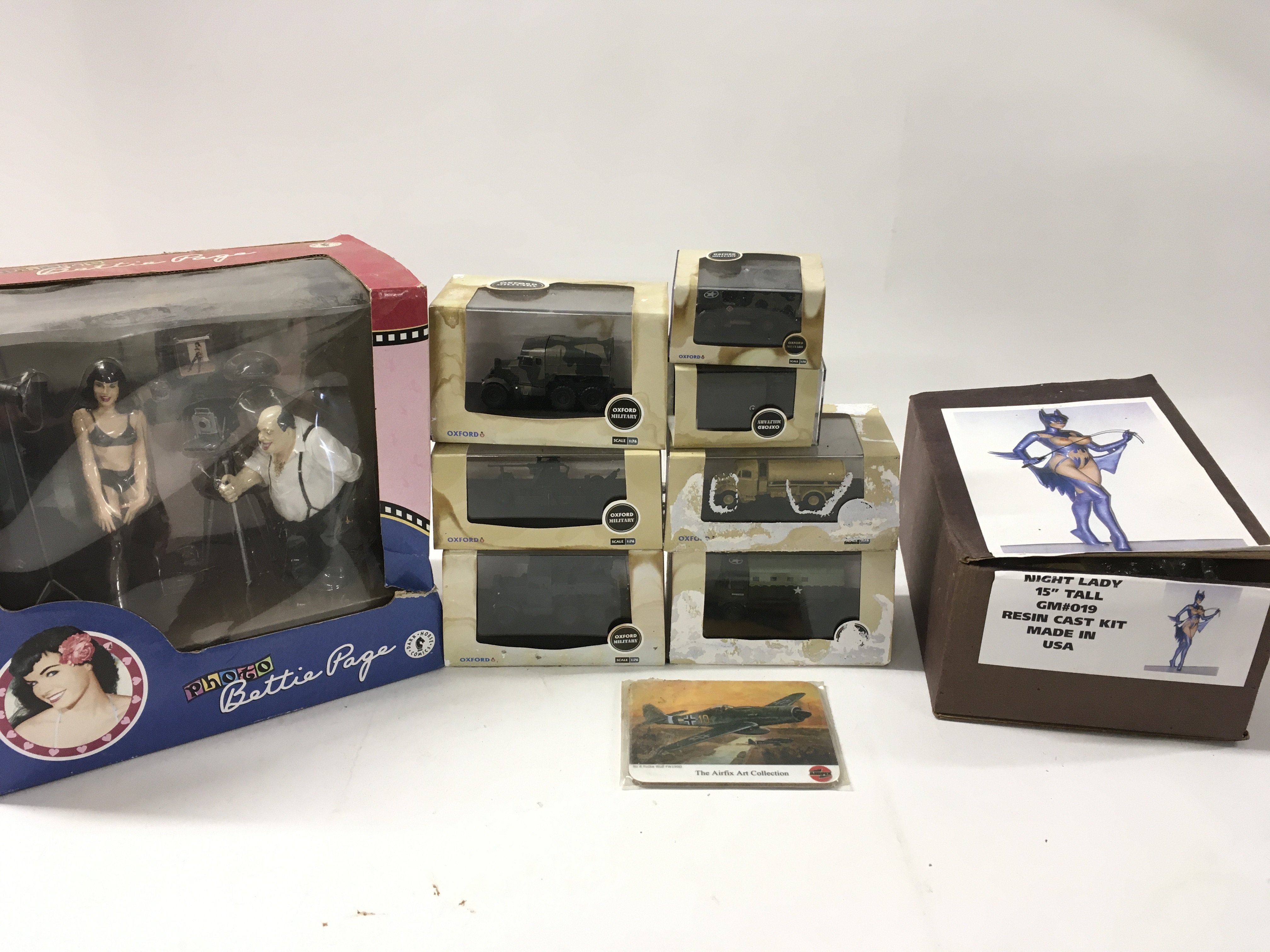 A mixed collection of models featuring boxed Oxford military vehicles..a Dark Horse Comic boxed model scene titled photo Bettie Page. Also includes a boxed kit titled NIGHT LADY. 15inches tall. Requires assembling. No reserve.