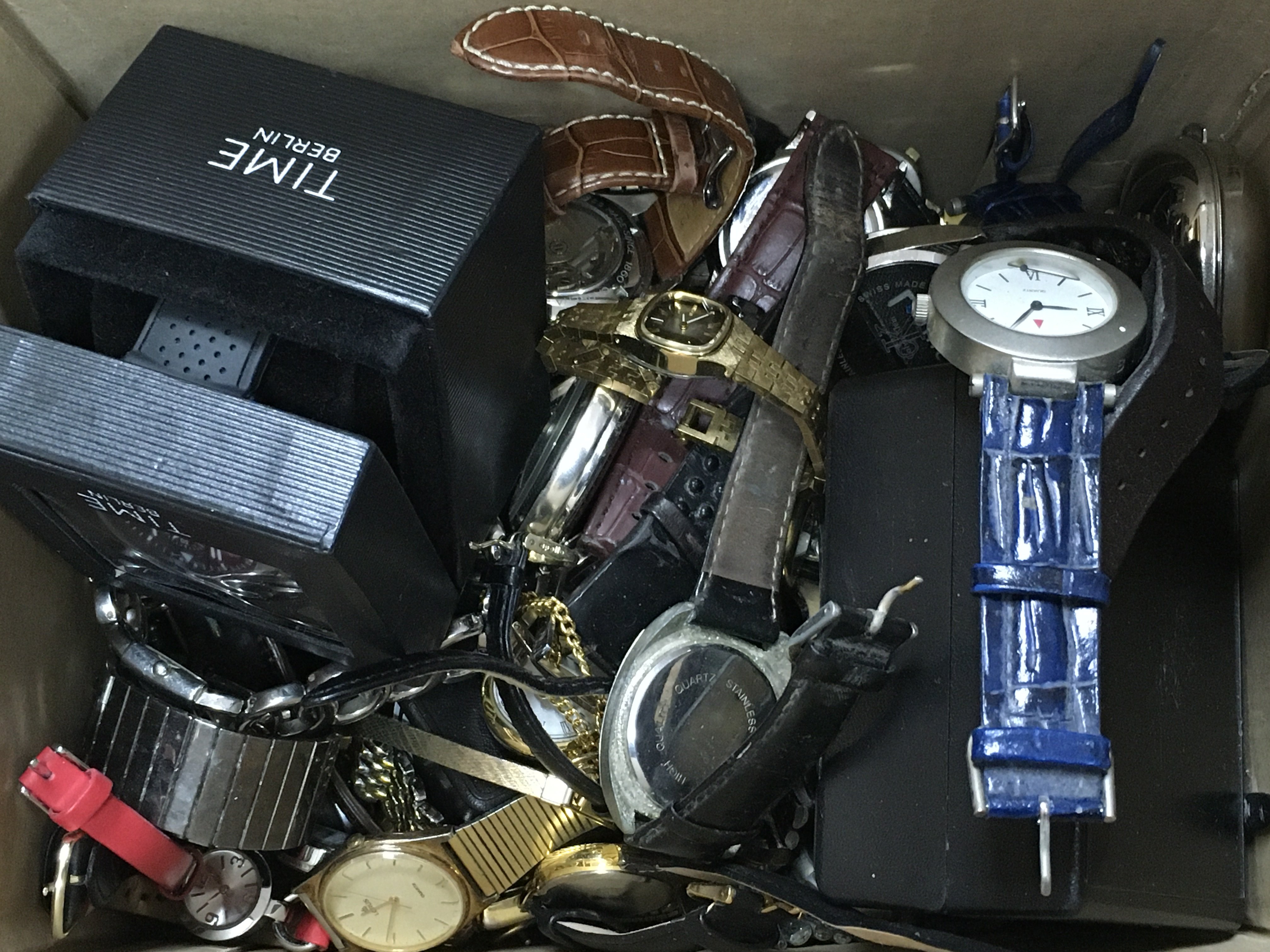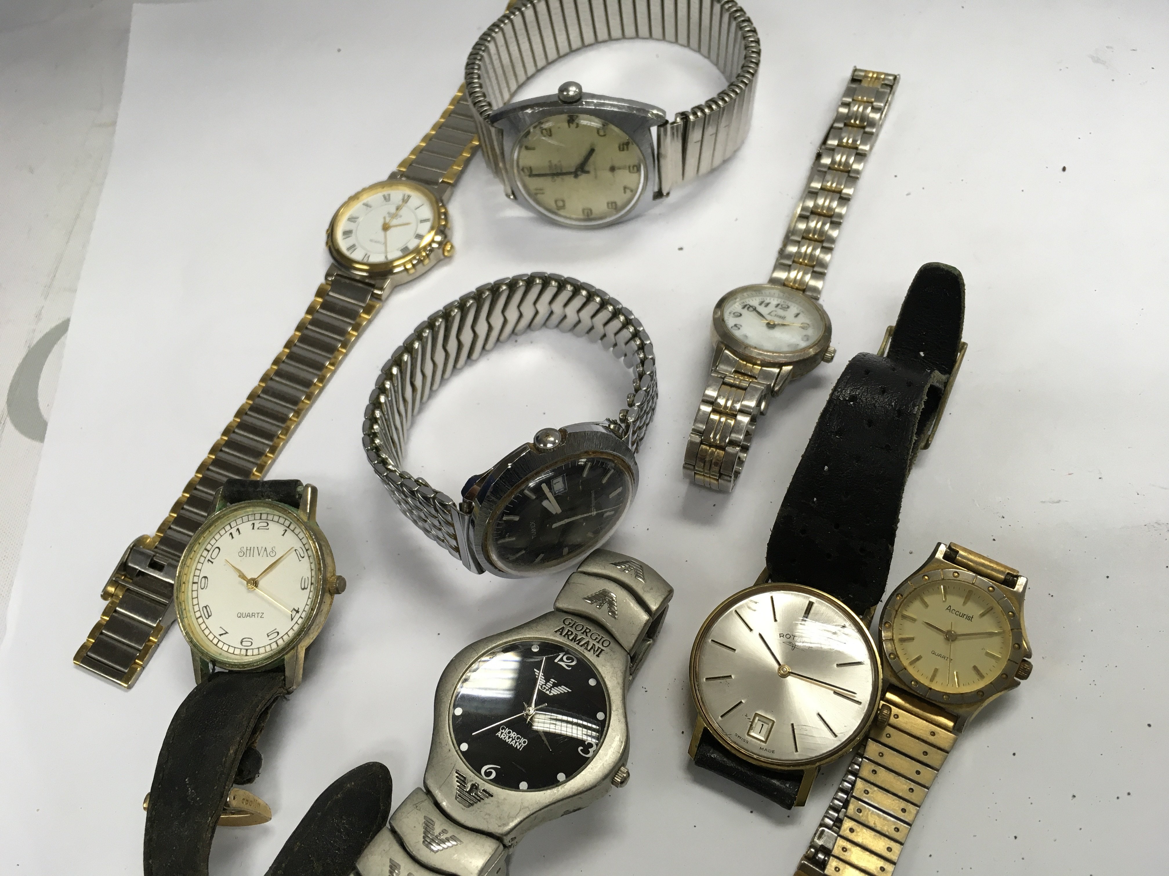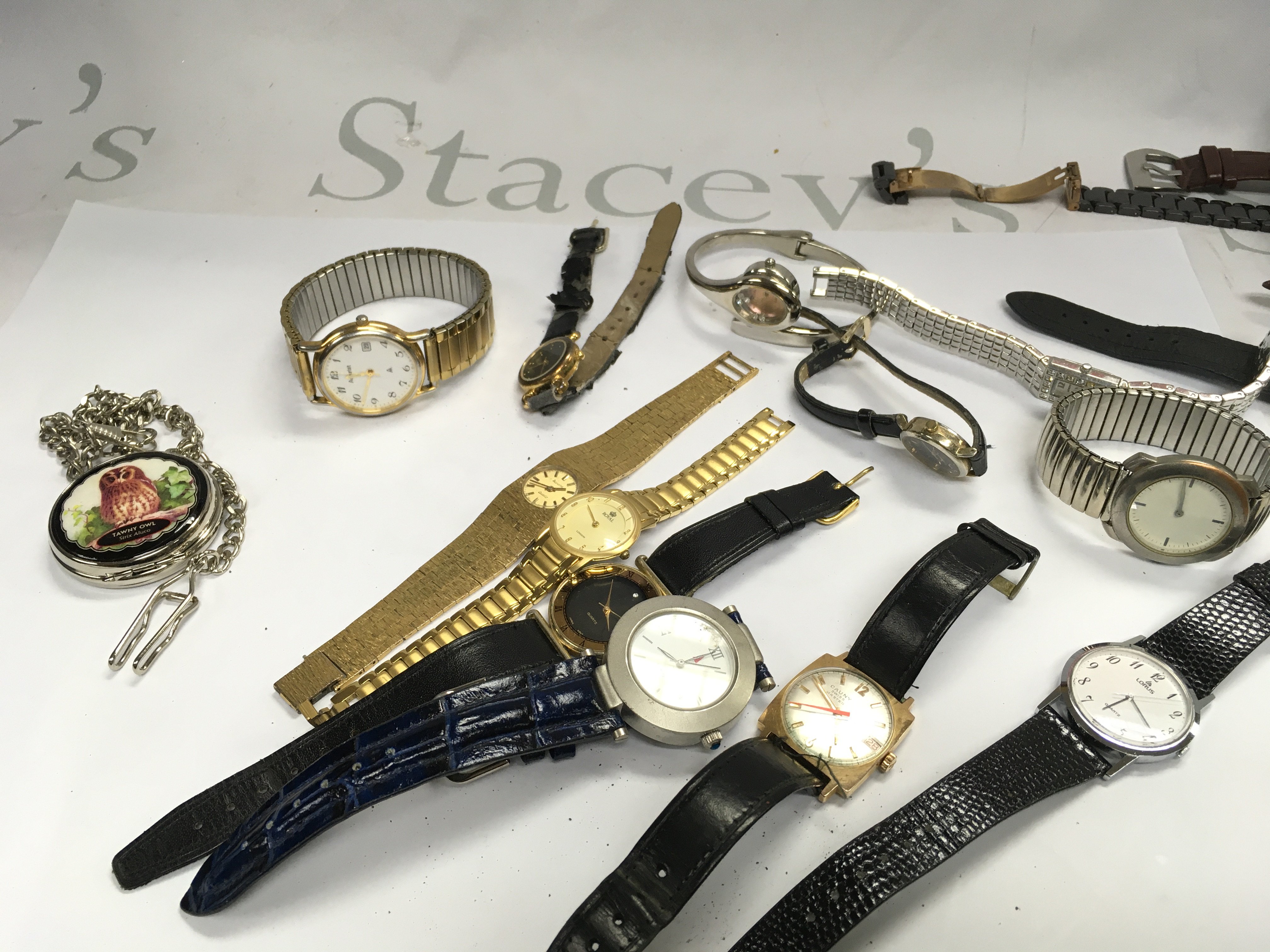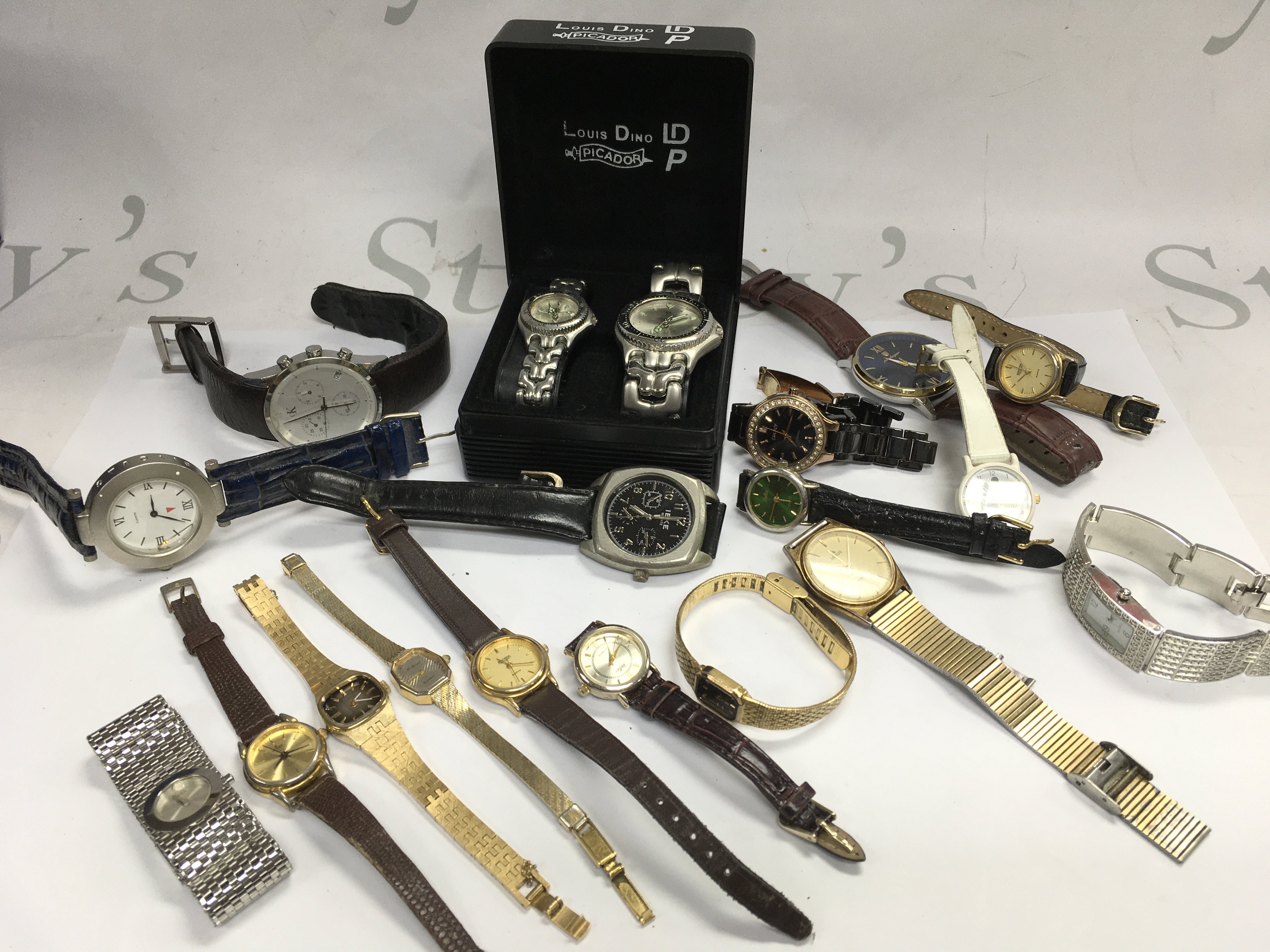 A box of mixed watches including Accurist, Cauny, Lorus, Reflex etc. this lot cannot be posted