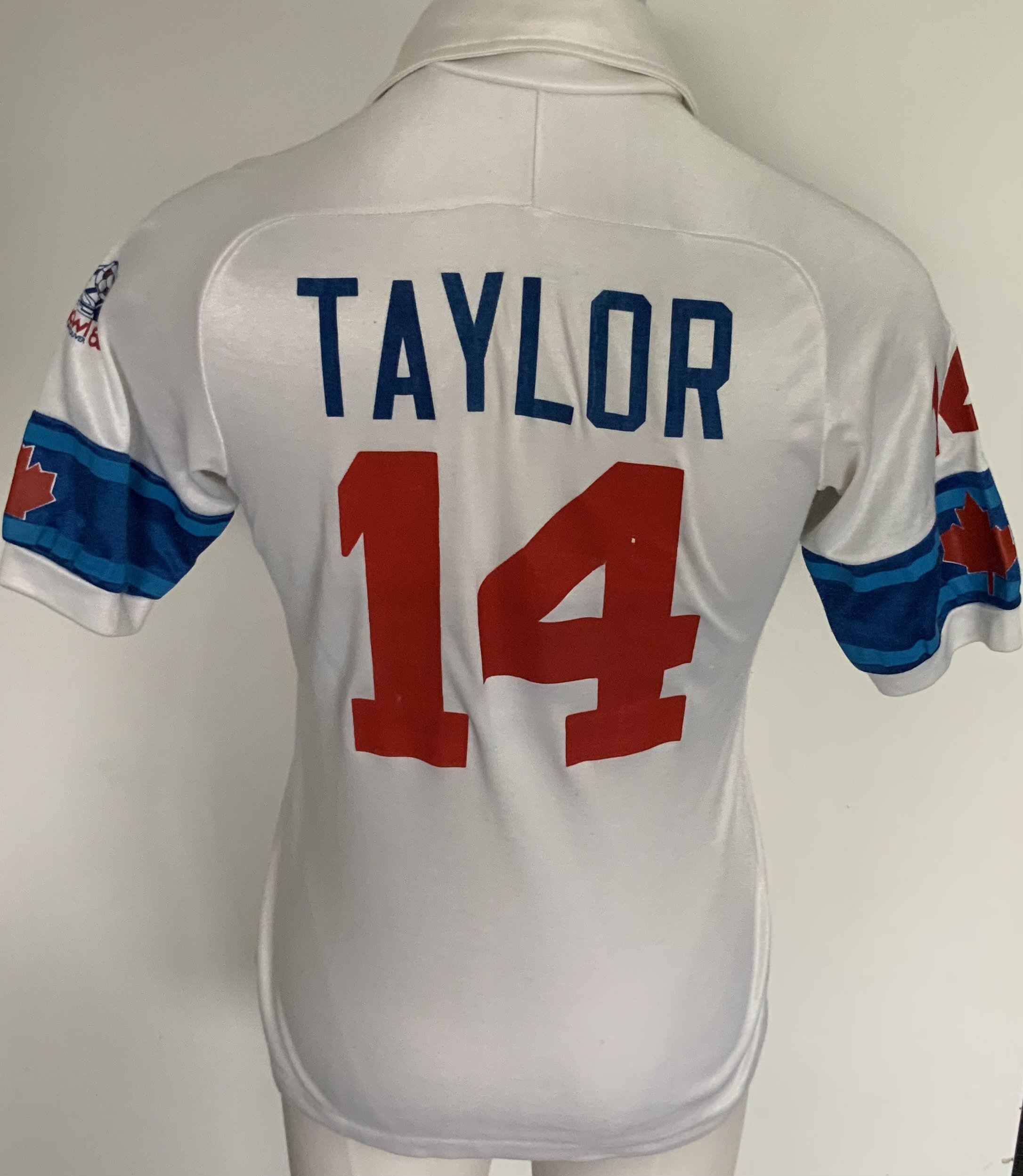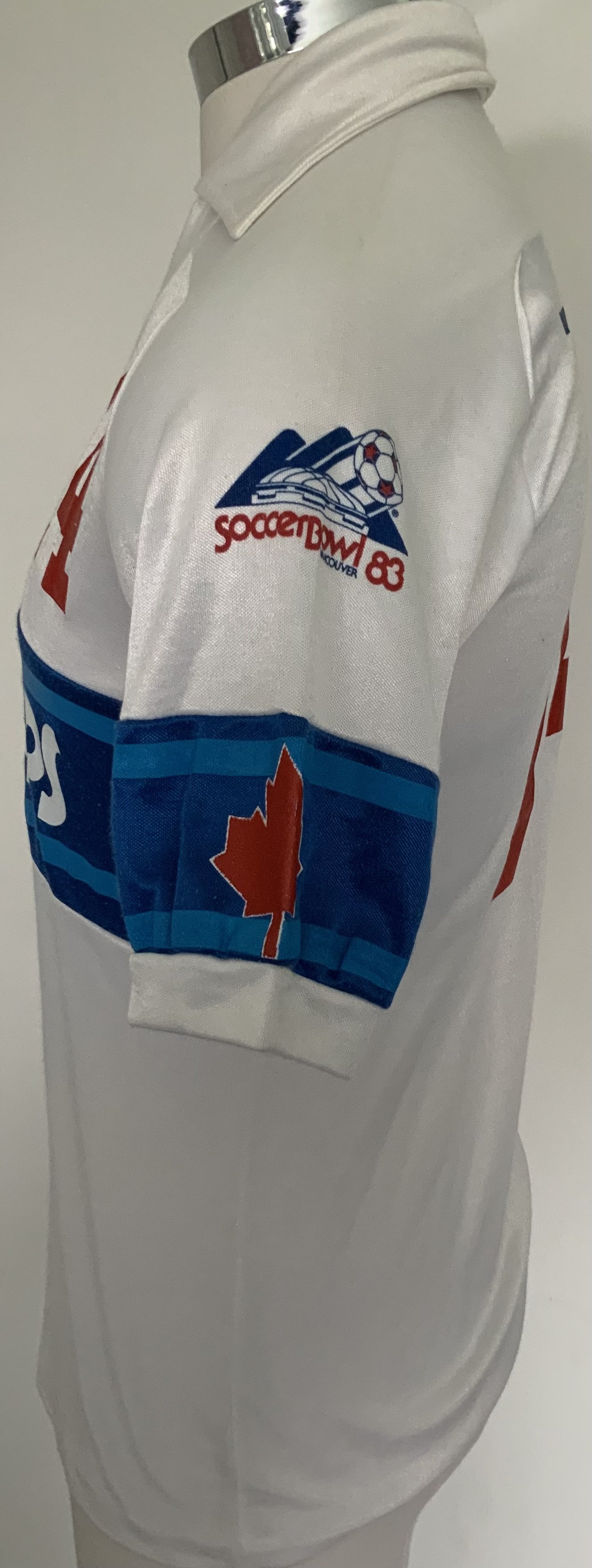 Vancouver Whitecaps 1983 Match Worn Football Shirt: Excellent condition very rare home shirt made by Nike. Number 14 to front rear and sleeves. Both sleeves have the Canadian flag and one had an advert for Super Bowl 83 in Vancouver. Medium size attractive shirt has Taylor to rear