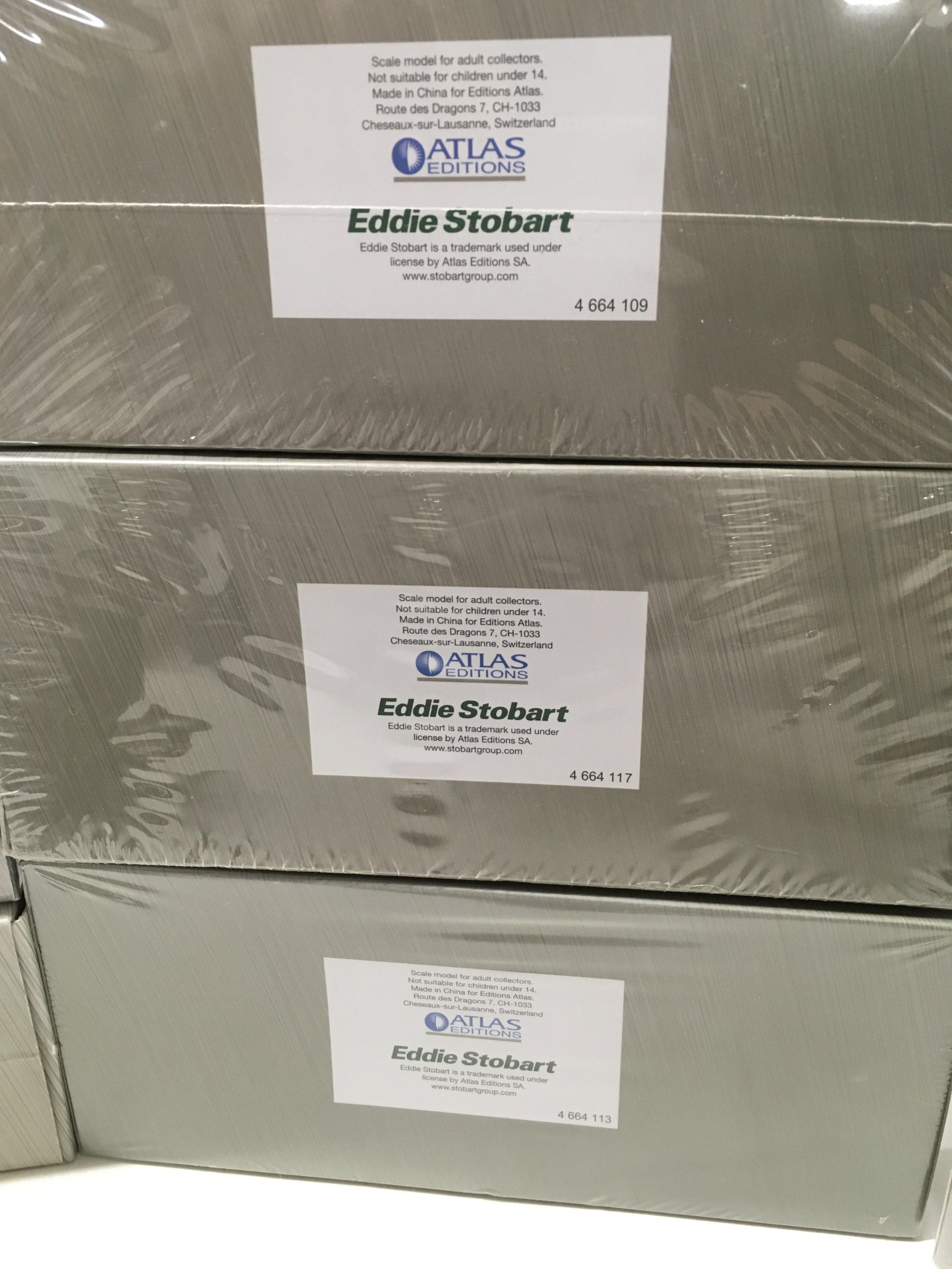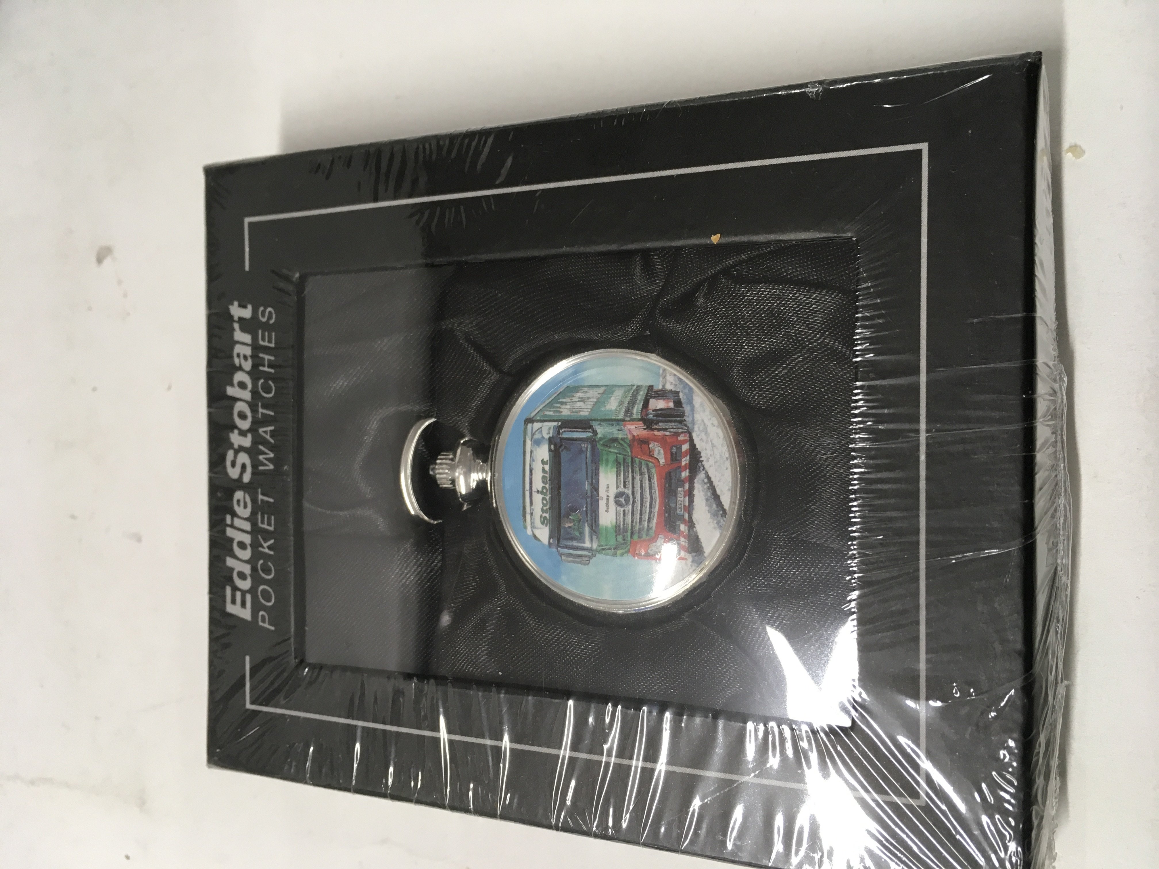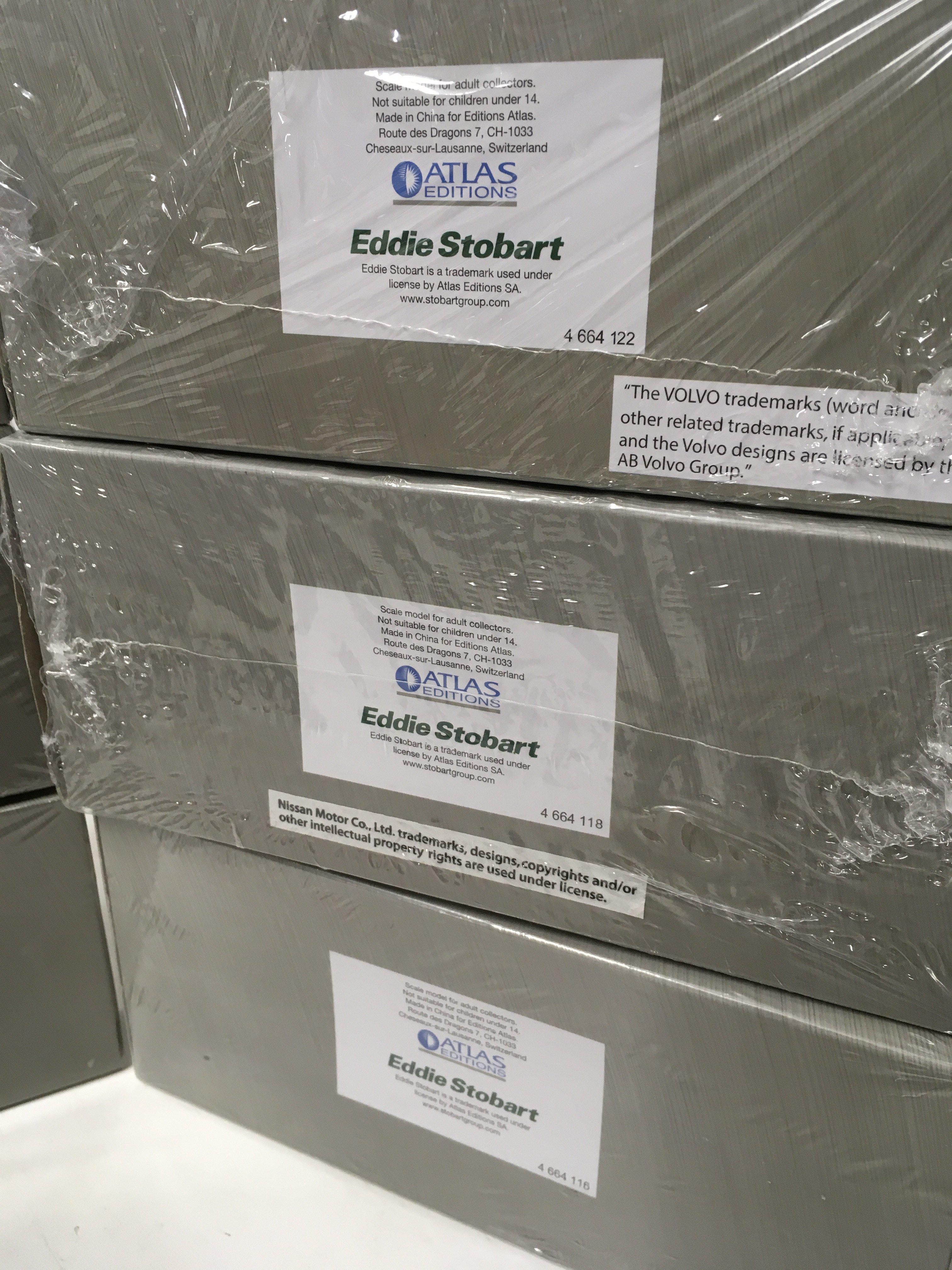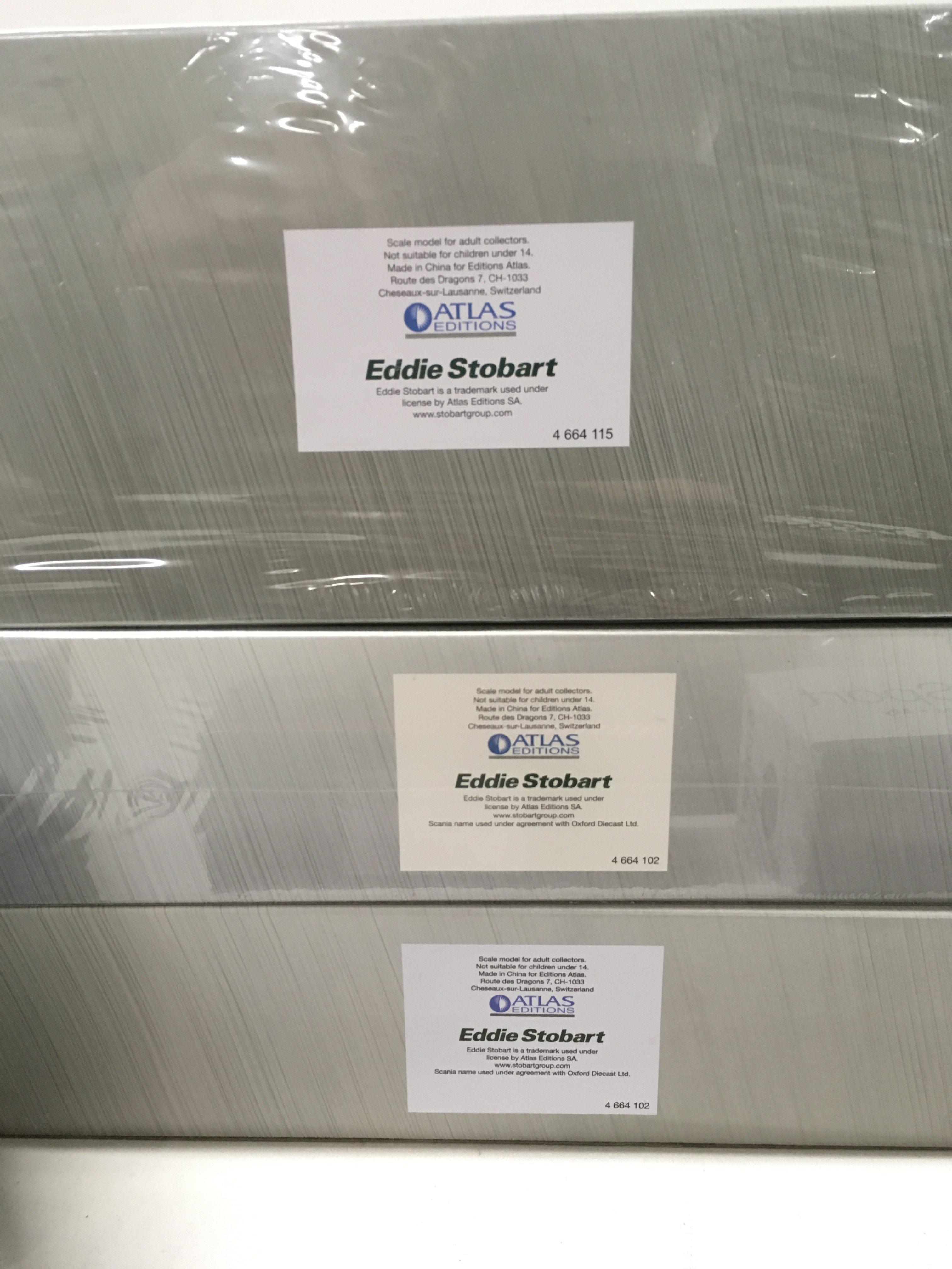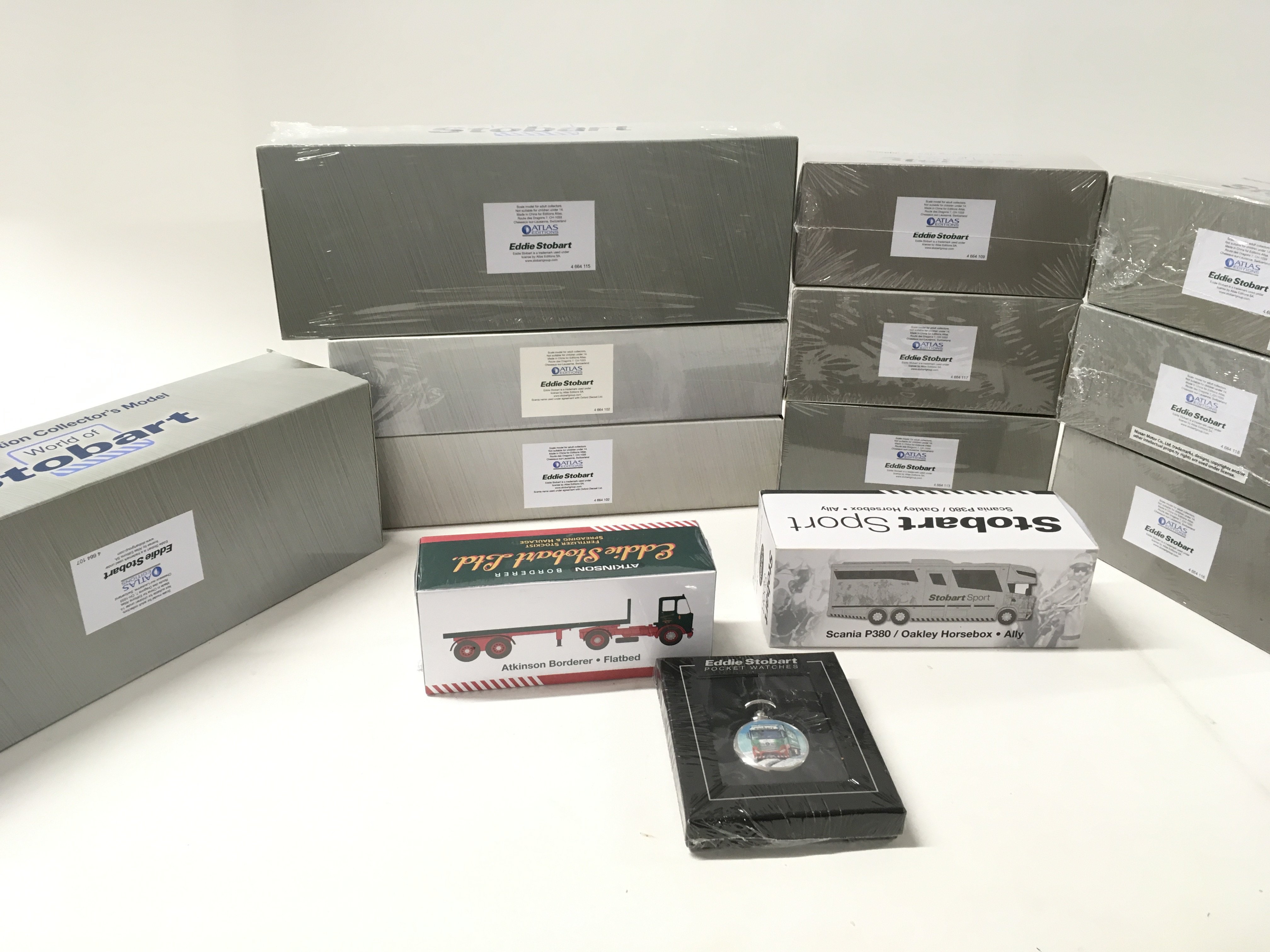 A collection of 12 boxed diecast model commercial vehicles by Atlas all themed Eddie Stobart. Mainly sealed with original plastic film. Includes sealed Eddie Stobart pocket watch.