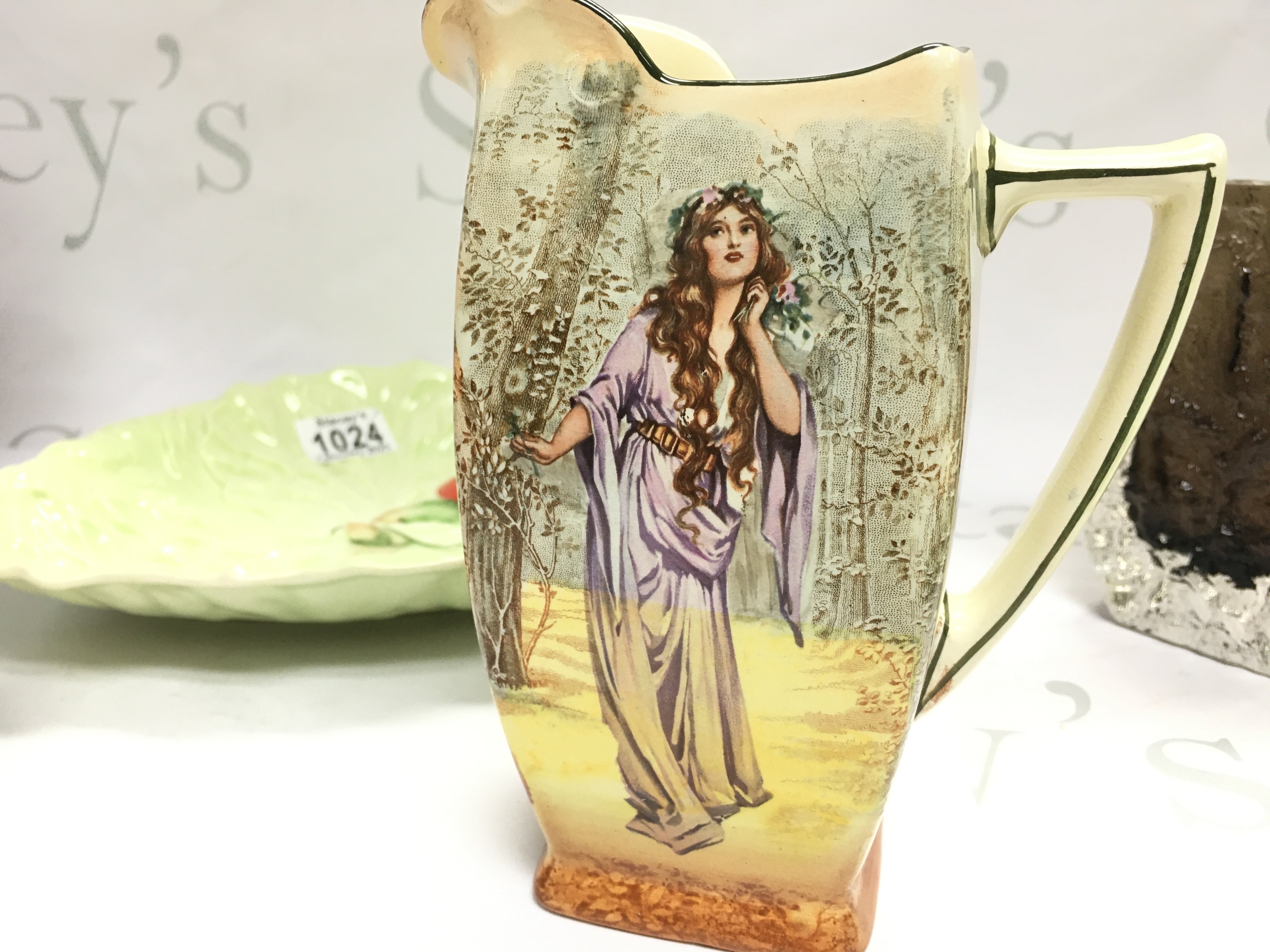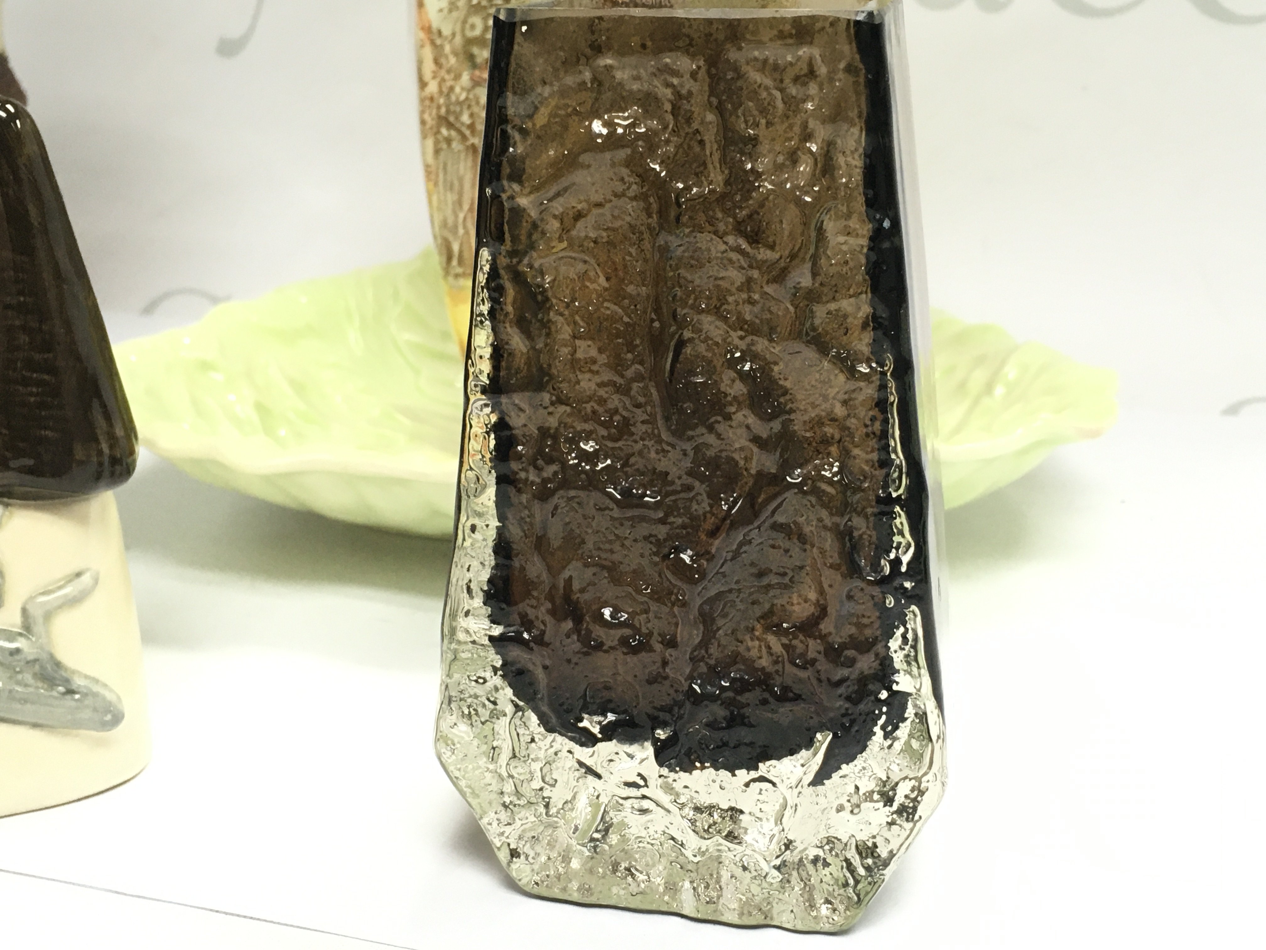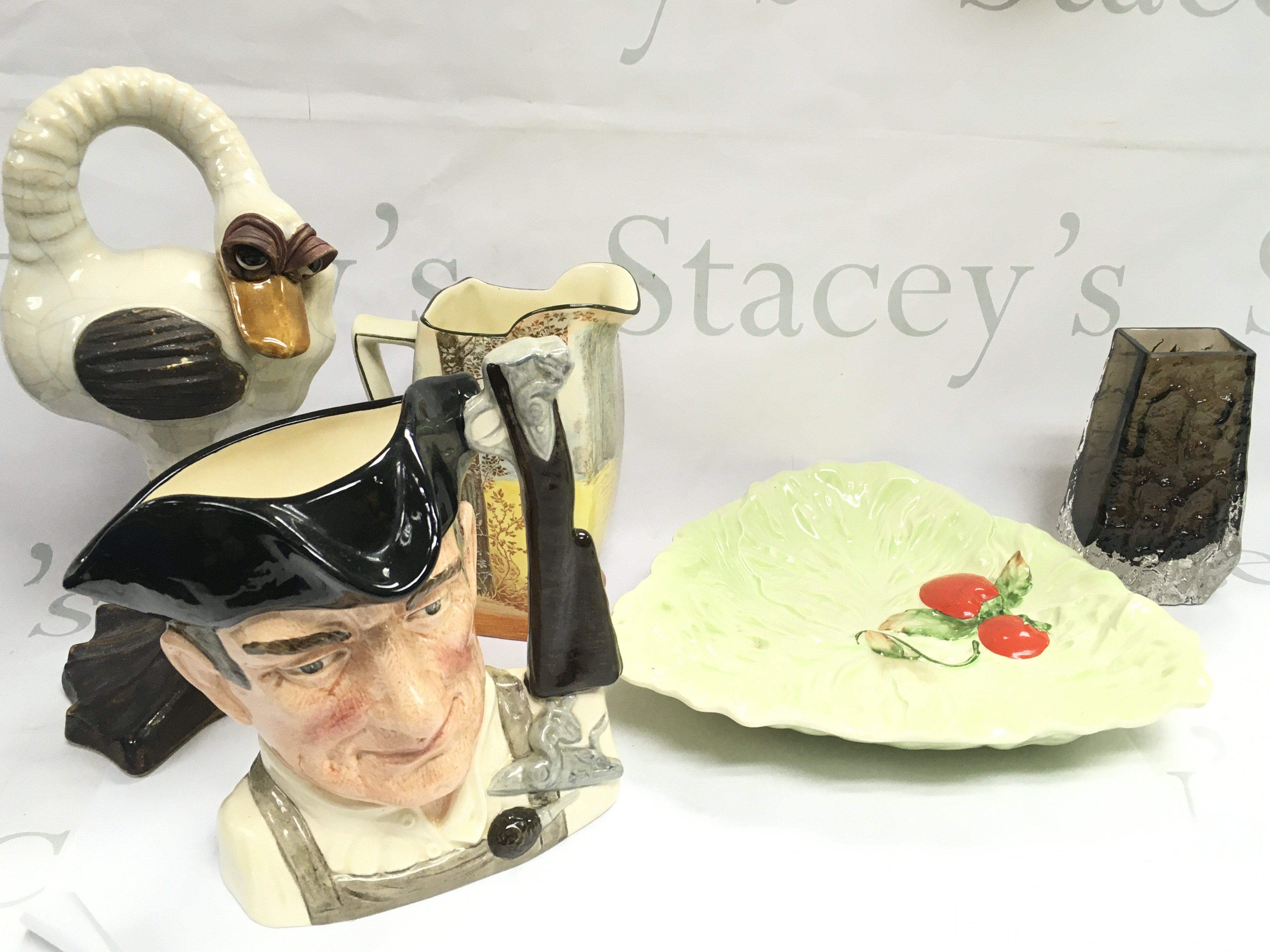 A Whitefriars vase, Doulton Ophelia jug with small chip , Doulton Gunsmith character jug , Carlton dish and an Unsual bird ornament , this lot cannot be posted