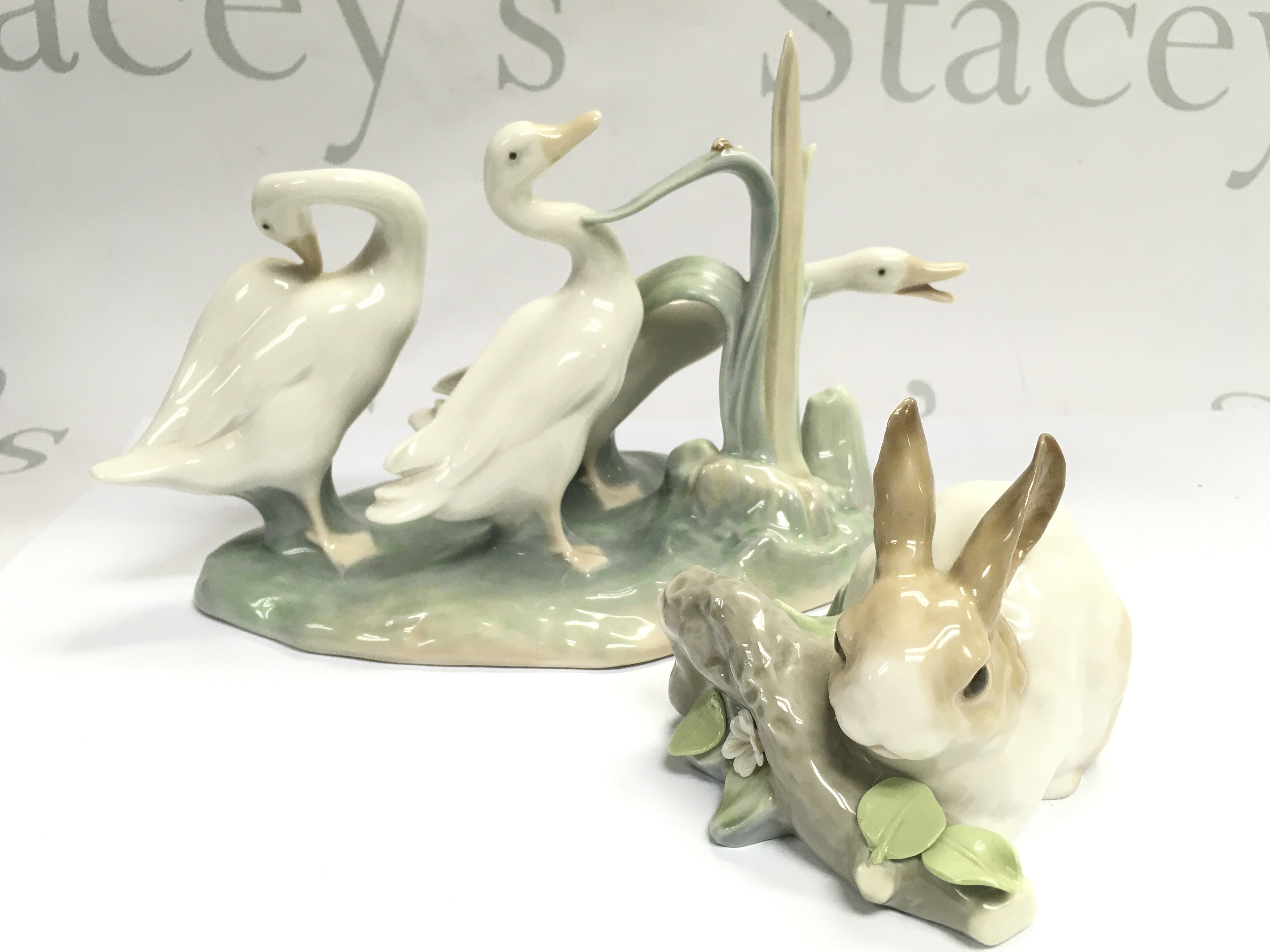 Two porcelain Lladro figures, group of swans and a rabbit .no obvious damage or restoration.this lot cannot be posted