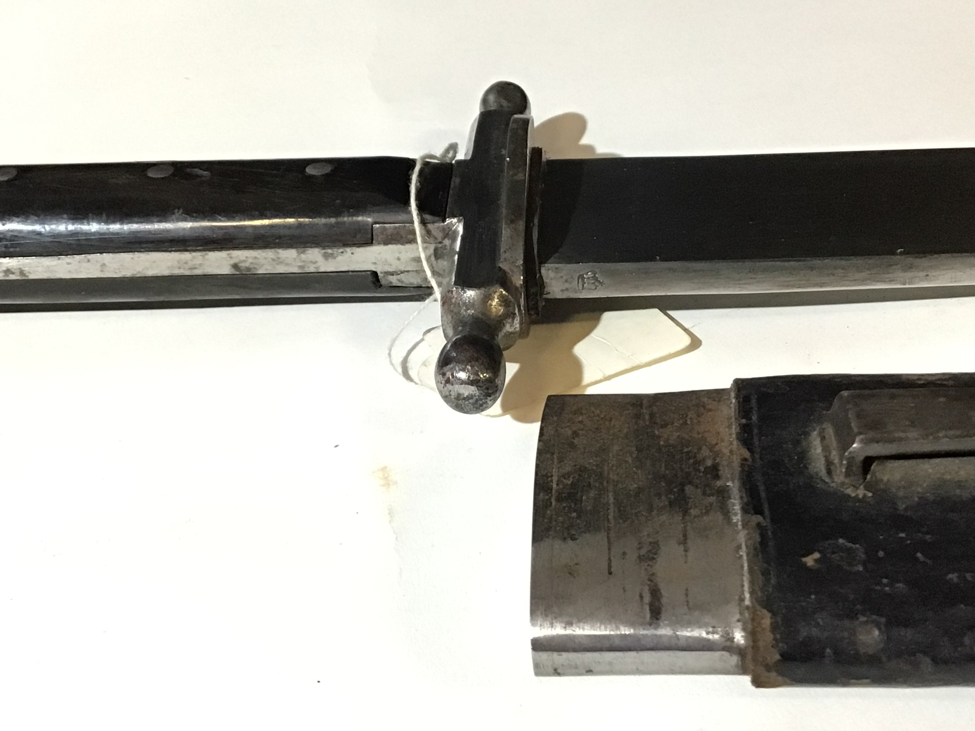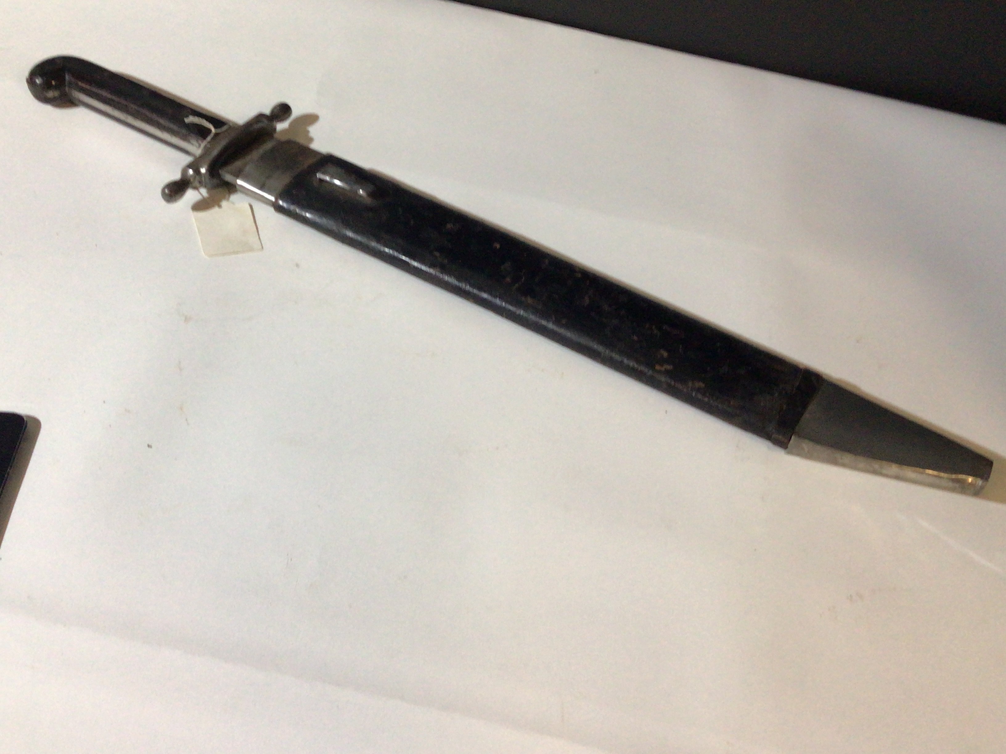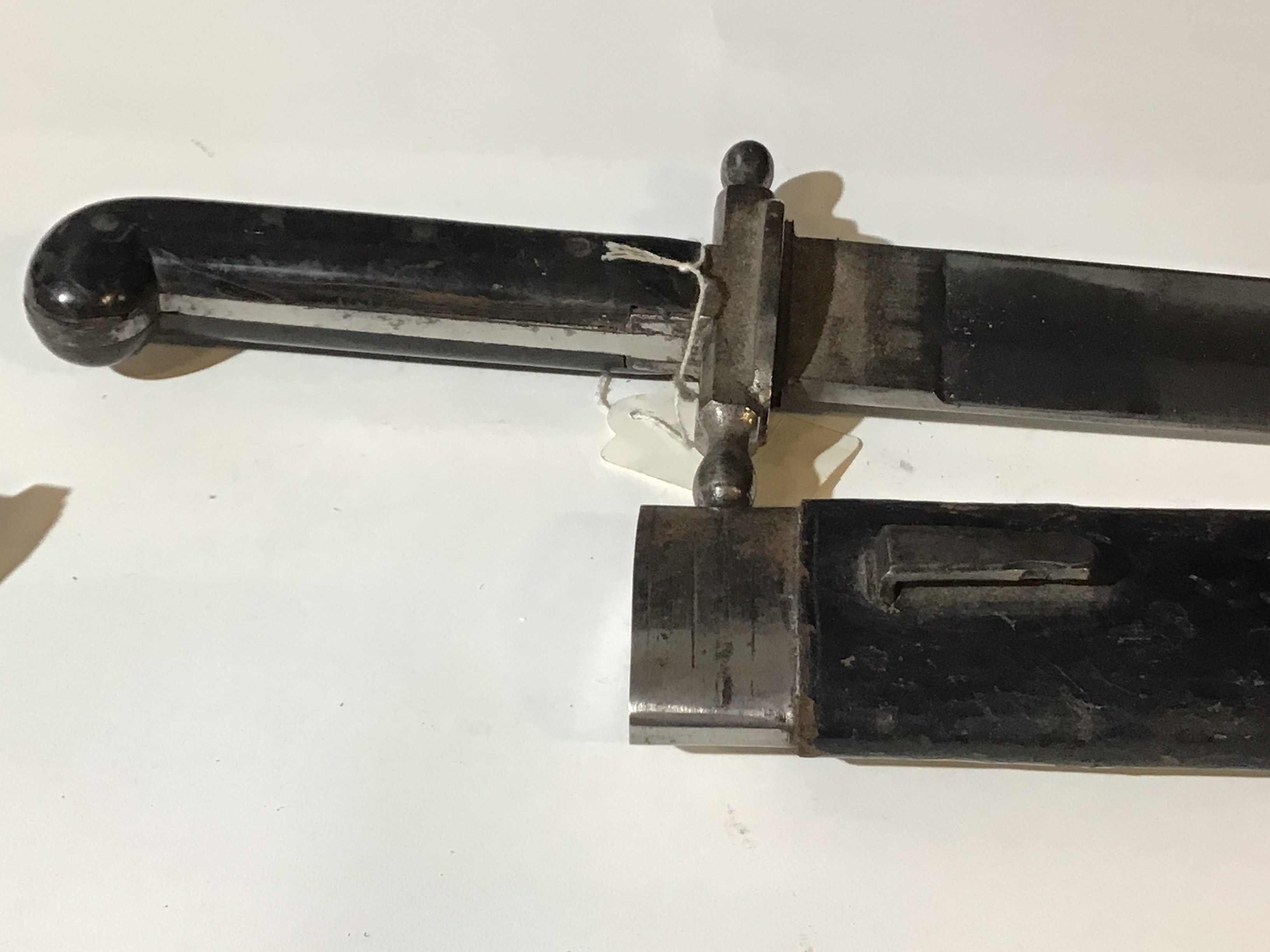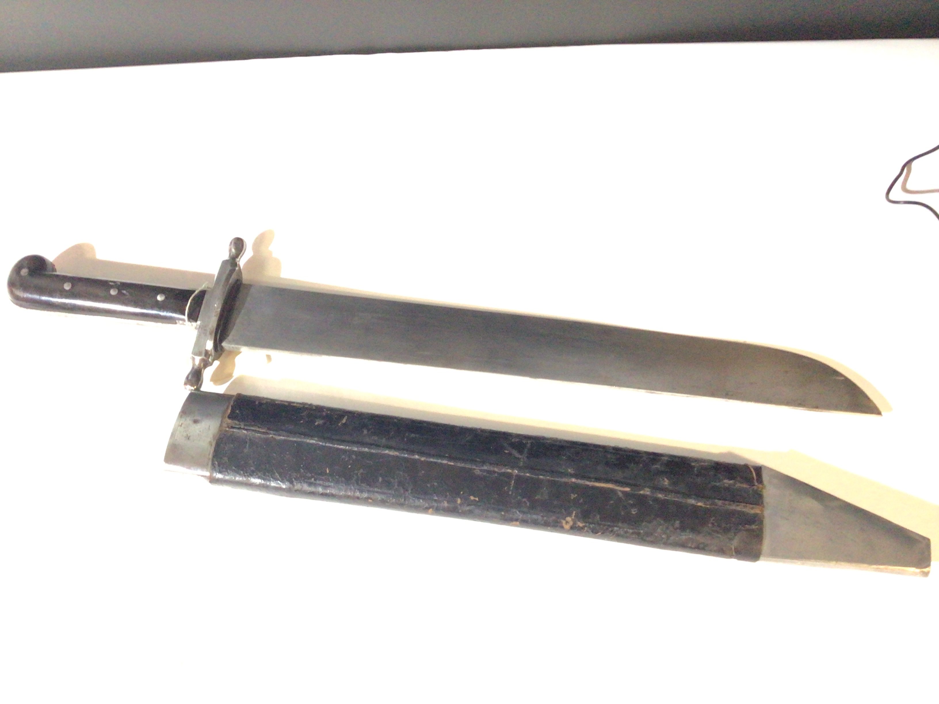 A rare Austrian 1853/1889 pattern Pioneer side arm with dark horn grip the blade edge stamped with a crown with steel and leather grip. Length 65cm