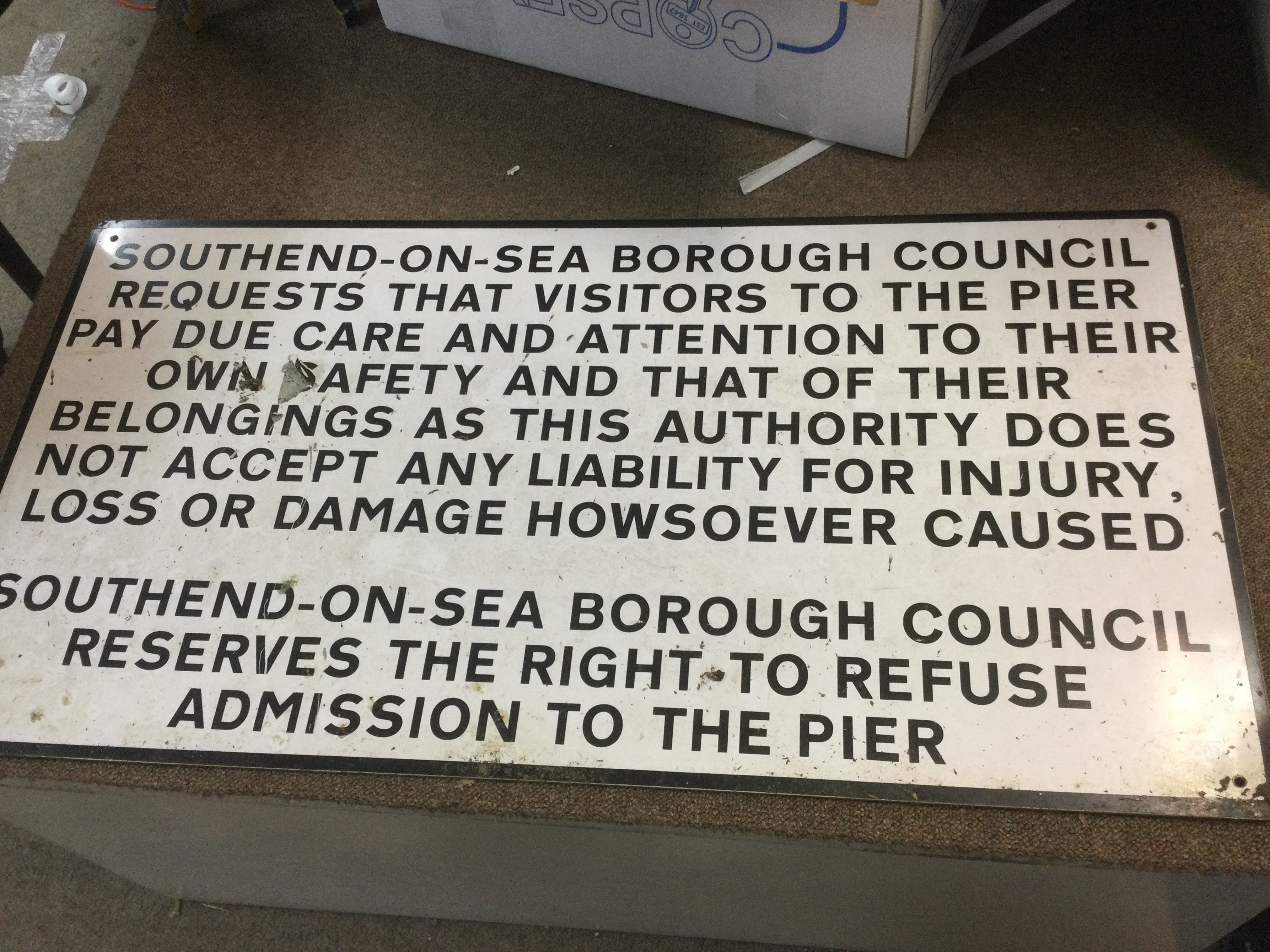 Four metal signs including a Southend pier warning sign, a London & Provincial enamel sign, a dog control area sign and a reproduction Colman's mustard sign (4). Shipping category D.