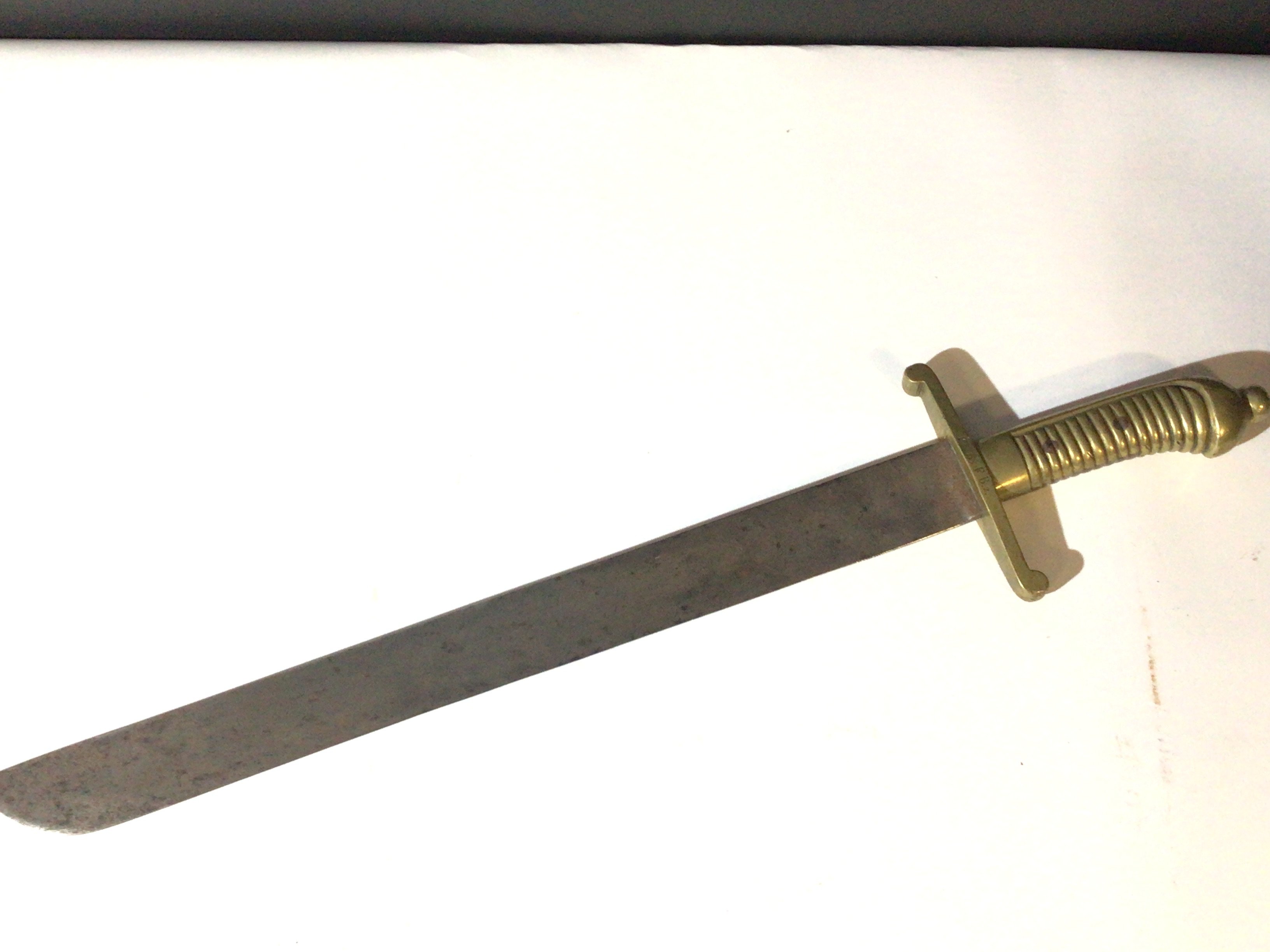 A 19th Century Pioneer sword possibly Prussian with a brass grip stamped 12.A.FB 2. no scabbard length 60cm