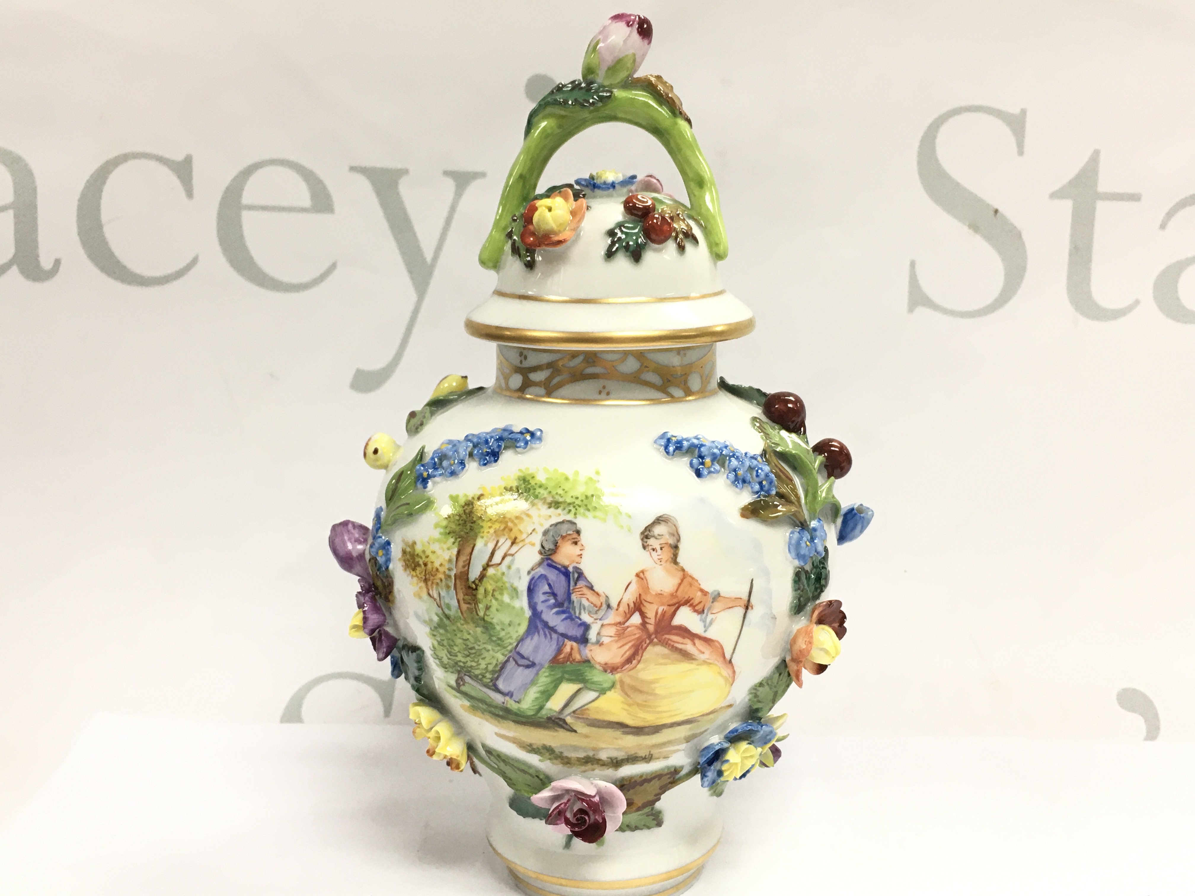 A Dresden urn & cover, hand painted with a figural scene and floral decoration . 19cm tall. This lot cannot be posted