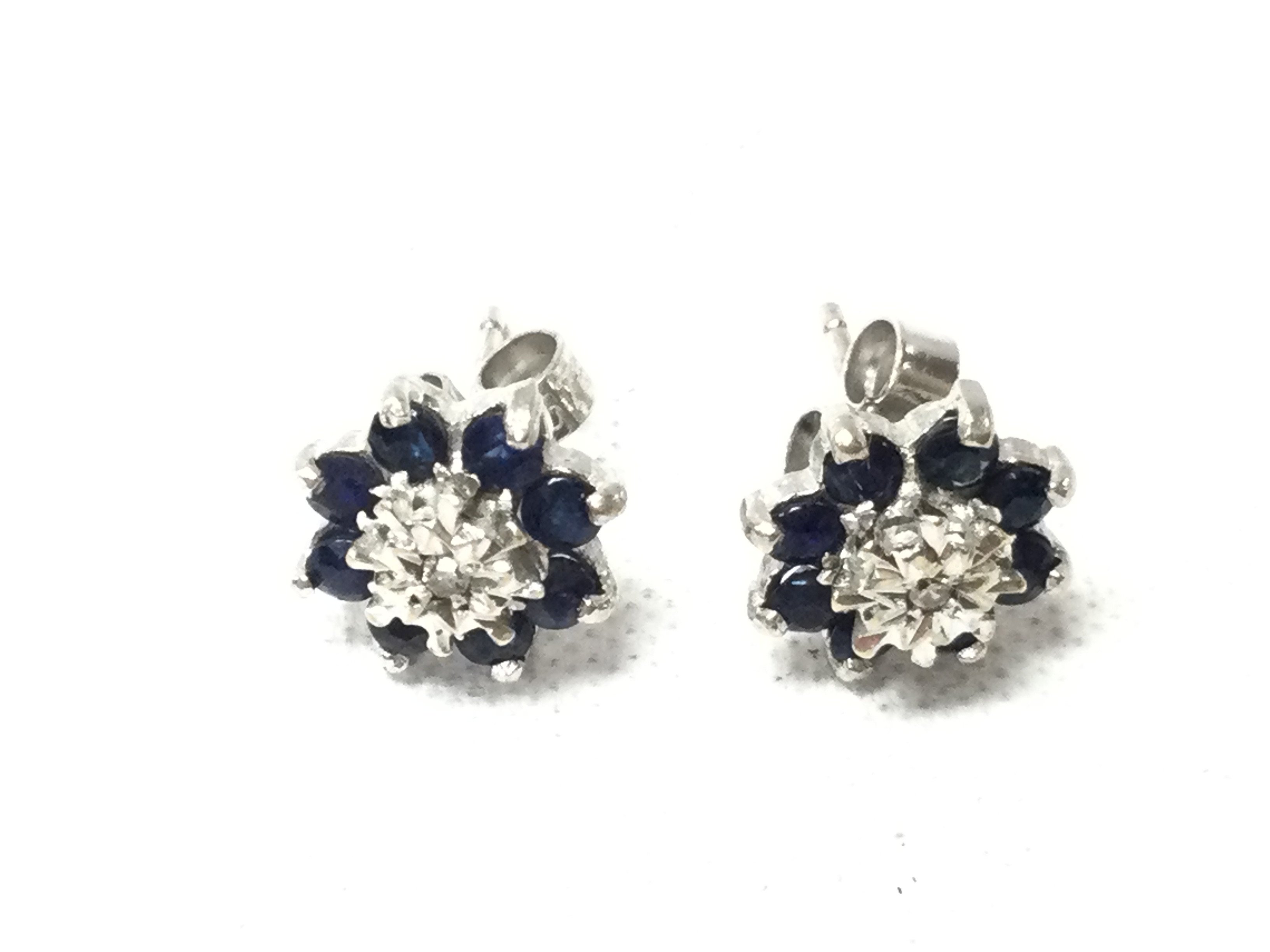 Pair of 9ct white gold diamond and sapphire studs. 2pts and 2.16g Postage A