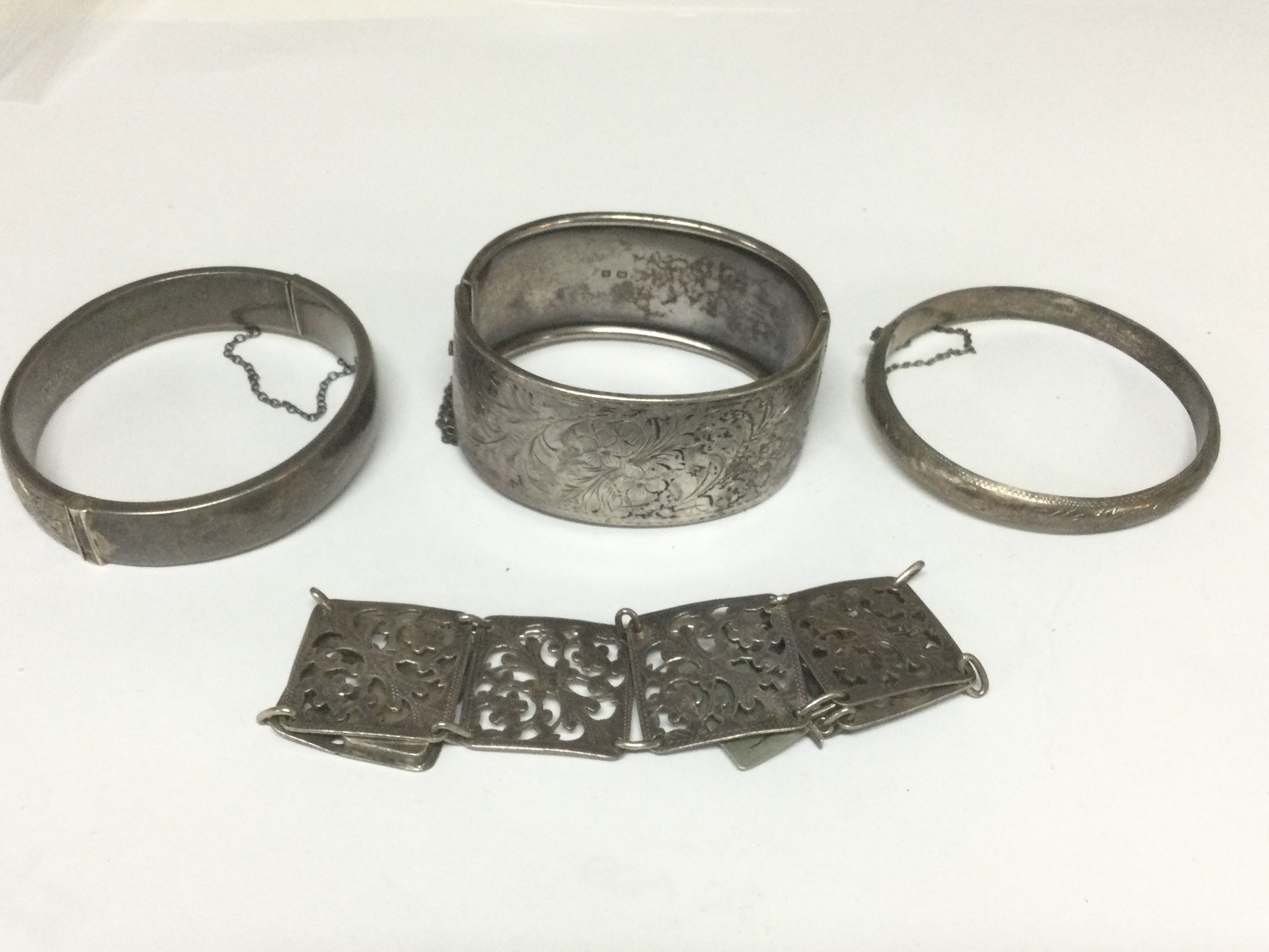 Three engraved silver bangles and a bracelet. Shipping category A.