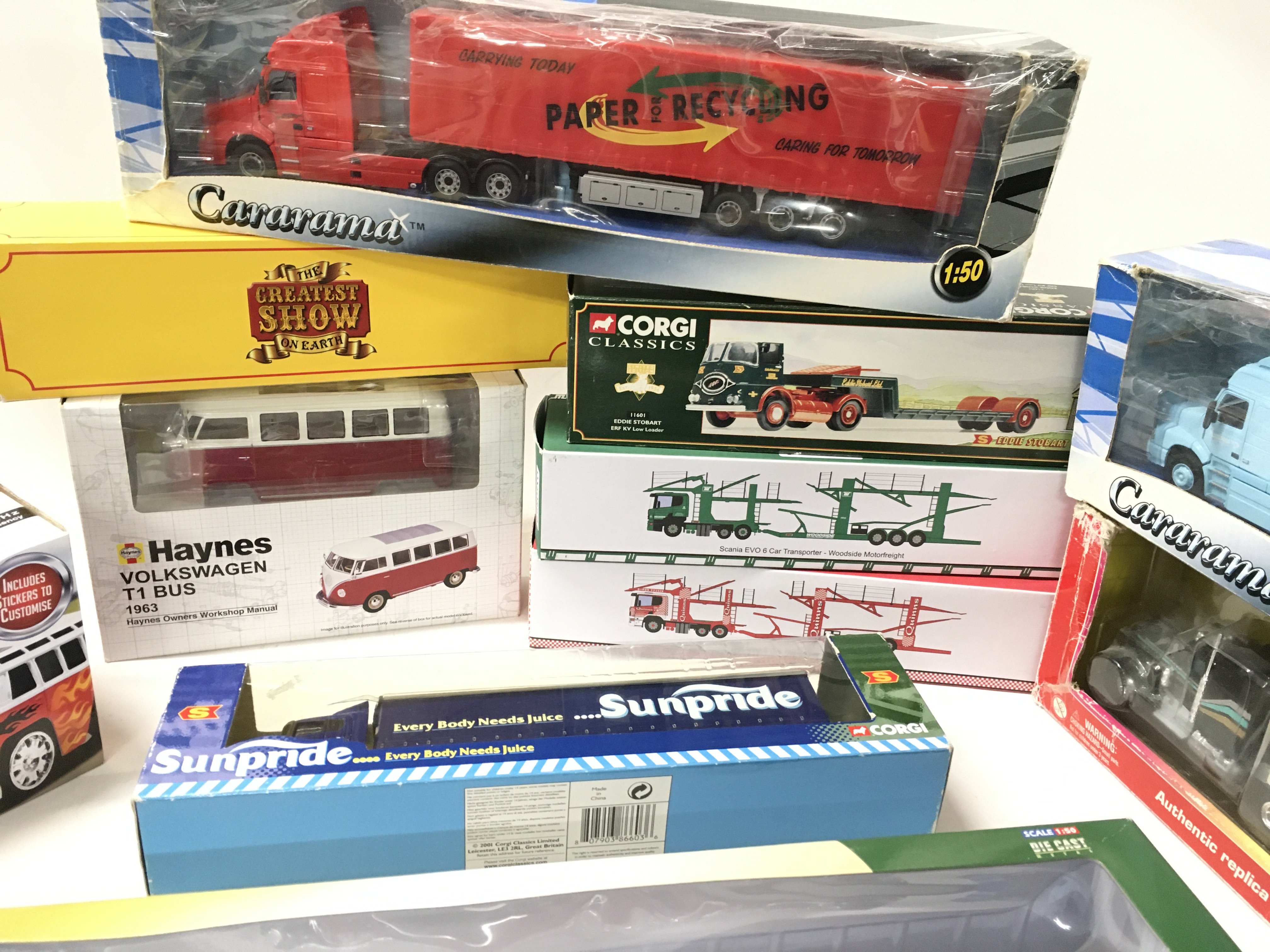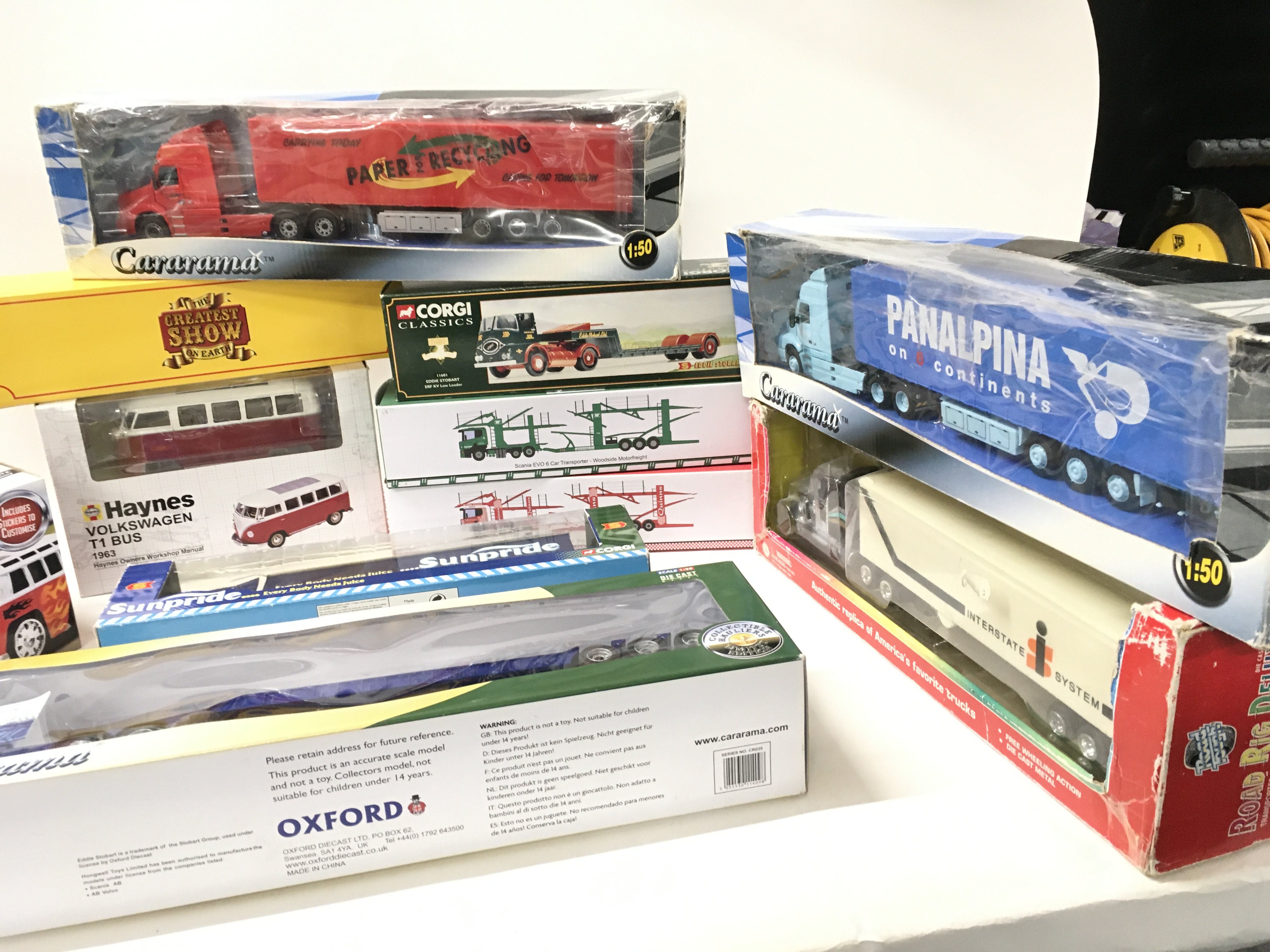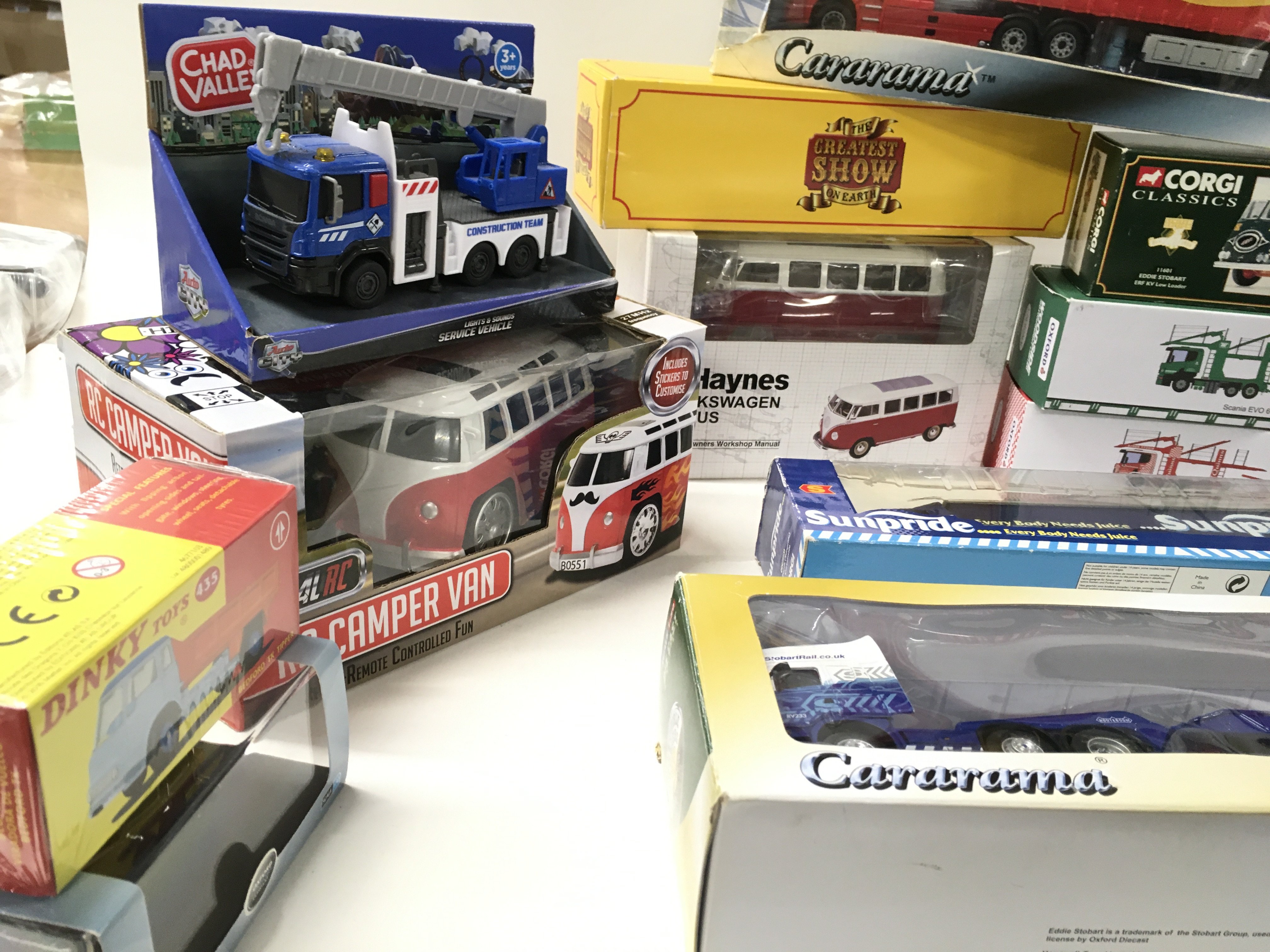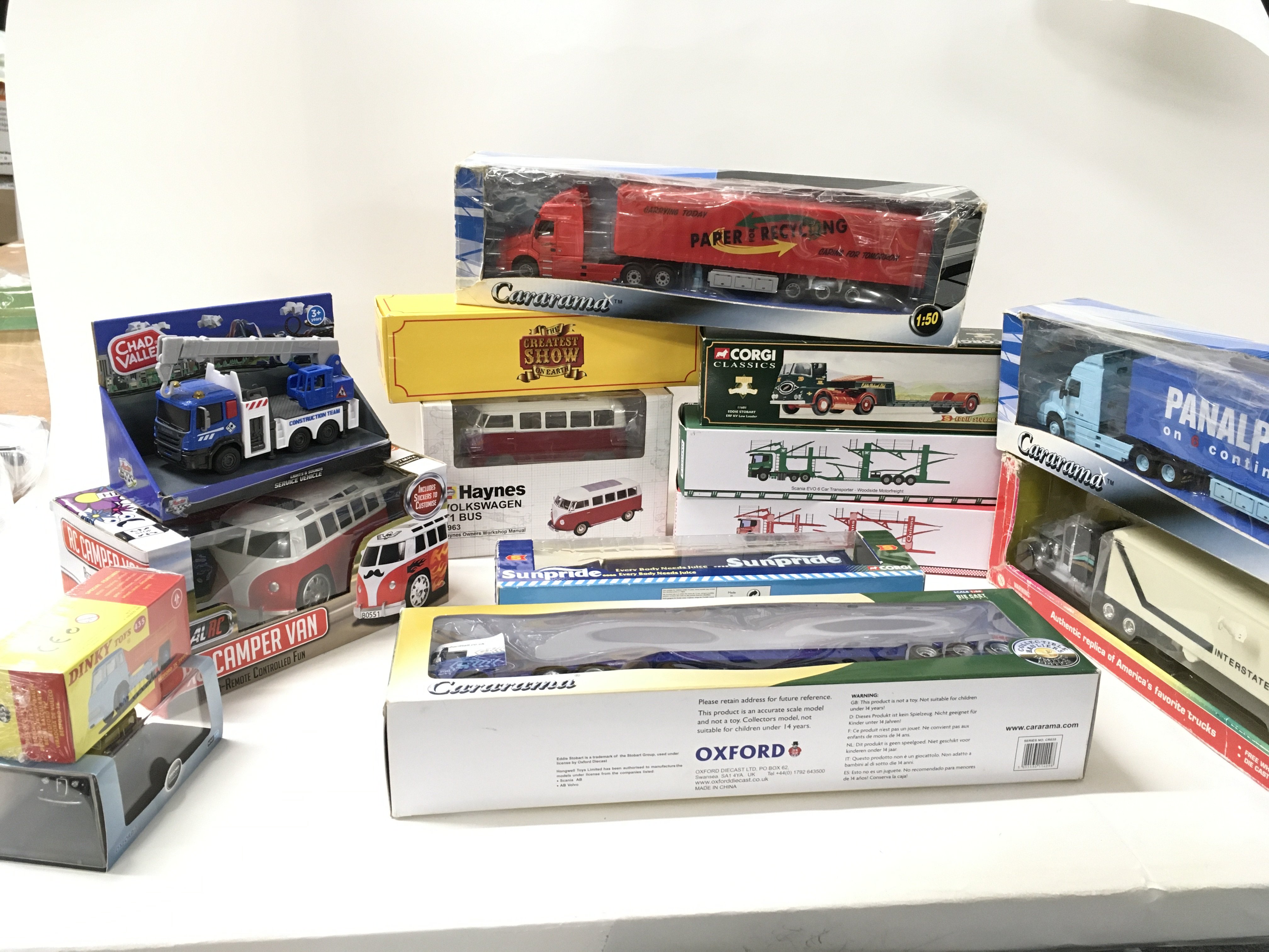 An assorted collection of 14 model vehicles both collectibles and fun . Includes a remote control VW camper van..manufacturers include Oxford..Corgi..Cararama. No reserve