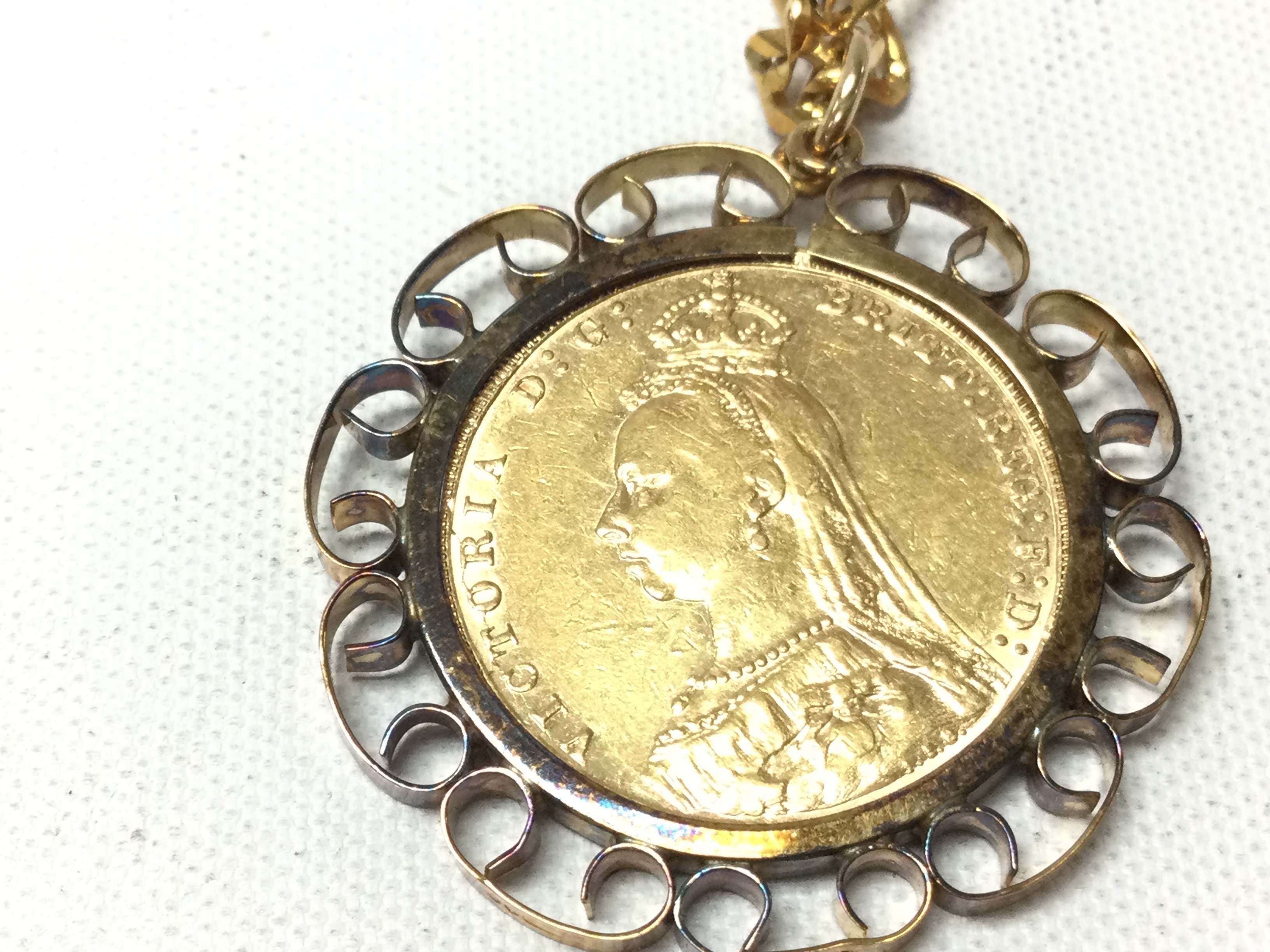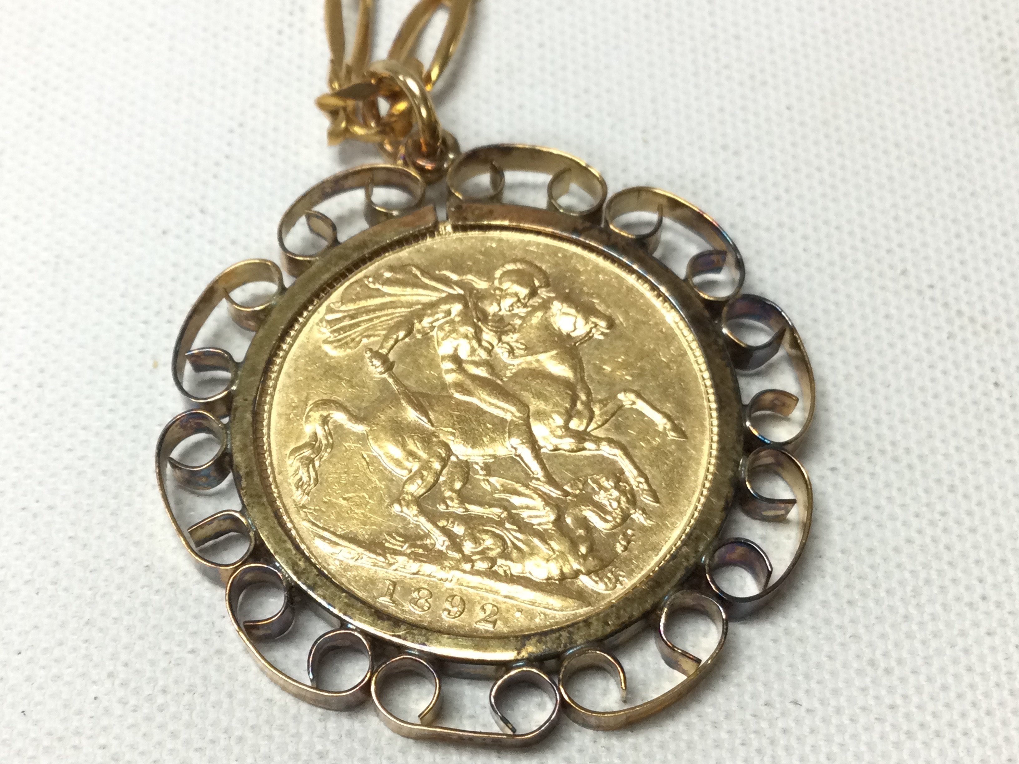 A 1892 Melbourne mint full sovereign in mount on 9ct gold chain. 21.86g Postage B