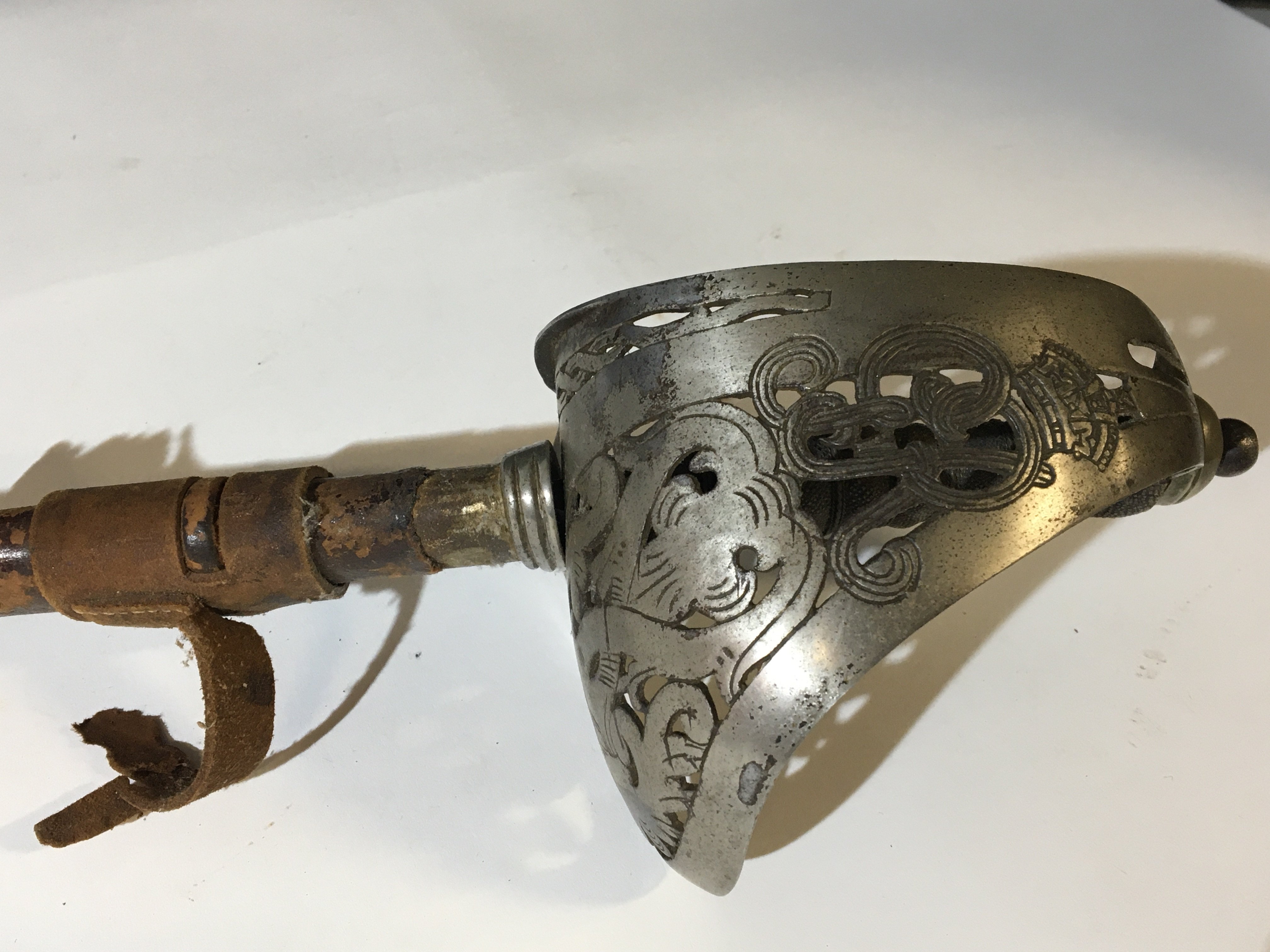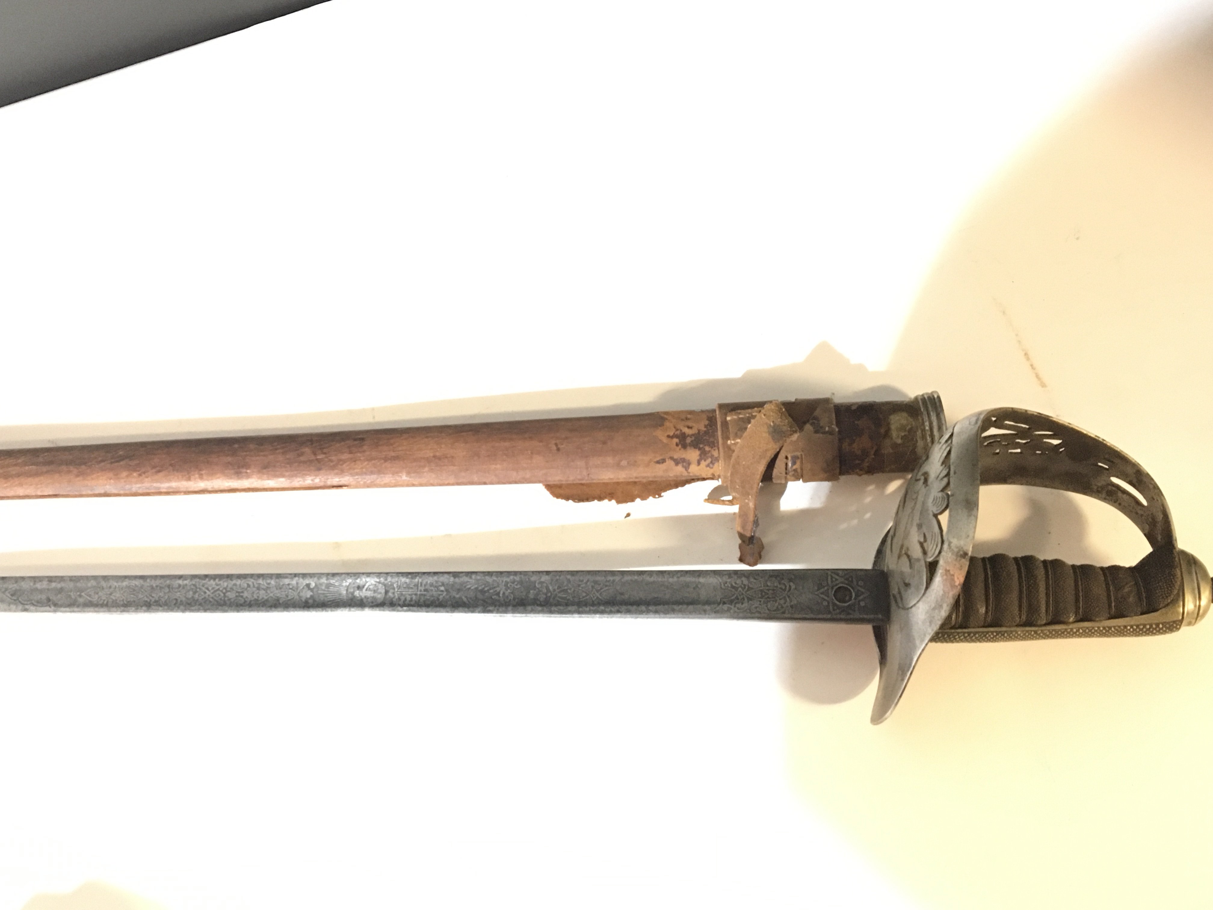A George V officers sword 1897 pattern etched blade with a leather field service scabbard.
