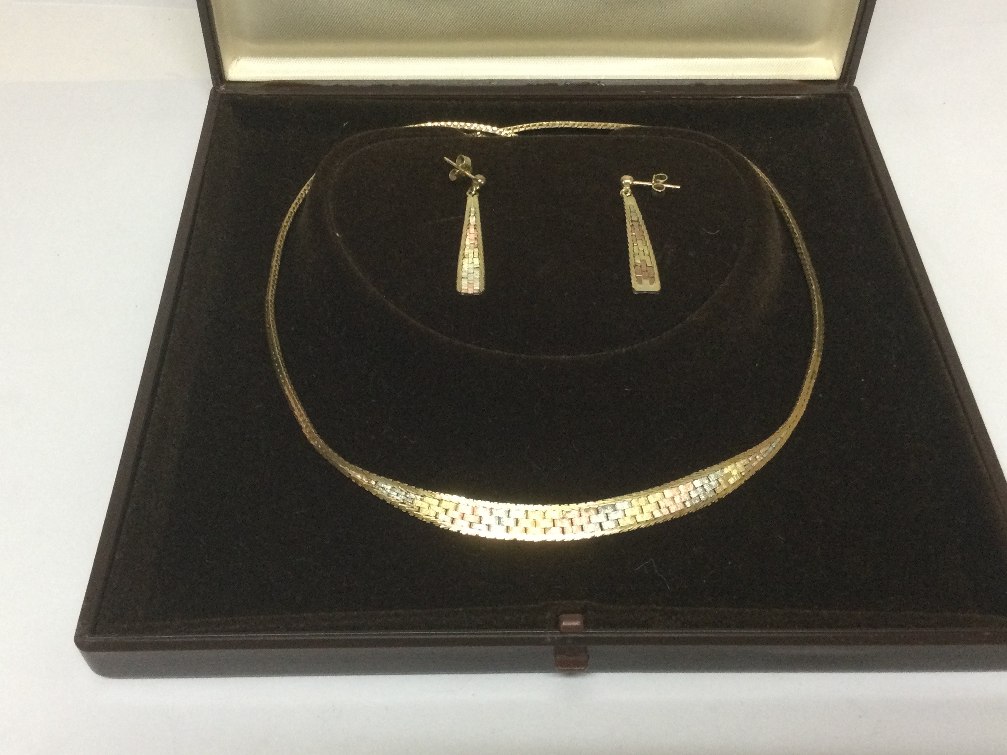 A 9ct three colour gold necklace and a pair if matching earrings. Shipping category B.