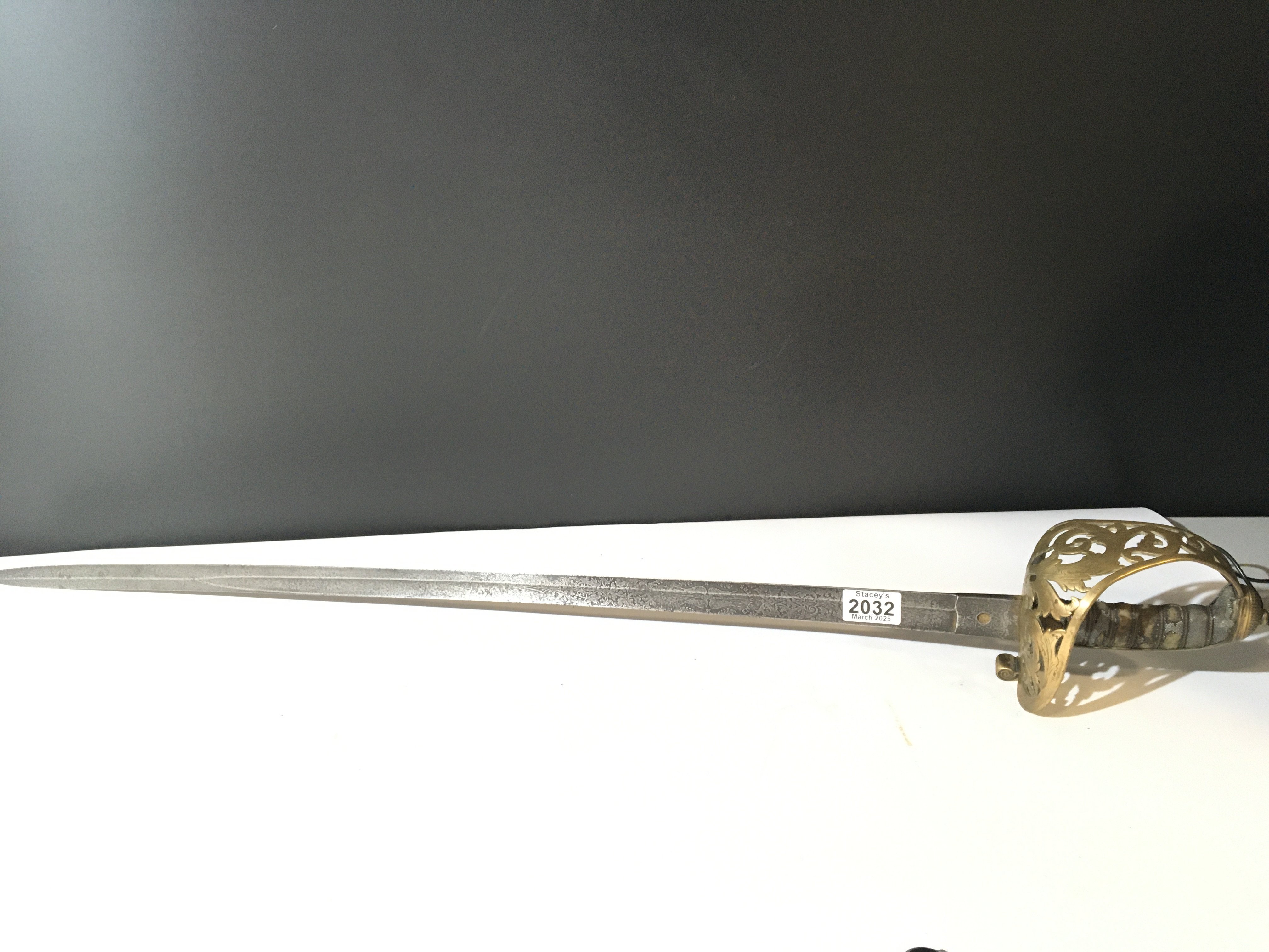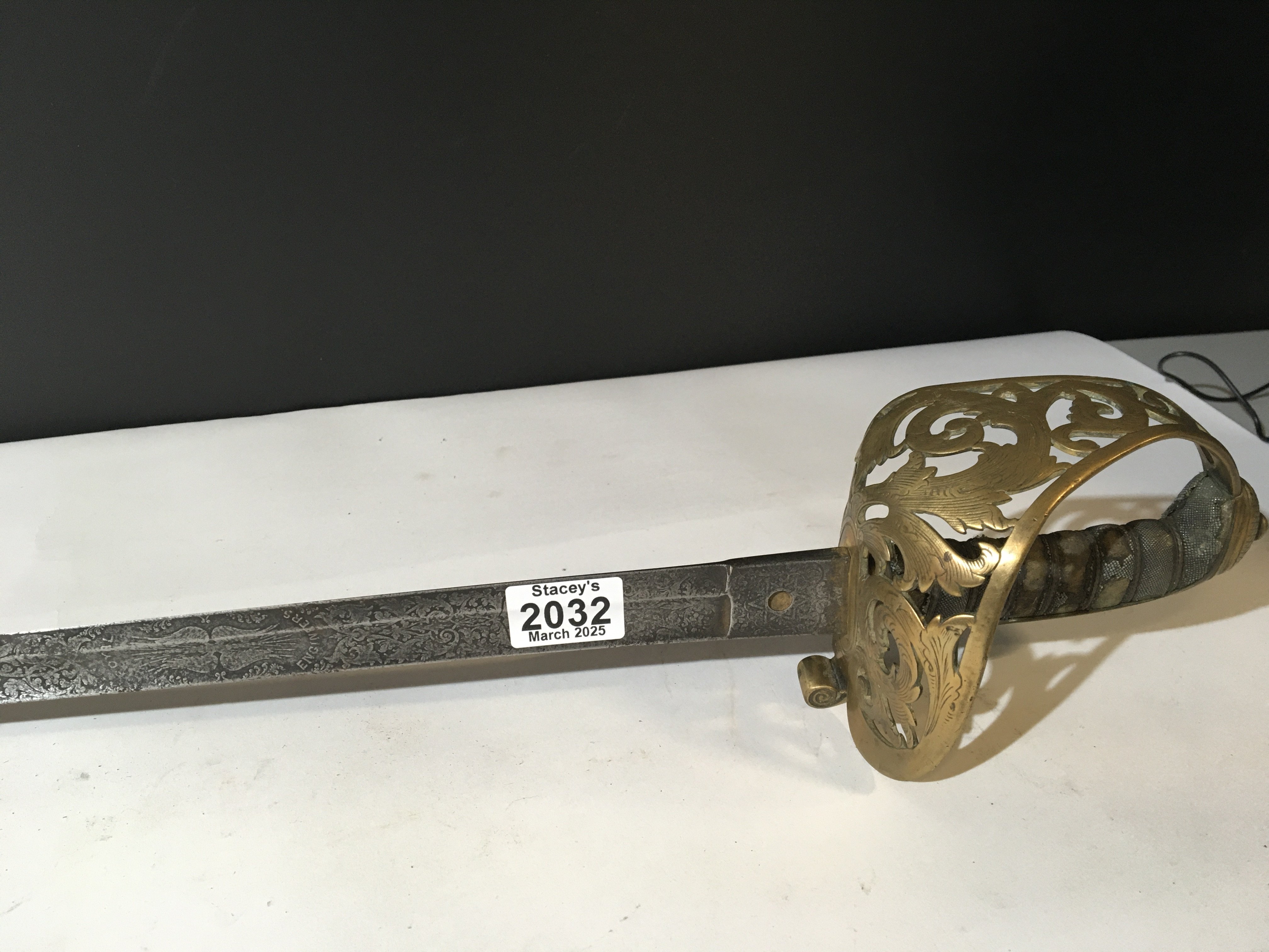 A rare Victorian 1857 pattern Engineers officers sword with a brass elaborate scroll basket engraved blade no scabbard.