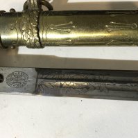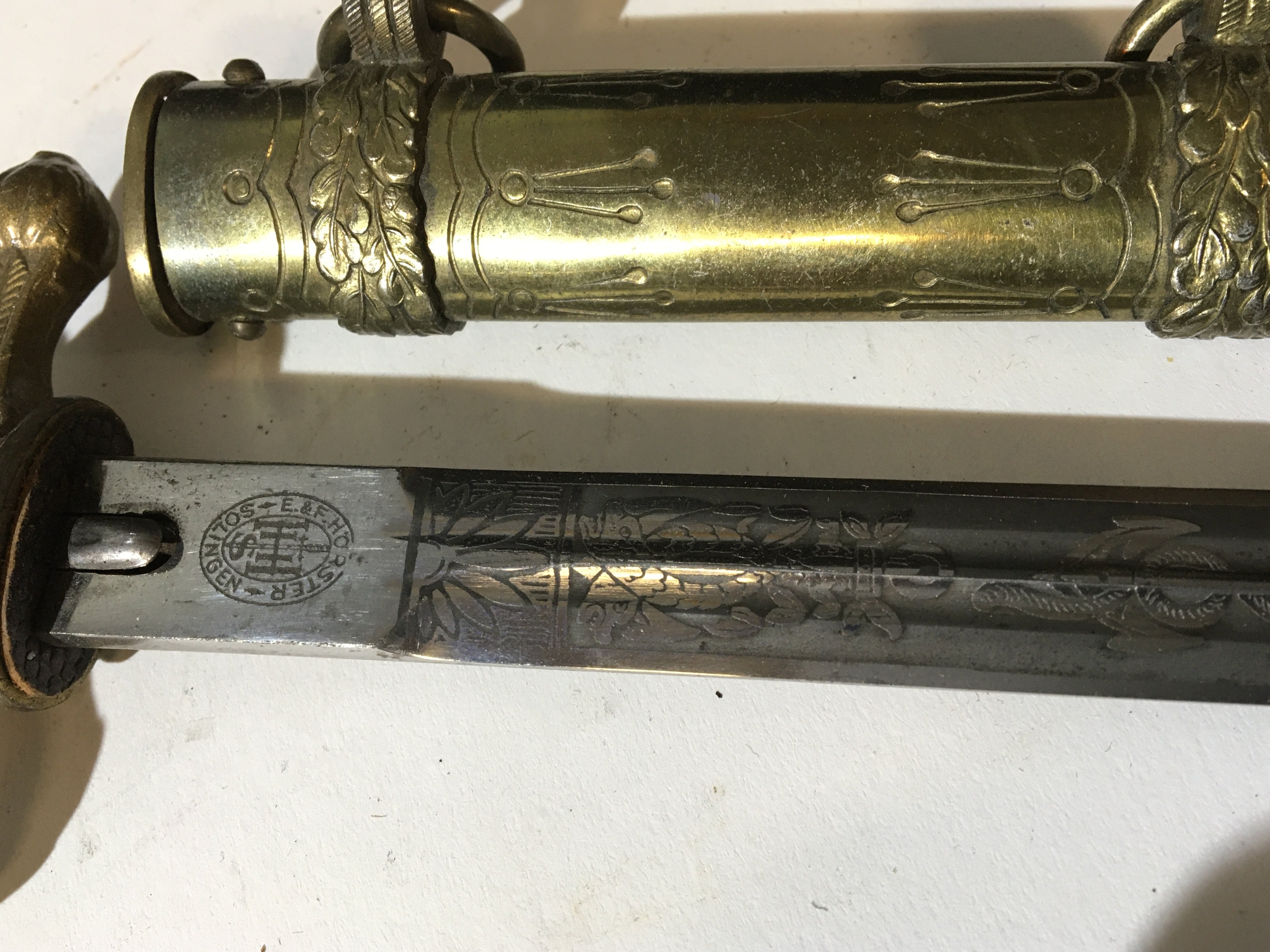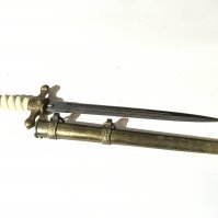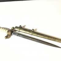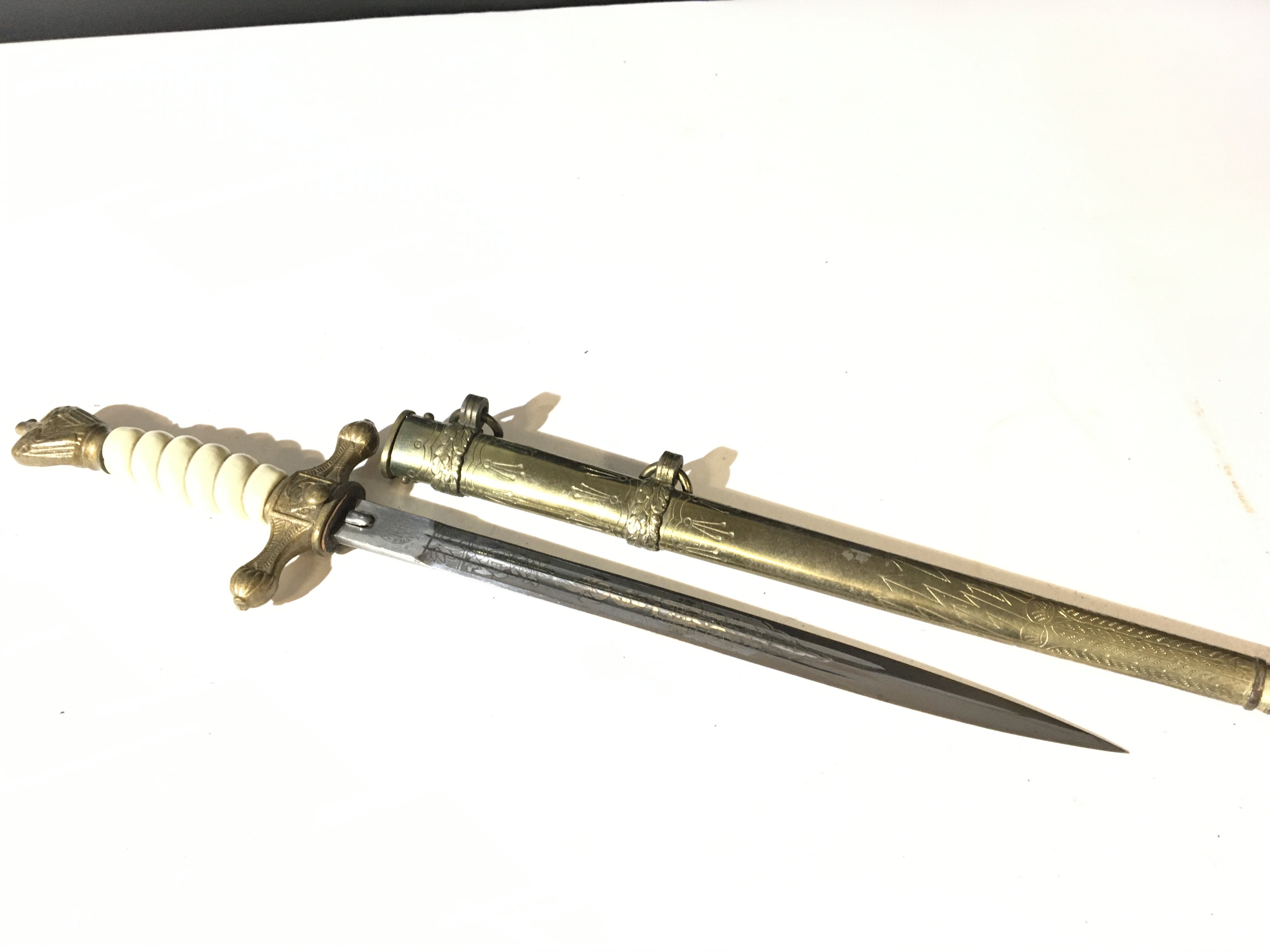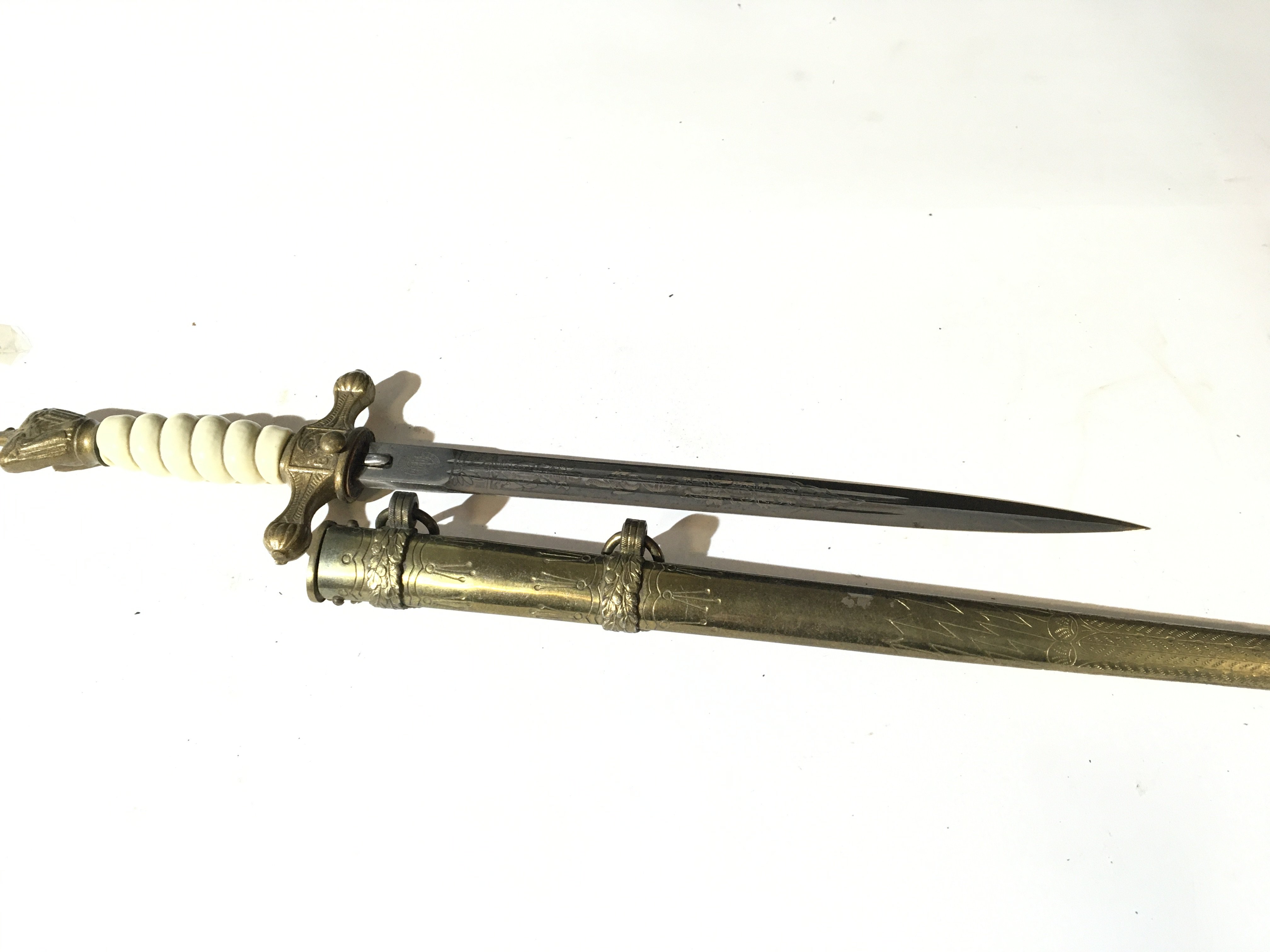 A German Third Reich Kriegsmarine officers presentation dagger the decorated blade with makers marks brass scabbard with further ornamentation good condition.