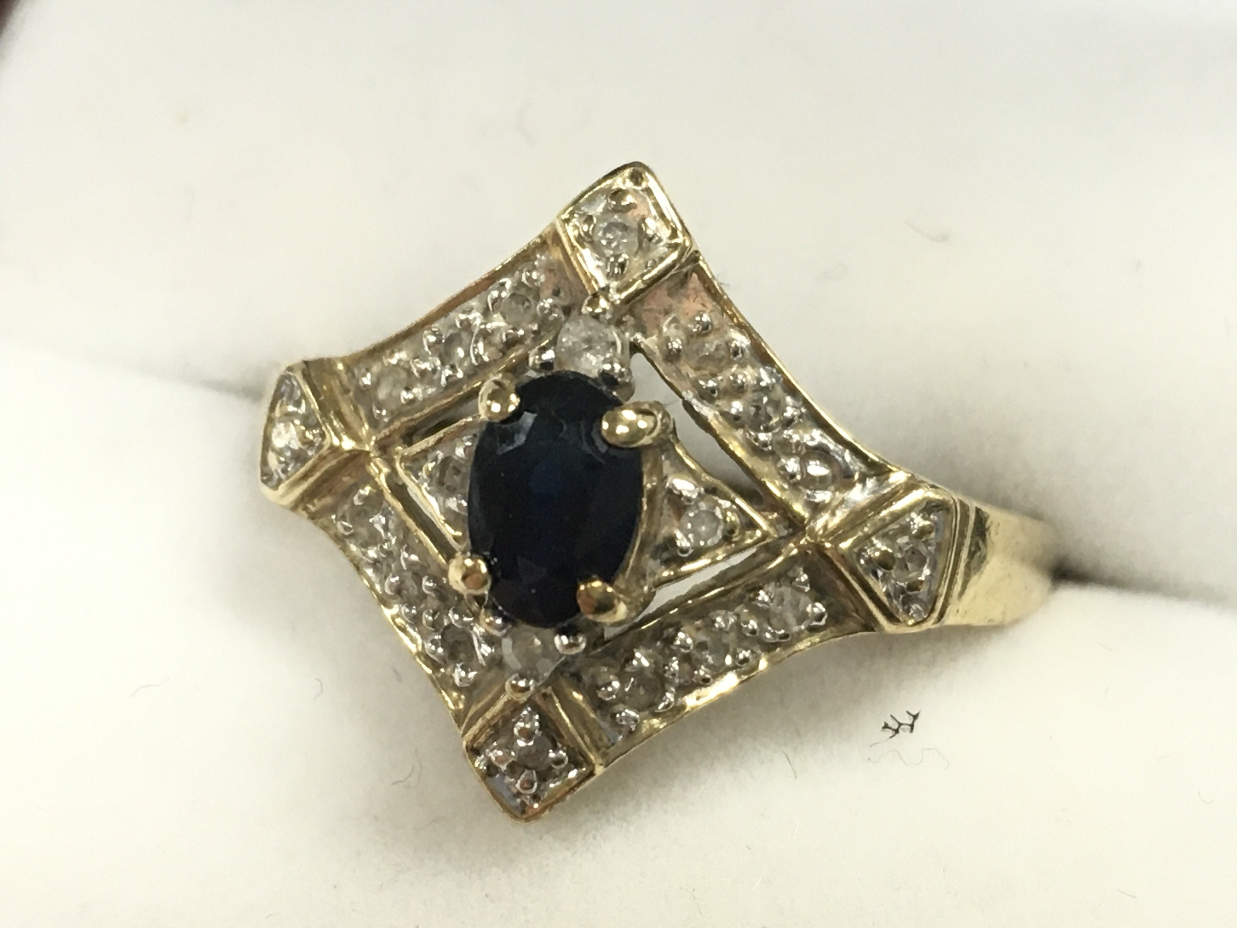 An art deco 9ct gold diamond and sapphire set ring, size R. 2.7g total weight. Postage category A