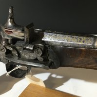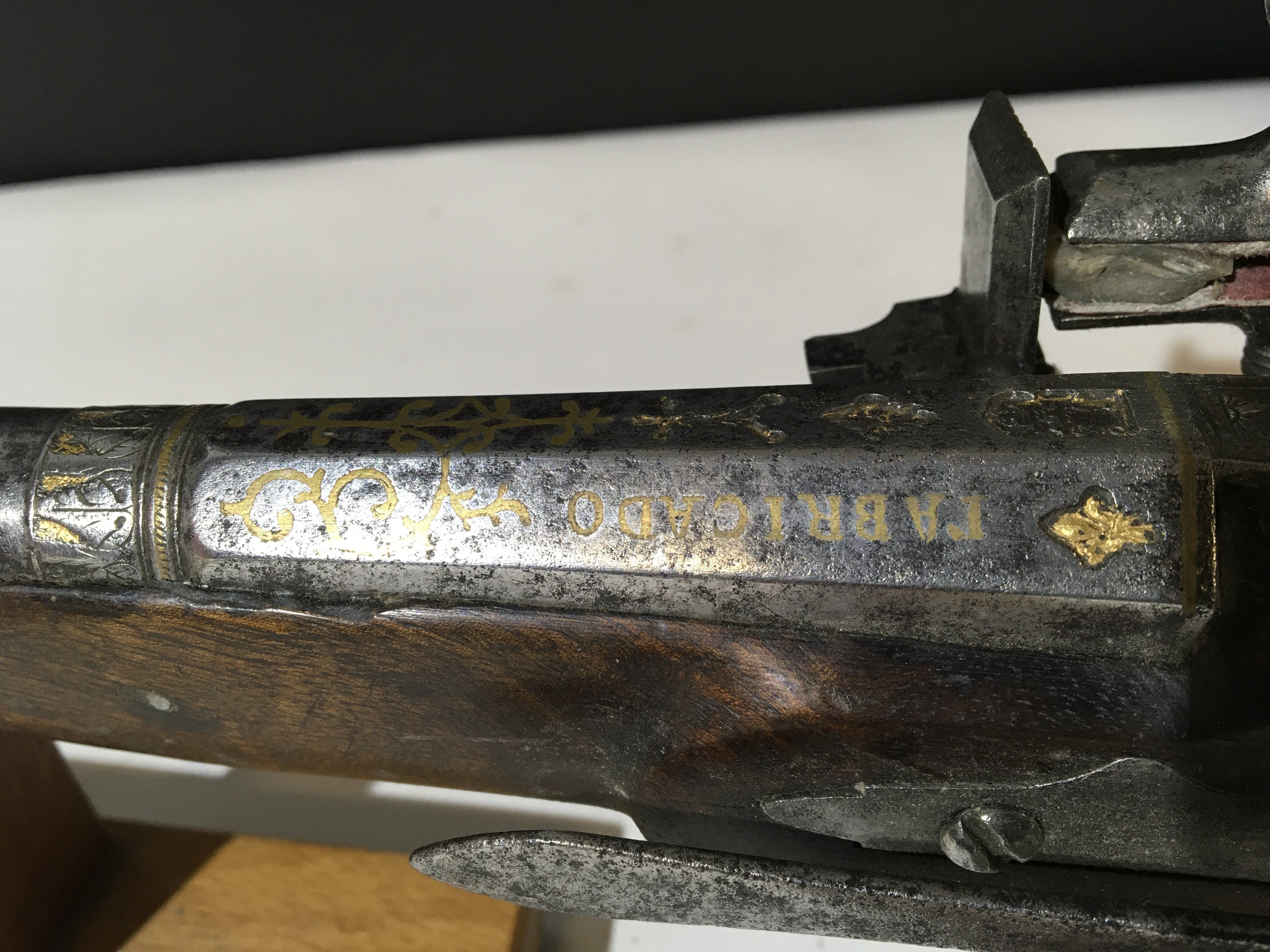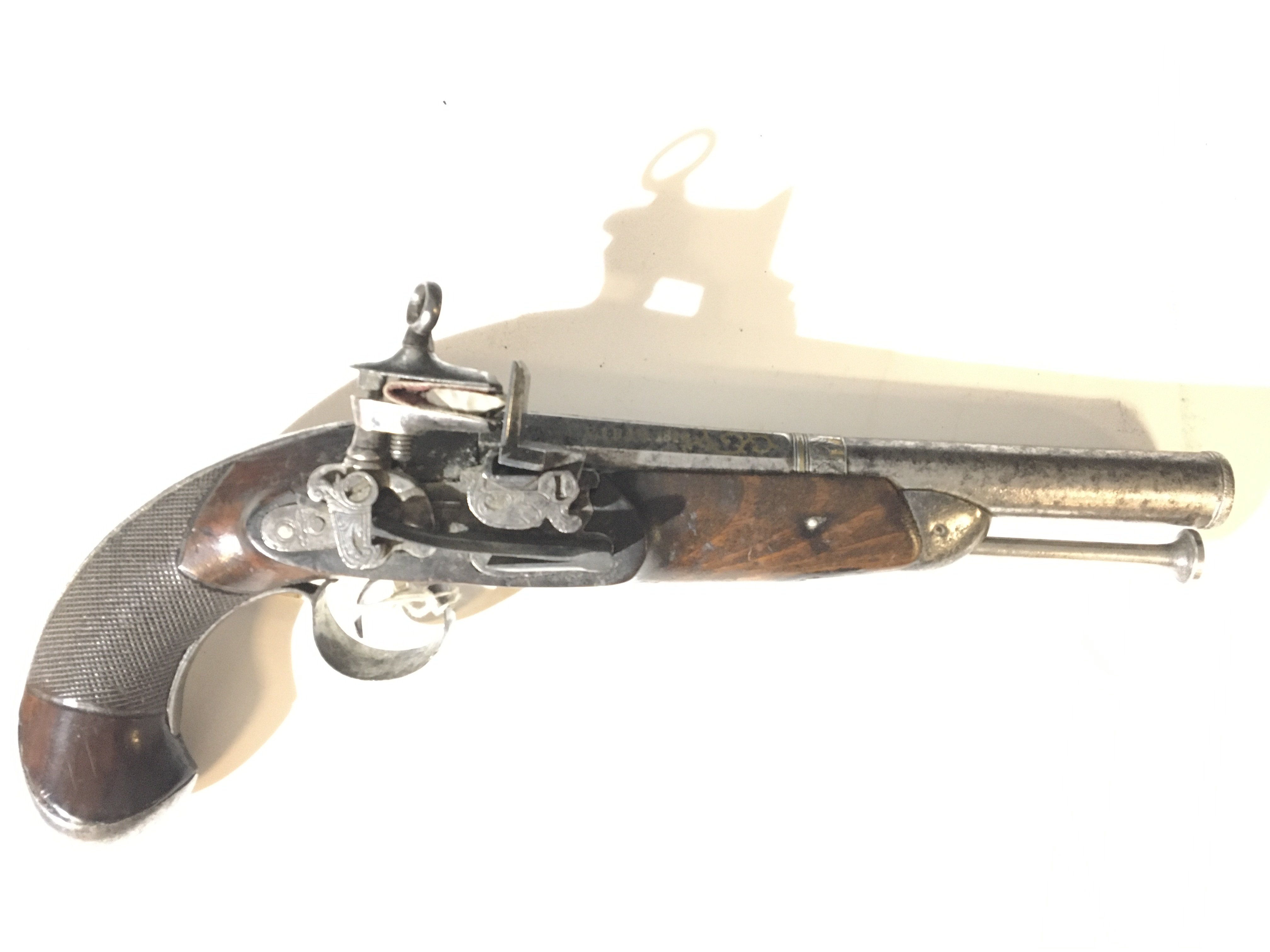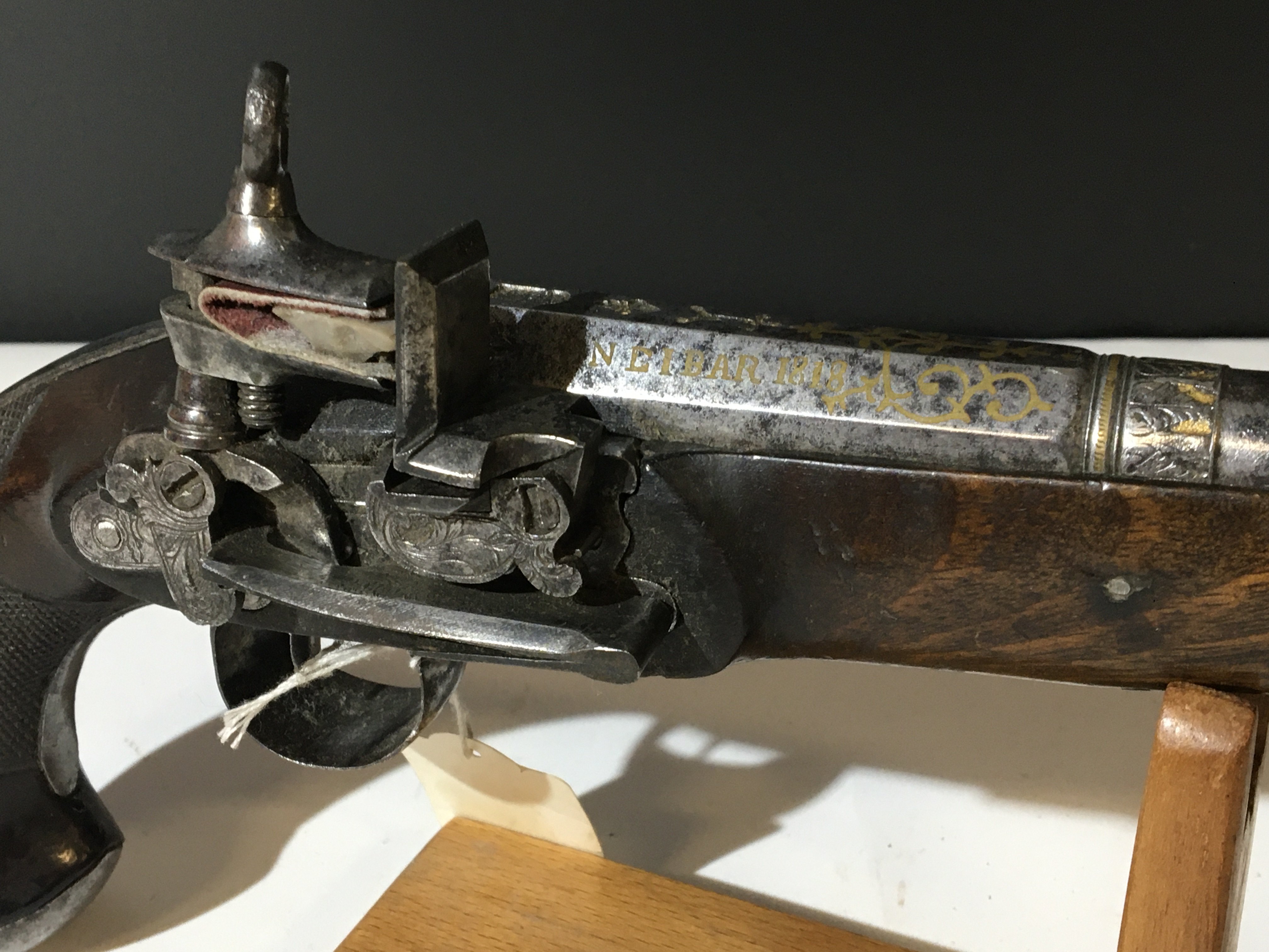 An early 19th century Continental flintlock pistol the steel barrel with impressed marks and inscription rabricado 1818 with attached steel belt clip length 34cm