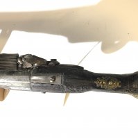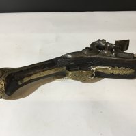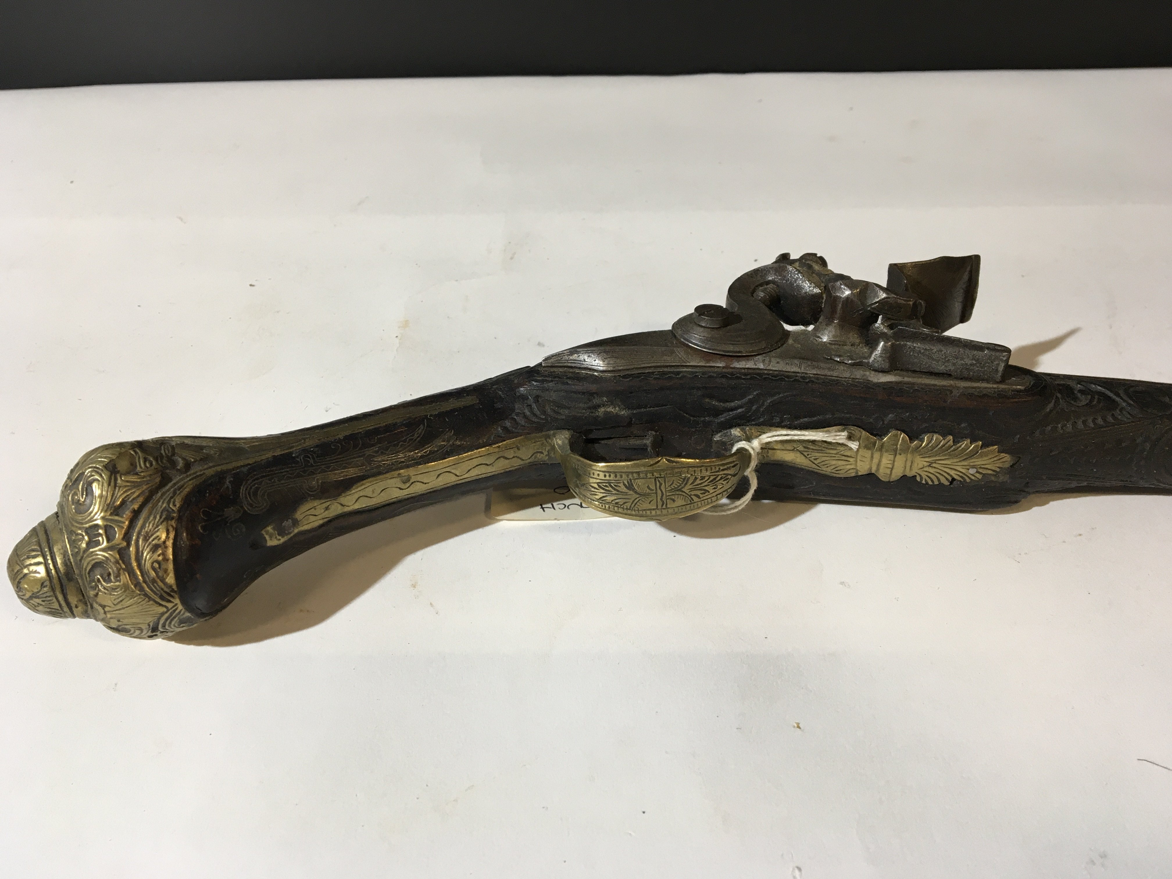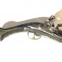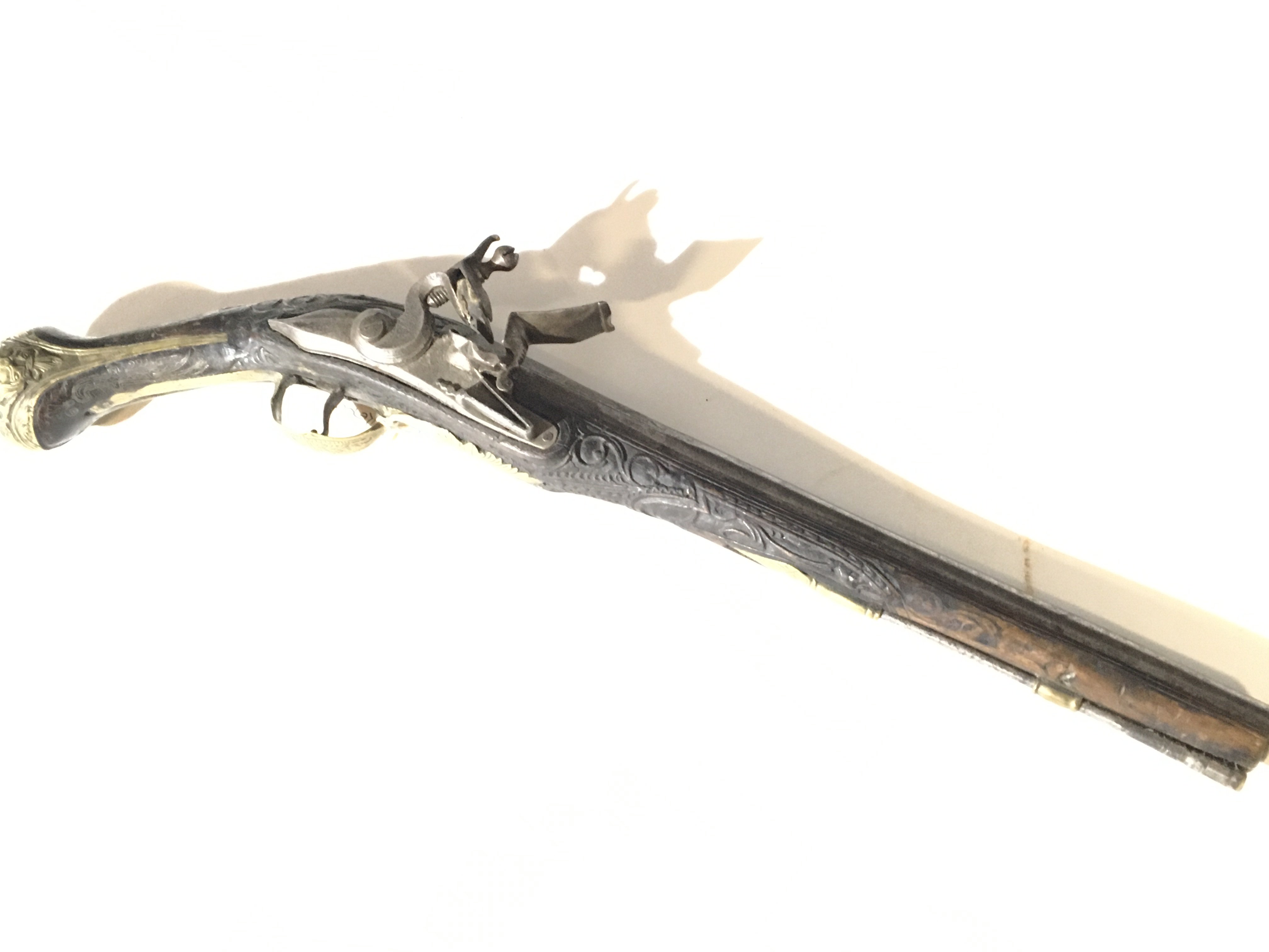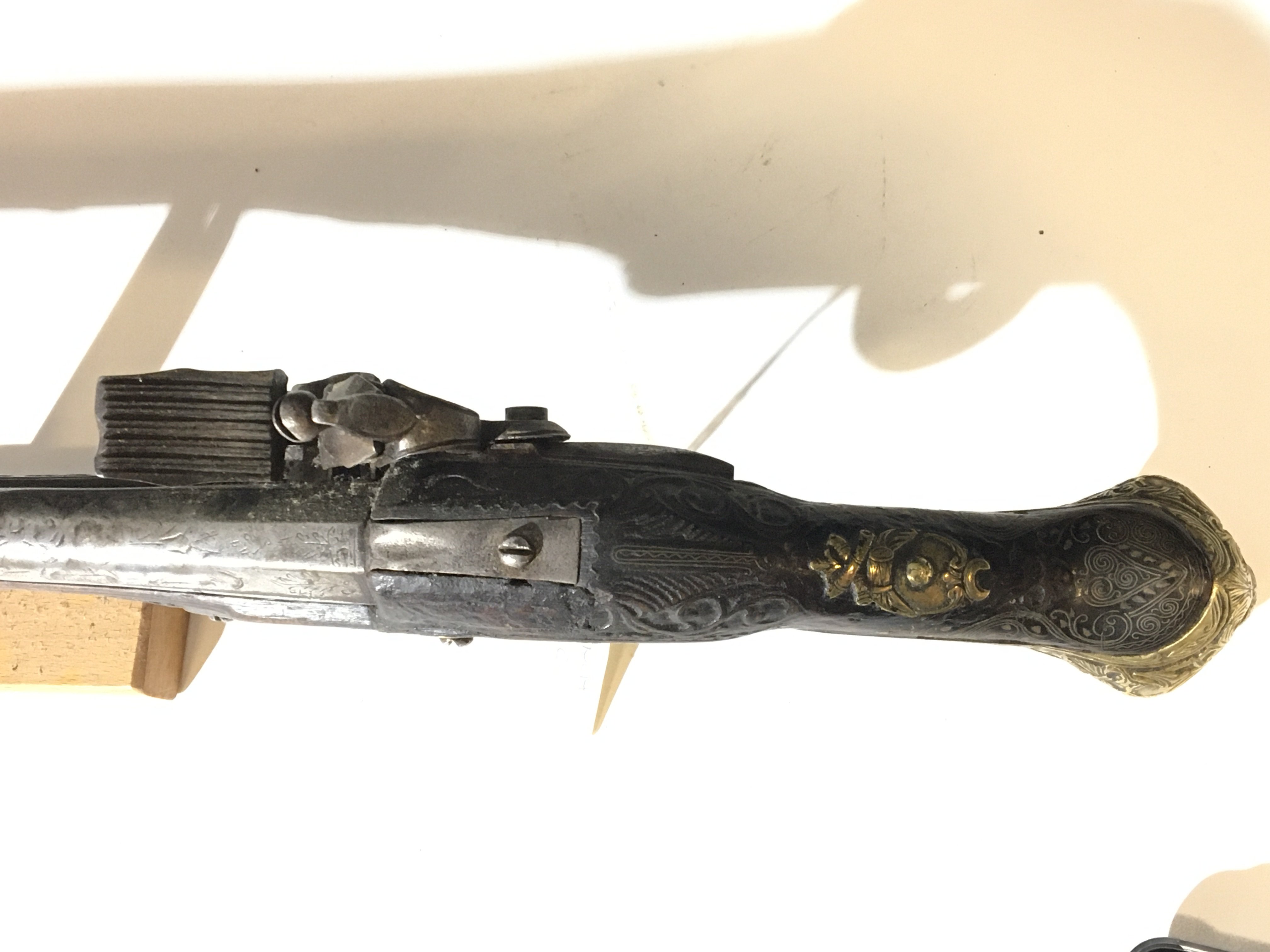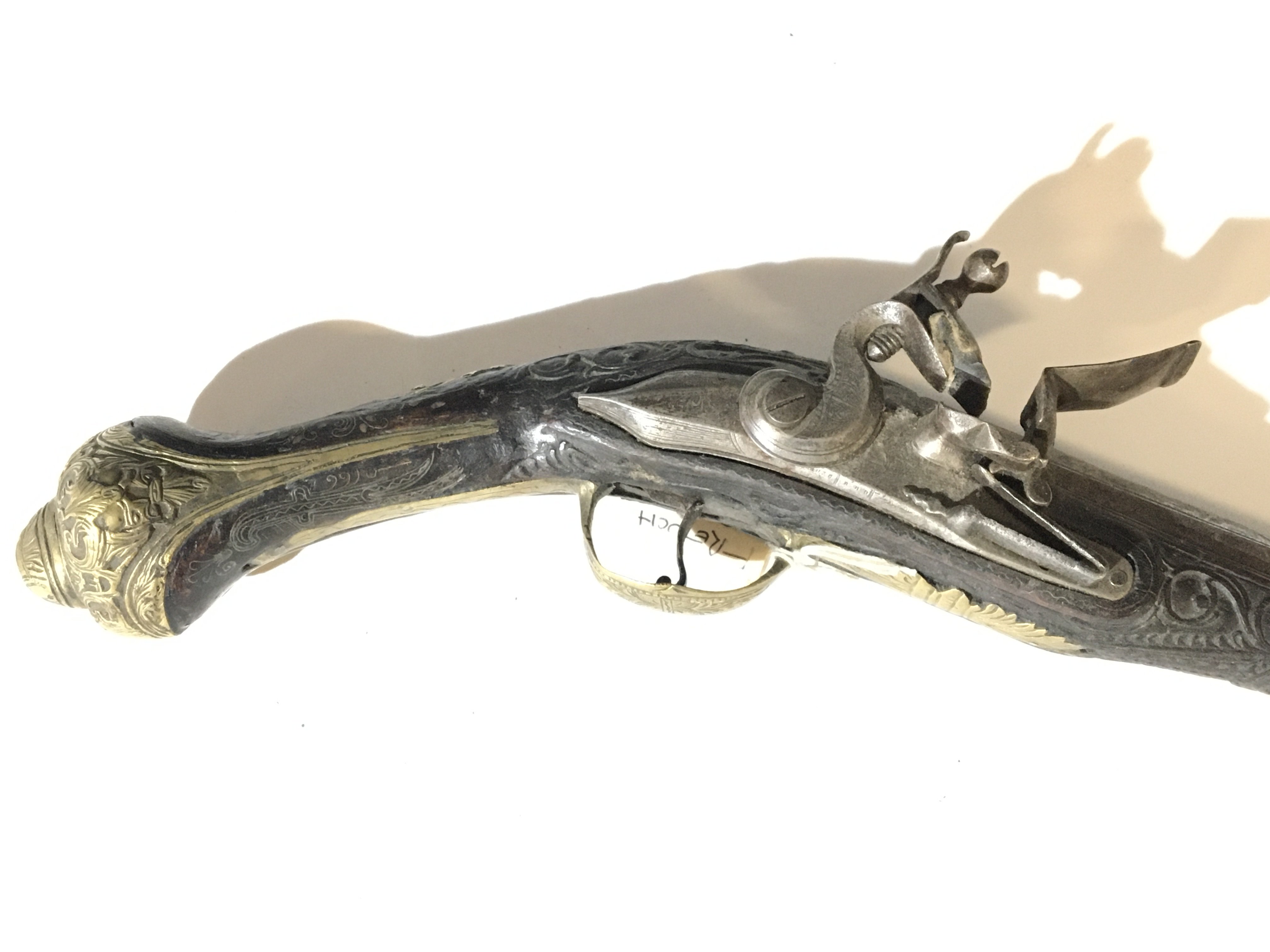 A French or Spanish late 18th century Flintlock pistol with a carved walnut stock and ornate brass mounts steel barrel and and functional action good condition for age.
