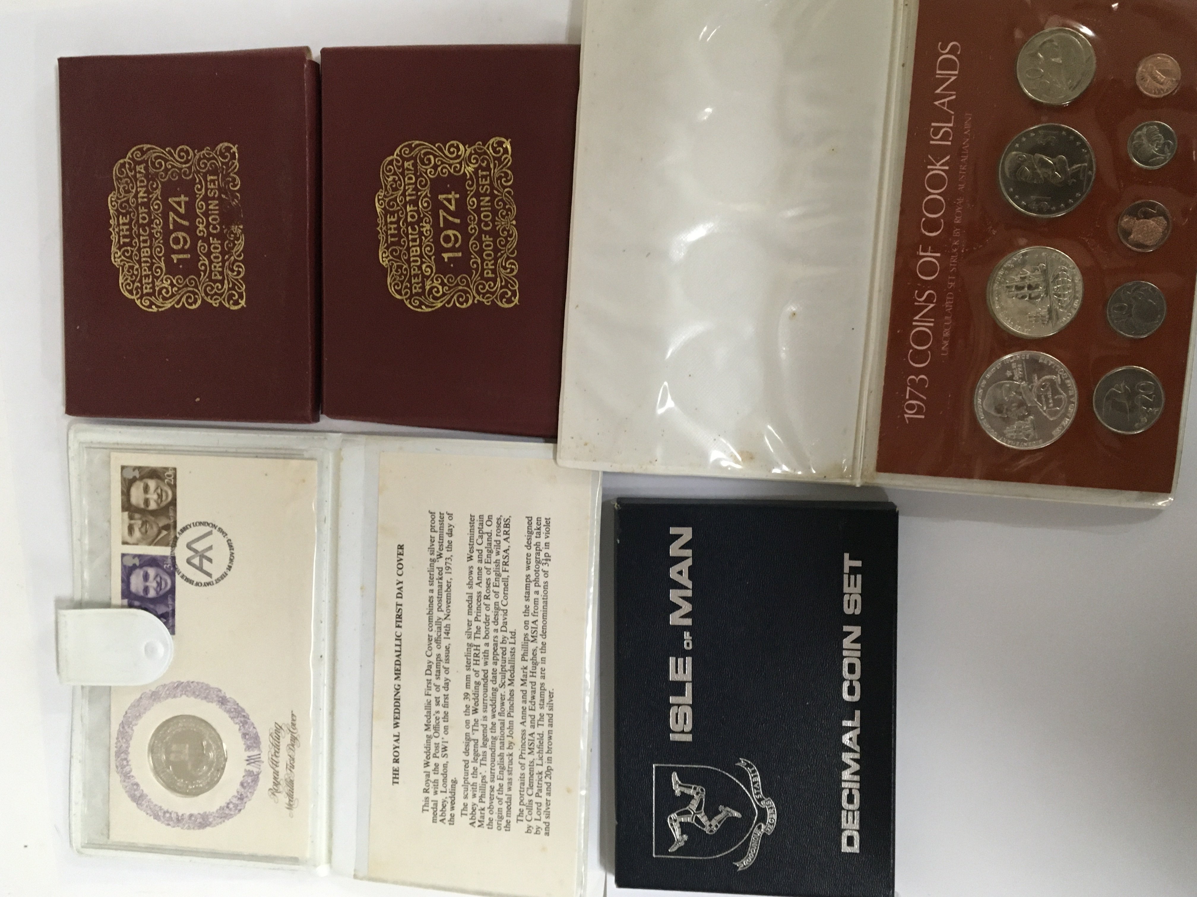 Two 1974 proof con sets The republic of India an Isle of Man Decimal coin set 1973 Cook Islands coin set and Royal wedding silver proof first day cover coin.